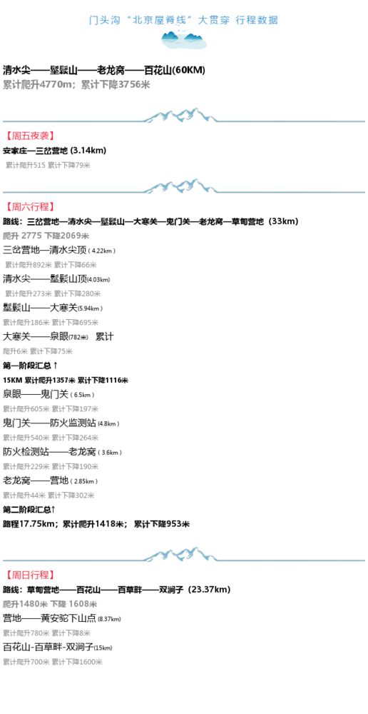 从白昼走到天黑,从大风大雾走到小雨小雪,从八人小队走成4人小组完成最终的大贯穿。实际行走路线:安家庄—清水尖—髽鬏山—桃树崖尖—大寒岭—老龙窝—百花山-莲花庵村全程:62km,实际累计爬升4300米左右周五:2.5km→晚上夜袭走的断崖路线... 展开全部