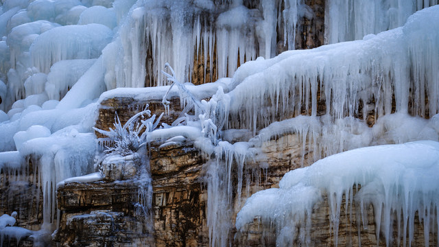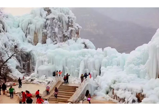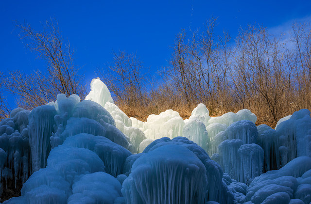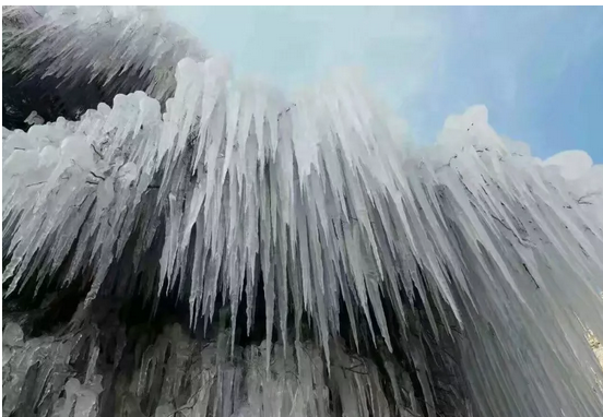 进入寒冬,瀑布逐渐结冰,形成各种形态的冰柱,冰石笋,晶莹的冰花,瑰丽夺目,含露滴流,垂帘而下,一簇簇,一团团,晶莹剔透。在阳光照射下,五光十色。