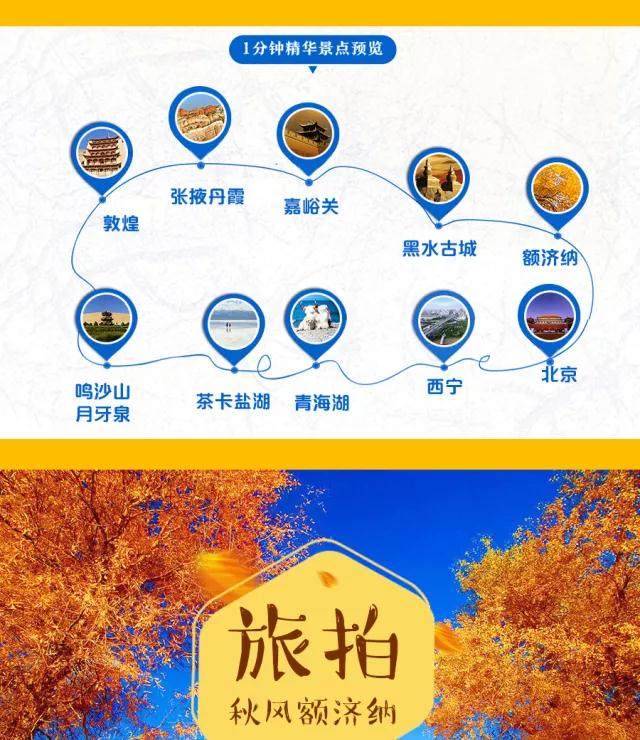 【行程简述】 D1天:9.30号-北京集合出发 ·19:00 地铁2.4.13号线西直门C口集合 ·19:30准时发车,为防止出京堵车望大家不要迟到,出发前3天客服会统一以微信方式发送:车牌号、领队电话等信息,手机请保持通畅。 D2天:10月1日-到达西宁【住西宁】 ·今天我们将与从全国各地赶到西宁的队员汇合,可根据自己的意愿选择交通方式,(领队出发前发宾馆信息地址和电话)早到的同学可以先在【西宁】市区游玩莫家街吃小吃,青海老酸奶,水井巷,大清真寺等,自由活动期间注意安全。 D3天:10月2日 西宁-青海湖-茶卡盐湖-德令哈 ·【住德令哈】经过一夜的休整,让我们怀着饱满的热情出发。 ·第一站到达有着中国最大内陆湖之城的【青海湖】高原碧盆,国家地理杂志推荐世界上最值得旅行的目的地之一,领队会带领大家不走寻常路,走进青海湖边,拍摄一般人看不到的美景,雪山,牦牛,碧湖,油菜花,相印成趣,玩到累,拍到美。 ·完事我们出发前往有着天空之镜之称的【茶卡盐湖】世界是个神奇的造物主,让世界上有着如痴的美景,这里是白色的世界盐的海洋,倒影,红裙,哈哈还是玩到累,晚上到达德令哈酒店美美的休息。 D4天:10月3日 德哈令-鸣沙山月牙泉- 敦煌【住敦煌】 ·早上集合出发-前往【鸣沙山月牙泉】敦煌八景之一这里沙泉共存,万年不枯,这里可以骑骆驼,滑沙,听听田震的“月牙泉”感受这西北荒凉,游览后返回酒店休息,晚上可以敦煌夜市FB,敦煌美食 闷黄面。 ·今天我们行走在俩千年前的丝路上,踩着张骞出使西域的道路我们一路前往,唐代诗人“王之涣”著名的那首春风不度玉门关的“玉门关”回首2000年前玉门关前车水马轮,再看现在的戈壁荒芜,不禁让人唏嘘,这里毗邻新疆死亡之海的罗布泊的边缘地带,古疏勒河河床,等待我们去感受哦。 D5天:10月4日 敦煌--莫高窟【住张掖】 ·早起餐后前往世界闻名的旅游城市【敦煌】这里是古丝绸之路的重要城市,这里有几千年的文化文明交织,这里有世界文化遗产【莫高窟】咱们上午观摩游览莫高窟,各洞窟禁止拍照,我们只看不摸不碰,回来我会考考大家看到了那些著名的壁画,下午赶回张掖入住。 D6天:10月5日 张掖.七彩丹霞-额济纳胡杨林 ·住额济纳】早起餐后出发前往张掖-国家地理杂志评价的一生中必去的旅行目的地的张掖五彩丹霞山,这里是荒芜的寂静的,但是这里却是世界上独一无二,发育最完整的,七彩丹霞地貌群,国际大导演张艺谋都对这里情有独钟“三枪拍案惊奇”就拍摄于此,我们穿行在上亿年行成的地貌间穿行,拍摄震撼的美景,完事集合咱们一路沿着我国著名的东风航天城的路一直前往额济纳,大约晚上到达额济纳,这里不光有世人皆知的胡杨林,这里还有2000年的文化历史,汉代的居延文化,西夏的黑水文化,鬼吹灯里提到的黑水古城我们就可以看到其神秘面纱,黑水古城探秘,晚上怪树林完美日落晚上入住额济纳旗。 D7天:10月6日 额济纳胡杨林深度游 ·本次行程的最最最最精华及其最最最最期待的景点,额济纳大美胡杨林,这里生存这地球上最古老,最顽强,最传奇的物种,胡杨树,它被人们赞美歌颂,生三千年不到,倒叁仟年不朽,额济纳有这世界上胡杨林最集中,面积最大的胡杨林保护区,这里树林最老,树株最大,溺水河流经这里,巴丹吉林沙漠毗邻相伴,我们早上在最佳的拍摄地点,拍摄胡杨林最美日出,十月份金黄的树叶,上午2-8道桥胡杨林里尽情拍摄,姑娘们的漂亮衣服全部拿出来把,午餐后我们集合出发,我们驱车踏上漫漫回家路,一路阿拉善戈壁无人区,火山地貌,沙漠地貌,戈壁地貌尽收眼底,晚上在服务区住车里。 D8天:10月7日 服务区--北京市区 ·早上餐后出发,预计下午20点到达北京西直门地铁口队伍解散,至此结束7天愉快的西北大环线旅行,期待我们下次活动见。 全程正规大巴车,根据人数定车型,以上为计划行程,不排除交通不畅等因素影响行程,领队或会根据实际情况对行程进行调整。