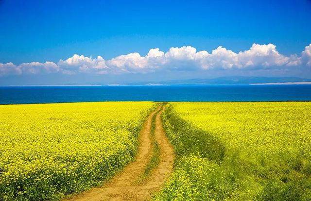 十月初,天气变得凉爽,没有夏天那么炎热,碧蓝纯澈的湖水旁仍旧开满着连绵无际的油菜花,一片金黄灿烂。青海湖中倒映着蓝天白云,大片纯粹的蓝色配着万里油菜花海,美不自胜。