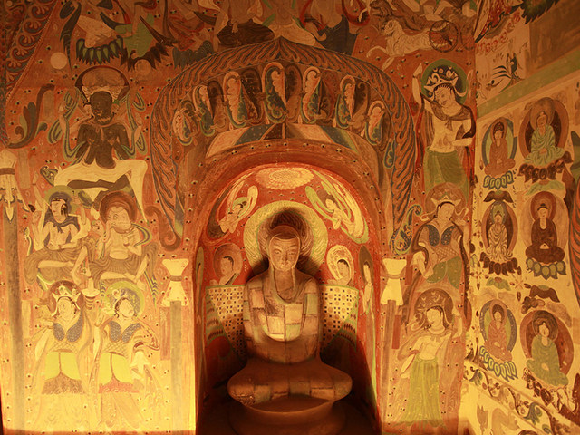 它开凿于鸣沙山东麓的崖壁上,东边就是巍峨的祁连山脉,现存735个洞窟,彩塑492个,壁画上展示了很多佛经中的故事,以及各种山川湖水,亭台楼阁等画面,还有当时人民的日常生活的展现,既有中国传统文化,也融合了许多异域文化。