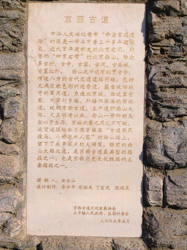 京畿西山,十万年前就有人类活动。门头沟区北接上谷,南通涿易,西望代地,东瞰燕蓟,具有重要的战略和交通地位。从黄帝建都于阿,“披山通道”于西山开始,西山大路诸道,屡经修整,成为颇具规模的官山大道。其中的绝大多数工程是民间组织募化筹资,由当地百姓进行施工的。亘远的古道在门头沟区依依蜿蜒盘旋,日久年深,构成了无与伦比的与大自然相偕的人文奇观。从商旅通行到朝拜神庙,从攻防战守到贸易往来,从古都兴建到民族文化交流,这一切,如果有什么能够跨越时间与空间而连接在一起的?只有这些掩映于山中的古道。