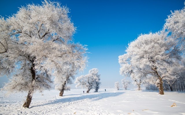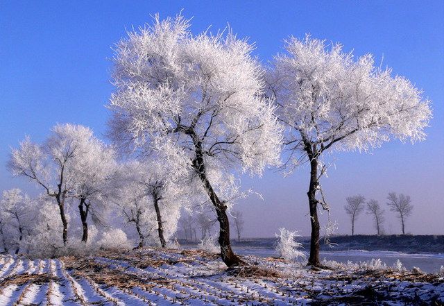 雾凇是雾气和水汽遇冷凝结在枝叶上的冰晶,分为粒状和晶状两种。粒状雾凇结构紧密,形成一粒粒很小的冰块,而晶状雾凇结构比较松散呈较大的片状。