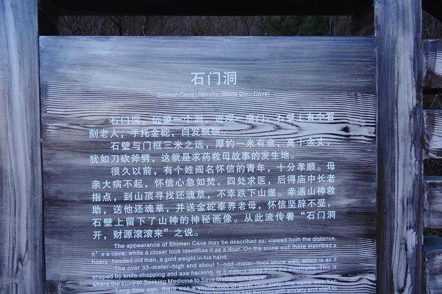 石门洞,远望一个洞,近观一扇门。石壁上有个石刻老人,手托金锭,白发飘飘。
