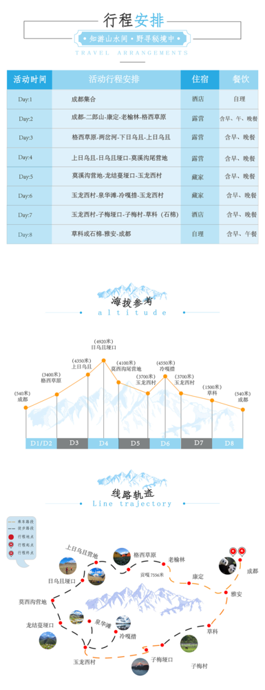 行程安排 D1:成都集合 今日全国各地的队友将来到成都集合,统一入住我俱乐部安排的酒店。如果您的时间比较宽裕,还可以自行安排在成都市区的旅游活动,推荐游览锦里、武侯祠、杜甫草堂、宽窄巷子等景点,品尝成都特色美食,感受天府之国的休闲生活,相信绝对会让大家深深地体会到什么是“休闲之都”啦! 住宿:成都市区酒店(双人标间) 餐饮:全天餐费自理 海拔:成都约540米 D2:成都-雅安-二郎山-泸定-康定-老榆林-电站-格西草原 早餐后在酒店门口集合乘车经成雅高速前往雨城雅安,沿途欣赏川西田园风光。下高速沿318国道一路西行,伴着秀美青衣江途径二郎山隧道、大渡河、泸定桥,康定城,一路行摄,在康定城采购物资后继续前进,从电站开始徒步3km左右抵达格西草原扎营。 住宿:格西草原露营 餐饮:酒店含早,泸定午餐,营地晚餐 需时:约360km,行车7小时左右;徒步3km,约1.5小时 海拔:格西草原约3400米 D3:格西草原-两岔河-下日乌且-上日乌且 早餐后向上日乌且进发。沿途欣赏高原风光,2小时后到达大河坝,河对岸隐约出现大面积红石滩,领队带领大家稍微驻足拍照。一路向南,沿途欣赏田海子雪山(海拔6070米)、小贡嘎(海拔6027米),晚上抵达上日乌且(海拔4350米)扎营。 住宿:上日乌且营地露营 餐饮:营地早餐,午餐(路餐)自理,营地晚餐 需时:约17km、徒步7.5小时左右 海拔:老榆林3200米、下日乌且4100米、上日乌且4350米 D4:上日乌且-日乌且垭口-莫溪沟尾营地(勒多漫因BC) 早餐后拔营出发,开始翻越日乌且垭口,海拔高度上升700米,一路爬升直观感受高山植被的变化。沿途欣赏小贡嘎、嘉子峰、日乌且冰川风光,及其冰川、高山湖泊,运气好的话在垭口附近还可以发现古生物化石。傍晚在莫溪沟尾扎营。体力不支者可在日乌且牧场雇佣马匹骑马上山(仅限夏及秋季)。 住宿:莫溪沟尾营地露营 餐饮:营地早餐,午餐(路餐)自理,营地晚餐 需时:约21km、徒步8小时左右 海拔:上日乌且4350米、日乌且垭口海拔4920米、莫溪沟尾营地4100米 D5:莫溪沟营地(勒多漫因BC)-龙结蔓垭口-玉龙西村(泉华滩) 早餐后莫溪沟营地出发,一路缓坡翻越龙结蔓垭口,垭口处我们能提前观看到贡嘎主峰的雪山群,6 7 8月山坳处野花遍地,与远处的雪山遥相呼应,美不胜收。翻越垭口后一路下缓坡,沟底乘车前往玉龙西村藏家入住。时间尚早即前往泉华滩游玩。 住宿:玉龙西村藏家多人间 餐饮:营地早餐,午餐(路餐)自理,藏家晚餐 需时:约8km、徒步5小时左右 海拔:莫溪沟尾营地4100米、玉龙西村3700米 D6:玉龙西村-冷嘎措-玉龙西村 藏家早餐后前往冷嘎措,需要徒步大概3个小时抵达,体力不好的可以选择骑马上山,冷嘎措被誉为贡嘎山的一滴眼泪,也是拍摄贡嘎群山倒影最佳的地方,傍晚时分日照金山倒影在冷嘎措湖中,水天相接,很庆幸能用眼睛记录下这壮观的美景,根据大家的身体情况,看完日落原路返回。 住宿:玉龙西村藏家多人间 餐饮:营地早餐,午餐(路餐)自理,藏家晚餐 需时:约10km 、徒步5小时左右 海拔:冷嘎措4550米 D7:玉龙西村-子梅垭口-子梅村-草科(或石棉) 从玉龙西村出发,乘车前往子梅垭口观看日出,子梅垭口是拍摄贡嘎山的最佳观景平台,朝拜贡嘎神山后乘车到子梅村开始徒步,抵达巴望海后一路顺着巴望海边沿在山林里漫步俯视巴望海的全貌。休整吃过午饭后,徒步至界碑石,乘车沿田湾河抵达草科,体验草科的天然温泉,晚上入住草科(或石棉)酒店。 住宿:草科或石棉酒店(双人标间) 餐饮:早餐,午餐路餐自理,草科或石棉晚餐 需时:约18km、徒步6小时左右 海拔:下子梅村3400米、草科1500米 D8:草科或石棉-雅安-成都 早餐后出发上雅西高速经雅安返回成都,散团后大家可以自由游览。返回成都的时间约下午3点左右,建议订六点以后的机票返程。 住宿:自理 餐饮:含早、午餐,晚餐自理 需时:约330km、行车5小时左右 海拔:草科1500米、成都540米 【备选行程】 在活动执行过程中,如因天气因素(大雪等)导致日乌且垭口无法通过,行程则调整如下: D1:成都集合 D2:成都-康定-格西草原 D3:格西草原-两岔河-盘盘山营地 D4:盘盘山营地-垭口-玉龙西村 D5:玉龙西村-泉华滩-冷嘎措-玉龙西村 D6:玉龙西村-子梅垭口-贡嘎寺-子梅村 D7:下子梅村-巴王海-草科-石棉 D8:石棉-成都