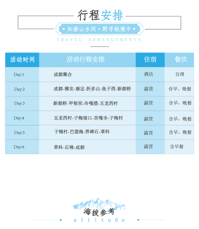D1:全国各地—成都 今日全国各地的队友将来到成都集合,统一入住我俱乐部安排的酒店。如果您的时间比较宽裕,还可以自行安排在成都市区的旅游活动,推荐游览锦里、武侯祠、杜甫草堂、宽窄巷子等景点,品尝成都特色美食,感受天府之国的休闲生活,相信绝对会让大家深深地体会到什么是“休闲之都”啦! 住宿:成都市区酒店(双人标间) 餐饮:全天餐费自理 海拔:成都约540米 D2:成都-雅安-泸定-康定-鱼子西-新都桥 早上酒店大堂集合后出发,沿途欣赏美丽的川西平原风光,远观云雾缭绕,历阴阳两重天后到达大渡河谷(川西最大最深峡谷)。约下午抵达情歌故里,甘孜州州府-康定县城。途中我们沿着大渡河逆流而上沿途欣赏大渡河壮观的景色和山川风光,翻越川西第一关折多山前往鱼子西村,这里是川西又一360度的观景平台,守候贡嘎神山日落后,驱车前往新都桥入住。 住宿:新都桥酒店(双人标间) 餐饮:含早餐、晚餐,午餐自理 需时:全程380km,行车7小时左右 海拔:新都桥约3200米 D3:新都桥-甲根坝-贡嘎山乡-玉龙西村-冷嘎措-玉龙西村 早餐后离开新都桥经沙德乡到玉龙西村,车辆送至路口,我们徒步或骑马(自费)上山,穿行在灌木林的山谷直至垭口,巍峨的贡嘎山就在眼前了,贡嘎群山犹如王者一般俯视着这片大地。再横切一小段就是冷嘎措了,先到湖边,占据最佳摄影点,守候贡嘎山的日落金山和幻化倒影。晚上回到玉龙西村藏民家住宿。 住宿:玉龙西藏家(多人间) 餐饮:含早、晚餐(营地餐),午餐自理 需时:全程120km,行车3小时左右;约10km,徒步6小时左右 海拔:冷嘎措约4500米,玉龙西村约3700米 D4:玉龙西-子梅垭口-子梅村-贡嘎寺-下子梅村 早起乘坐面包车到山顶观日出和贡嘎主峰。天气好的话还能看见佛光,在观赏美景的时候也不要放过脚下,仔细点还有可能发现古生物化石哦。之后轻装徒步至贡嘎寺游览拍摄,下午返回下子梅村。如果早上没有看到贡嘎山下午可以乘当地面包车前往子梅垭口看日落,日照金山(车费自理),晚上可以围坐火炉旁交流分享。 住宿:下子梅村藏家(多人间) 餐饮:含早餐、晚餐(营地餐),午餐路餐自理 需时:玉龙西-子梅村45km,行车2.5小时左右;子梅村- 贡嘎寺约17km,徒步6小时左右 海拔:子梅垭口约4500米,下子梅村约3400米 温馨提示:由于子梅垭口修路有时车辆无法通行,备选路线为玉龙西-龙结曼垭口-贡嘎寺-子梅村 D5:下子梅村-巴望海-公路出口-草科或石棉 早餐后经下子梅村抵达巴望海,途中我们会穿过森林经过大河滩一路观赏美丽的山川风貌。抵达巴望海后一路顺着巴望海边沿在山林里漫步俯视巴望海的全貌。休整摄影后,徒步至公路出口,乘车沿田湾河到草科,在草科泡温泉酒店住宿。运气好的话能遇上当地村民在路边上现烤的草科鸡,那可是当地的一大特色有很多游客都慕名而来。 住宿:草科酒店(双人标间) 餐饮:含早、晚餐(桌餐),午餐路餐自理 需时:约18km,徒步6小时左右 海拔:巴望海约3100米, 草科约1500米 D6:草科或石棉-成都 早餐后出发经雅安返回成都,活动结束。返回成都的时间约下午3点左右,建议订六点以后的机票返程(如遇节假日返程高峰建议预定顺延两小时)。 住宿:自理(俱乐部可代订) 餐饮:含早餐 需时:全程320km,行车5小时左右 海拔:成都约540米
