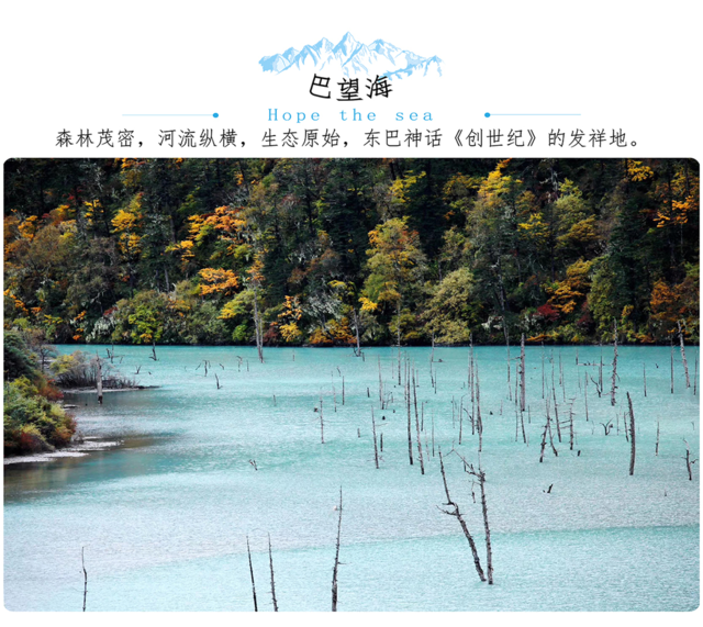 巴旺海:海拔3100米左右,是贡嘎雪山脚下神秘的海子,发源于贡嘎主峰,从冰川上一路而下,巴旺海澄碧的湖水与雪山融为一体,海子中细沙沉积,形成色彩斑斓的河床,仿佛令人置身海滨。海子中还有“湖中长树,树会走路”、“石头说话”、“半壁穴居”等神奇景观,传说这里是东巴神话《创世纪》的发祥地。