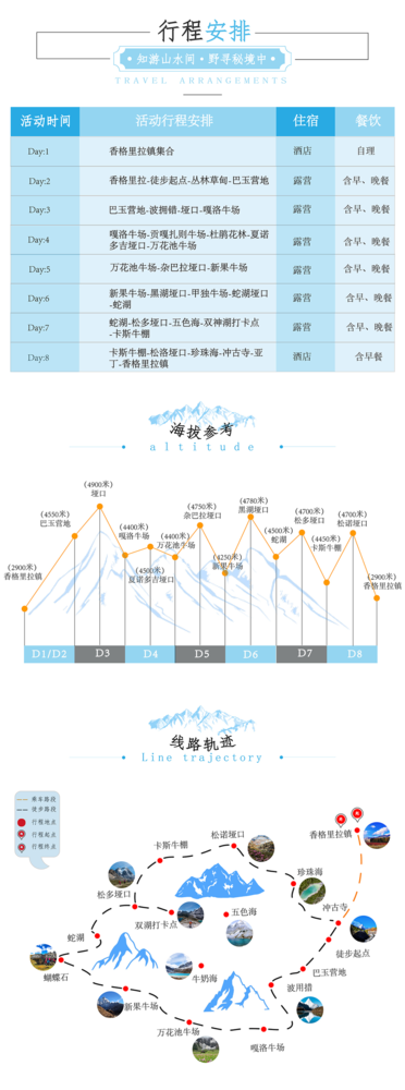 D1:香格里拉集合 本日亮点:行前会议,纸质合同签订, 香格里拉镇指定酒店集合,请保持手机畅通,领队会在当晚联系各位队员,召开行前会议,并签订纸质合同;具体酒店及交通方式将在集合日前5点以短信形式告知。 交通:自理; 餐饮:自理; 住宿:香格里拉酒店标间,海拔2900米; 温馨提示:请注意休息,不要熬夜、不要喝酒和改变日出饮食习惯,避免疾病困扰。 D2:香格里拉镇-徒步起点-丛林草甸-巴玉营地 本日亮点:彩林斑斓、高原溪谷 早晨前往亚丁景区,从冲古寺开始上山,队员跟随领队轻装徒步,记得带上饮水和路餐哦,徒步第一天,行程比较轻松,主要是适应海拔,一路行走在丛林之中,一路与神山相伴,下午到达4550米的巴玉营地露营,这里也是洛克博士曾歇宿的营地。我们将搭建豪华营地帐篷,摆开折叠桌椅,享受高山厨师为我们奉上的美味晚餐,还有饮料和水果供应哦。 徒步:6公里,海拔上升550米; 餐饮:含早餐和营地晚餐,午餐为自备路餐; 露营:巴玉营地,4550 D3:巴玉营地-波拥错-4900垭口-嘎洛牛场 本日亮点:波拥错、三神山倒影、高山牧场 营地早餐后,把自己的水杯装满,开始今天的徒步之旅,今天我们将前往波拥错,这是观赏亚丁三神山的绝佳位置,可以欣赏神山倒影,更可以观赏三座神山同框的壮阔风光。适时离开翻越4900垭口后,我们横切前往错改达湖和娘错观景游玩,两个海子如碧玉般镶嵌其中。下午到达嘎洛牛场宿营。这是当地藏民采药、放牧的宿营地,有几座石屋。 徒步:11公里,上升350米,下降450米; 餐饮:含营地早晚餐,不含午餐; 住宿:嘎洛牛场露营,4400米。 D4:嘎洛牛场-贡嘎扎则牛场-杜鹃花林-夏诺多吉垭口-万花池牛场 本日亮点:夏诺多吉、杜鹃花林、神山日落 早餐后出发,我们将穿越数条山溪河流,来到神山夏诺多吉脚下,观赏鲜为人知的神山东壁的壮美。沿途野花与杜鹃花点缀,而秋季彩林如画。随后我们将在原始丛林中穿越,翻越海拔4500米的夏诺多吉垭口,到达万花池牛场宿营。 徒步:12公里,上升450米,下降650米; 餐饮:含营地早晚餐,不含午餐; 住宿:万花池牛场露营,4400米。 D5:万花池牛场-杂巴拉垭口-新果牛场 本日亮点:夏诺多吉日出、杂巴拉垭口、新果牛场露营、央迈勇日落 本日日出时,有机会欣赏夏诺多吉神山的日照金山,当阳光照亮山峰,仿佛熊熊火炬。本日徒步出发要先上坡,来到杂巴拉垭口下方,一鼓作气翻越海拔4750米的杂巴拉垭口,从夏诺多吉的领地来到央迈勇的南坡,沿着央迈勇山脊的南坡横切,傍晚到达新果牛场,沿途都可以欣赏到壮阔的雪山和峡谷风光,傍晚更有机会欣赏日落时分的央迈勇日照金山。 徒步:13公里,海拔上升750米,下降750米; 餐饮:含早餐和营地晚餐,午餐为自备路餐; 露营:新果牛场,海拔4250米。 D6:新果牛场-黑湖垭口-甲独牛场-蛇湖垭口-蛇湖 本日亮点:央迈勇日出、黑湖、蛇湖、央迈勇日落 有兴趣的朋友可以早起,守候阳光照亮央迈勇神山的卫峰,营地早餐后出发,沿央迈勇长长的西南山脊的山坡横切,这一段以难走的碎石路为主,要胆大心细,注意安全。中午前后翻越4780米的黑湖垭口,遥望如翡翠般的黑湖,我们歇息午餐,随后沿山野小径来到甲独牛场,随后上坡翻越海拔4730米的蛇湖垭口,这里是欣赏碧绿丝带般的蛇湖的绝佳位置,同时有机会看到仙乃日和央迈勇两座神山。我们来到蛇湖湖尾宿营,静候神山日落。 徒步:12公里,海拔累计上升750米,累计下降500米;; 餐饮:含早餐和营地晚餐,午餐为自备路餐; 露营:蛇湖营地,海拔4500米。 D7:蛇湖-松多垭口-五色海-双神湖打卡点-卡斯牛棚 本日亮点:神山日出、三神山、五色海、牛奶海、仙乃日日落 早餐后出发,本日主要欣赏亚丁风光。我们沿蛇湖湖畔而行,翻越海拔4700米的松多垭口,我们就可以俯视到宝石一般的牛奶海以及湖边微小的游人。我们在领队的带领下,来到一个少有人知的打卡点,这里可以同时拍摄五色海和牛奶海两个美丽的圣湖和夏诺多吉、央迈勇双神山的合影。 适时返回松多垭口,徒步来到仙乃日神山后方的卡斯牛棚,守候神山日落。 徒步:12公里,上升500米,下降550米; 餐饮:含营地早餐和晚餐,不含午餐; 住宿:卡斯牛棚露营,4450米。 D8:卡斯牛棚-松洛垭口-珍珠海-冲古寺-亚丁-香格里拉镇 本日亮点:神山日出、仙乃日小转山、珍珠海、冲古寺 早餐后出发,本日的徒步与亚丁小转山路线重合,环绕仙乃日顺时针朝圣,途中可能会偶遇当地转山的藏民。途中翻越海拔4700米的松洛垭口,这里经幡密布,代表着藏民的淳朴心意和对神山的崇敬之情。下午到达珍珠海,从冲古寺乘坐景交车返回香格里拉镇,入住酒店,结束我们本次极限挑战的高原徒步之旅。 徒步:12公里,海拔累计上升240米,下降700米。 餐饮:含早餐,不含午餐和晚餐; 住宿:香格里拉镇酒店,海拔2900米。