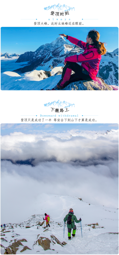 行程安排 D1:成都-都江堰-巴郎山-四姑娘山镇 下午6:30集合出发(节假日早上出发)前往四姑娘山镇,途经都江堰,出城上都汶高速,在5.12汶川地震震中映秀下高速,之后沿303省道,沿卧龙峡谷而上。翻越海拔4532米的熊猫王国-巴朗山,观巴朗山的草甸,领略巴朗山的雄奇自然风光,路过四姑娘山最佳拍摄点之一猫鼻梁,欣赏四姑娘山全景,晚上入住四姑娘。PS:今天行车时间较长,请准时到达集合地点。 餐饮:全天自理 住宿:四姑娘山客栈 海拔:四姑娘山约3200M 注意事项: 1. 今日抵达四姑娘山镇可能时间较晚,请提前安排自己的晚餐,中途除上厕所基本不做停留;部分个人装备镇上有售卖或租赁点,具体可咨询领队。 2. 由于山区气候,巴朗山夜间容易起雾,造成行车安全受到威胁,请大家准守出发时间! D2:日隆-锅庄坪-打尖包-大峰大本营 用过早餐后,打包整理个人装备,在清点上马后出发,今天的徒步时间长,强度较大,(建议佩戴护膝使用登山杖)开始我们的徒步,路程在16公里左右,大约在下午5点左右到达大峰大本营,安营扎寨,统一吃完营地餐之后提早入睡。 餐饮:早餐-含 午餐-路餐自理 营地晚餐-含 住宿:大峰大本营露营 海拔:大本营海拔4200M 注意事项: 今日路程不长,但是海拔爬升较高,途中有一个小卖部可以补充水和泡面等物资。请合理安排好自己的体力,控制好自己的行进速度,预留好第二天冲顶的体力,如需要骑马请提前联系向导。 D3:大峰营地-大峰登顶-大峰营地-四姑娘山镇-成都 凌晨4:00起床,吃完早餐后4:30准时出发(根据季节不同出发时间可能有调整,具体根据领队安排为准),往返大峰顶大约需要6小时左右,在大峰营地自由吃完午餐后下撤到四姑娘山镇,在四姑娘山镇稍作休息之后出发回到成都,大家可以在成都自由约饭,庆祝登顶的喜悦,分享过程中的辛酸得失。 餐饮:早餐-含 午餐(路餐)-敬请自理 晚餐-自理 住宿:自理 海拔:成都约540M 下撤备用线路:大峰营地-打尖包-海子沟-海子沟桥头公路,此线路下撤节约2小时左右,不走回头路,具体根据实际情况安排。 注意事项:四姑娘山海子沟属于国家重点核心保护区,没有开发,保持原生态,故大本营无电无公路(大本营石头房子住宿为通铺,无法提供洗脸、洗脚)。