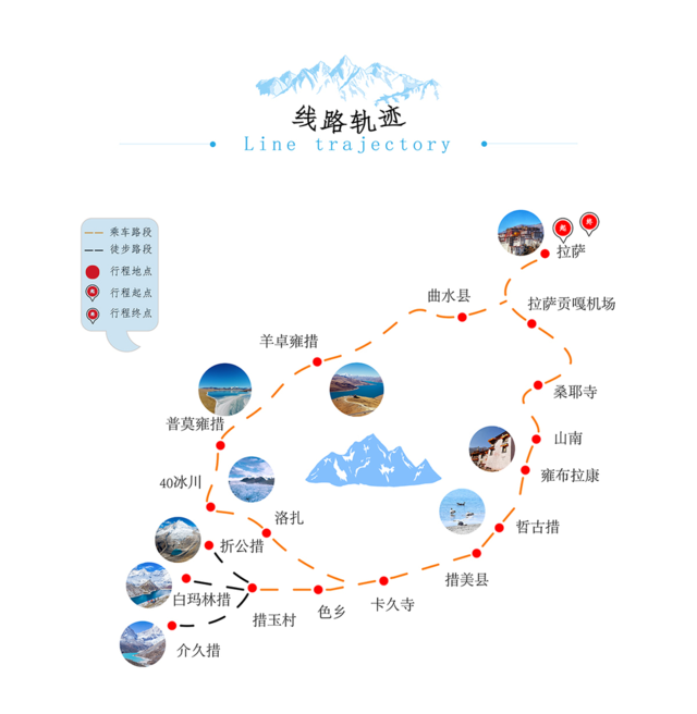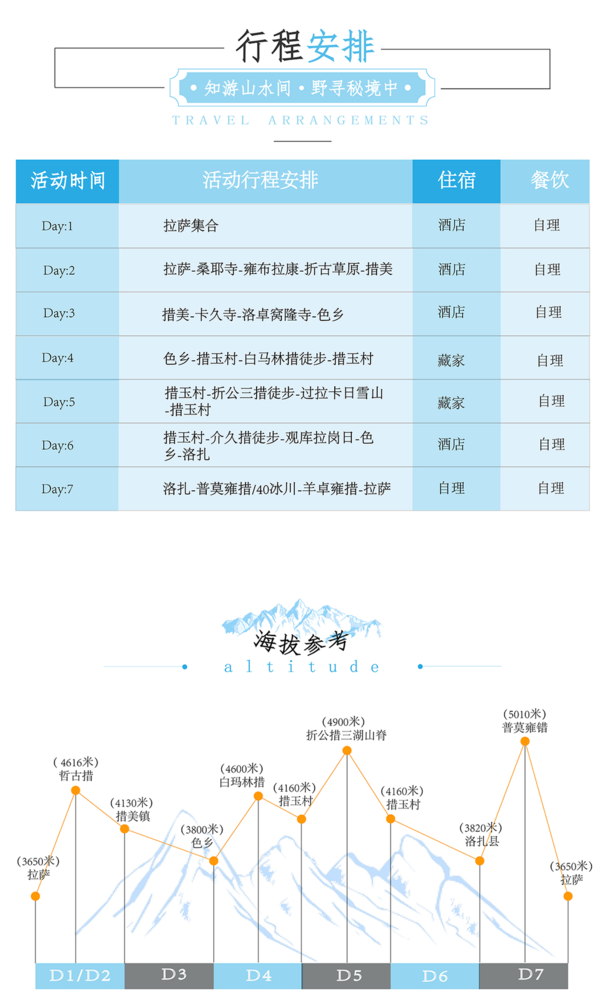 行程安排 D1 :全国各地-拉萨集合 今天是集合日,领队会在圣城拉萨等待各位队员的到来。队员自行根据情况安排大交通到达拉萨,火车站距市区十公里,贡嘎机场距拉萨市区65公里。入住集合酒店后自行活动,当天尽量少运动,多休息,不饮酒。晚上20:30集合,开行程说明会,由领队讲解本次活动注意事项,相互认识,为后面的行程做准备。 用餐:用餐自理,晚上行程说明会 住宿:拉萨酒店或民居客栈标间 PS:注意不要剧烈运动,当天请尽量不要洗澡,可多吃蔬菜、水果、多喝水,不能饮酒。良好的心理素质是克服和战胜高原反应的灵丹妙药。保持豁达乐观的情绪,能够减弱高原反应带来的身体不适。一般过1-2天后,以上症状都会逐步减轻或消失。强烈建议,时间允许的情况下,可以提前一两天到达拉萨适应。特别需要注意的是,高反一般是在踏上高原后3-4小时左右开始出现,所以刚到拉萨时如果没有高反症状也切勿窃喜。 D2:拉萨-桑耶寺-雍布拉康-折古草原-措美 早餐后出发(8:00),沿着拉萨河一路到达贡嘎县,2小时候来到雅鲁藏布江河谷的桑耶寺,该寺院始建于公元8世纪,有接近1300多年历史,兼藏族、汉族、印度三种风格,是国家级重点文物保护单位,在此参观1小时候后出发到山南市区午餐,下午到雍布拉康拍摄之后,一路高山草甸地貌到达哲古草原,这里有藏野驴、藏原羚等野生动物,也可以回望打拉日等雪山群,之后抵达哲古错,湖水虽然并不惊艳,但胜在有诸多的鸟类-赤麻鸭、斑头雁等,还有著名的神山-雅拉香波。到达措美镇入住酒店(海拔4130m)。 用餐:三餐自理AA 住宿:措美县酒店 D3:措美-卡久寺-赛卡古托寺-色乡 早餐后出发,沿着新219国道一路盘旋缓行,上鲜有游客,地貌景观丰富,变化多端,从干热河谷到茂密森林再到丹霞土林,高耸的雪山、险峻的河谷,到达拉康镇卡久寺参观,卡久寺是莲花生大师五大隐修圣地之一,主供佛为朗开宁布,隶属宁玛派,是历代努氏朗开宁布活佛学习佛教经典、研修藏传佛教密宗教义、潜心修行的祖寺,这里不仅是佛教圣地,也有着诸多野生动物,如尼泊尔国鸟-棕尾虹雉,斑羚、藏雪稚等等。游览后继续前行,路上可以看到打拉日等诸多雪山,还有色彩斑斓的丹霞地貌。在拉康午餐后,出发前往色乡,参观著名的赛卡古托寺,这是著名的佛教大师米拉日巴奉师名(玛尔巴大师)而建,意为“为公子而建的九层碉堡”,而最为著名的就属寺中九层公子塔了,上面有一条最为惊险的转经道,当然能否转上全凭佛缘了,晚上入住色乡镇酒店。 用餐:三餐自理AA 住宿:酒店标间(标间) 温馨提示:色乡海拔3800米,今天还是适应为主,相信经过今天后即使高反也会好很多。 D4:色乡-措玉村-白马林错-措玉村 早上早餐后,乘车前往措玉村(4160米)。卸完东西直接到徒步起点——白马林措停车场(4500米),开始我们的库拉岗日雪山徒步之旅。今天的徒步比较简单,沿着白马林措右侧一直前行到湖的尽头白马林寺,探访莲花生大师的修行地,眺望卡热疆雪山,之后返回白马林措营地。白马林措湖颜色因深浅不同与其周边的景色融汇后呈现出蓝、绿、白三种颜色 。据说,信徒们可以从这湖底窥见自己的今生来世。 用餐:三餐自理(午餐需带干粮) 住宿:措玉村藏家(多人间) PS:徒步约10公里,海拔上升200米,下降200米,来回6小时。 D5:措玉村-过拉卡日-折公措三湖-措玉村 今早吃完早餐出发,沿着白马林错右侧山谷而上,一路爬升前往过拉卡日下面的三个圣湖,我们要从4500爬升到4900的海拔,站在高处,三神湖和雄伟的过拉卡日就在我们的面前,雄伟壮丽,这也是我们本次行程的亮点,之后返回措玉村。今天爬坡为主,海拔较高,个人量力而行,能走多远是多远,随时可下撤,随处是风景。为安全起见,下午两点之后必须返程。 用餐:三餐自理(午餐需带干粮) 住宿:措玉村藏家(多人间) ps:今日徒步约11公里,7小时左右,由于海拔高,大家量力而行即可,如果感到不支,可在原地休息欣赏风景,也可先行返回到停车场。 D6:措玉-介久错-观库拉岗日-色乡-洛扎 今早吃完早餐乘车出发到达白玛林停车场,沿着山坡爬到山脊处,即可到达一个观景台,美丽的圣湖介久错就在你的眼前,天气好的话巨大的库拉岗日和卡日疆雪山展现在你的面前。体力好的可以往高处走走。之后返回停车场,乘车前往色乡,好好洗个澡。今天的摄影点比较多,队员的状态也会比前两天好,大家要合理分配时间,尽可能多走路多拍照,下午四点左右乘车出发前往洛扎县城入住酒店。 用餐:三餐自理(午餐需带干粮) 住宿:洛扎县酒店(标间) ps:今日徒步约10公里,6小时左右 D7:洛扎-普莫雍措/40冰川-羊卓雍措-拉萨 早餐后出发(7:30),沿着洛扎河谷一路上升,翻阅5363米蒙达拉山垭口,在这里回望库拉岗日雪山群之后,到达普莫雍措岸边。若政策允许,则前往40冰川游玩,之后经羊湖返回拉萨,若不能进40冰川,则环普莫雍措游玩。夏天这里是一片绿蓝,堪比贝加尔湖,冬季则是厚厚的蓝冰覆盖,在此打卡游玩后前往西藏三大圣湖之一的羊卓雍错,开车沿着湖边前行,翻越冈巴拉山口,大约下午7点左右回到拉萨,本次活动结束。 用餐:三餐自理(午餐需带干粮) 住宿:行程结束 温馨提示:如果时间允许,建议返回拉萨休息一晚再返程,次日上午航班则可预定贡嘎机场附近酒店,返程可以直接送至机场。