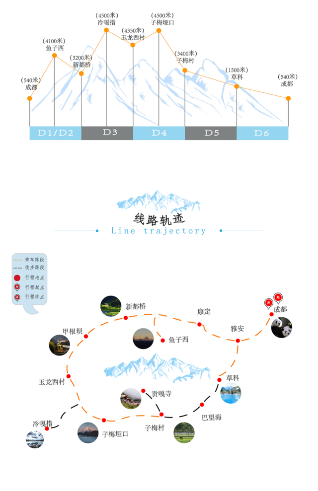 行程安排 冷嘎措:贡嘎山下的一个高山湖泊,目前还少有人涉足,拍摄贡嘎山倒影最佳。 贡嘎寺:位于贡嘎山主峰脚下,始建于公元十三世纪,由第一代贡嘎活佛所建,为历代贡嘎活佛修行闭关之地;贡嘎寺是藏传佛教噶玛噶举派(白教)的三大圣地之一,是藏密五大金刚之一胜乐金刚的道场。 巴旺海:海拔3100米左右,是贡嘎雪山脚下神秘的海子,发源于贡嘎主峰,从冰川上一路而下,巴旺海澄碧的湖水与雪山融为一体,海子中细沙沉积,形成色彩斑斓的河床,仿佛令人置身海滨。海子中还有“湖中长树,树会走路”、“石头说话”、“半壁穴居”等神奇景观,传说这里是东巴神话《创世纪》的发祥地。 贡嘎山:又称贡噶山,原名木雅贡嘎,意为“白色冰山”, 但也有译为“至高无上”,这座山就是至高无上的。主峰海拔7556米,被誉为“蜀山之王”,是四川省内第一高峰。 鱼子西:观赏雪山、星空、日照金山的小众秘境,海拔4200米,被贡嘎群山、四姑娘山、雅拉神山、青绕神山环绕,又一360度的观景平台。 【2021年活动排期】 全年组队23期,欢迎独立定制 第01期:2021年04月30号集合--05月05号 五一节 第02期:2021年05月14号集合--05月19号 第03期:2021年05月28号集合--06月02号 第04期:2021年06月11号集合--06月16号 端午节 第05期:2021年06月25号集合--06月30号 第06期:2021年07月09号集合--07月14号 第07期:2021年07月23号集合--07月28号 第08期:2021年08月06号集合--08月11号 第09期:2021年08月20号集合--08月25号 第10期:2021年09月03号集合--09月08号 第11期:2021年09月18号集合--09月23号 中秋节 第12期:2021年09月30号集合--10月05号 国庆节 第13期:2021年10月01号集合--10月06号 国庆节 第14期:2021年10月02号集合--10月07号 国庆节 第15期:2021年10月10号集合--10月15号 第16期:2021年10月15号集合--10月20号 第17期:2021年10月22号集合--10月27号 第18期:2021年10月29号集合--11月03号 第19期:2021年11月12号集合--11月17号 第20期:2021年11月19号集合--11月24号 第21期:2021年12月03号集合--12月08号 第22期:2021年12月17号集合--12月22号 第23期:2021年12月31号集合--01月05号 全年执行基础价:2780元/人,国庆黄金周执行价:3180元/人 D1:全国各地—成都 今日全国各地的队友将来到成都集合,统一入住我俱乐部安排的酒店。如果您的时间比较宽裕,还可以自行安排在成都市区的旅游活动,推荐游览锦里、武侯祠、杜甫草堂、宽窄巷子等景点,品尝成都特色美食,感受天府之国的休闲生活,相信绝对会让大家深深地体会到什么是“休闲之都”啦! 住宿:成都市区酒店(双人标间) 餐饮:全天餐费自理 海拔:成都约540米 D2:成都-雅安-泸定-康定-鱼子西-新都桥 早上酒店大堂集合后出发,沿途欣赏美丽的川西平原风光,远观云雾缭绕,历阴阳两重天后到达大渡河谷(川西最大最深峡谷)。约下午抵达情歌故里,甘孜州州府-康定县城。途中我们沿着大渡河逆流而上沿途欣赏大渡河壮观的景色和山川风光,翻越川西第一关折多山前往鱼子西村,这里是川西又一360度的观景平台,守候贡嘎神山日落后,驱车前往新都桥入住。 住宿:新都桥酒店(双人标间) 餐饮:含早餐、晚餐,午餐自理 需时:全程380km,行车7小时左右 海拔:新都桥约3200米 D3:新都桥-甲根坝-贡嘎山乡-玉龙西村-冷嘎措-玉龙西村 早餐后离开新都桥经沙德乡到玉龙西村,车辆送至路口,我们徒步或骑马(自费)上山,穿行在灌木林的山谷直至垭口,巍峨的贡嘎山就在眼前了,贡嘎群山犹如王者一般俯视着这片大地。再横切一小段就是冷嘎措了,先到湖边,占据最佳摄影点,守候贡嘎山的日落金山和幻化倒影。晚上回到玉龙西村藏民家住宿。 住宿:玉龙西藏家(多人间) 餐饮:含早、晚餐(营地餐),午餐自理 需时:全程120km,行车3小时左右;约10km,徒步6小时左右 海拔:冷嘎措约4500米,玉龙西村约3700米 D4:玉龙西-子梅垭口-子梅村-贡嘎寺-下子梅村 早起乘坐面包车到山顶观日出和贡嘎主峰。天气好的话还能看见佛光,在观赏美景的时候也不要放过脚下,仔细点还有可能发现古生物化石哦。之后轻装徒步至贡嘎寺游览拍摄,下午返回下子梅村。如果早上没有看到贡嘎山下午可以乘当地面包车前往子梅垭口看日落,日照金山(车费自理),晚上可以围坐火炉旁交流分享。 住宿:下子梅村藏家(多人间) 餐饮:含早餐、晚餐(营地餐),午餐路餐自理 需时:玉龙西-子梅村45km,行车2.5小时左右;子梅村- 贡嘎寺约17km,徒步6小时左右 海拔:子梅垭口约4500米,下子梅村约3400米 温馨提示:由于子梅垭口修路有时车辆无法通行,备选路线为玉龙西-龙结曼垭口-贡嘎寺-子梅村 D5:下子梅村-巴望海-公路出口-草科或石棉 早餐后经下子梅村抵达巴望海,途中我们会穿过森林经过大河滩一路观赏美丽的山川风貌。抵达巴望海后一路顺着巴望海边沿在山林里漫步俯视巴望海的全貌。休整摄影后,徒步至公路出口,乘车沿田湾河到草科,在草科泡温泉酒店住宿。运气好的话能遇上当地村民在路边上现烤的草科鸡,那可是当地的一大特色有很多游客都慕名而来。 住宿:草科酒店(双人标间) 餐饮:含早、晚餐(桌餐),午餐路餐自理 需时:约18km,徒步6小时左右 海拔:巴望海约3100米, 草科约1500米 D6:草科或石棉-成都 早餐后出发经雅安返回成都,活动结束。返回成都的时间约下午3点左右,建议订六点以后的机票返程(如遇节假日返程高峰建议预定顺延两小时)。 住宿:自理(俱乐部可代订) 餐饮:含早餐 需时:全程320km,行车5