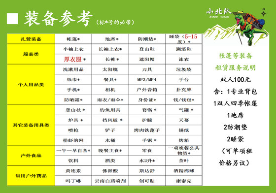 第一、由于属峡谷露营,如天气预报周六、日两天有连续三小时降小雨或中雨以上,活动自行取消或改其它休闲活动。 第二、本活动为AA自由结伴出游 第三、因为是自驾出游,请各位司机,提前保养好车辆,谨慎驾驶,确保同车人员一路平安。如出现状况,自行解决。 第四、注意自然环境的保护,只留下脚迹,带走照片。 第五、本活动无特珠情况肯定成行,大家放心报名。 第六、装备不全的需要租赁请电话联系我。 第七、本次活动手台频率425.425 第八、领队最迟等到十点开始进山,过时不候。请没去过的朋友一定早到。