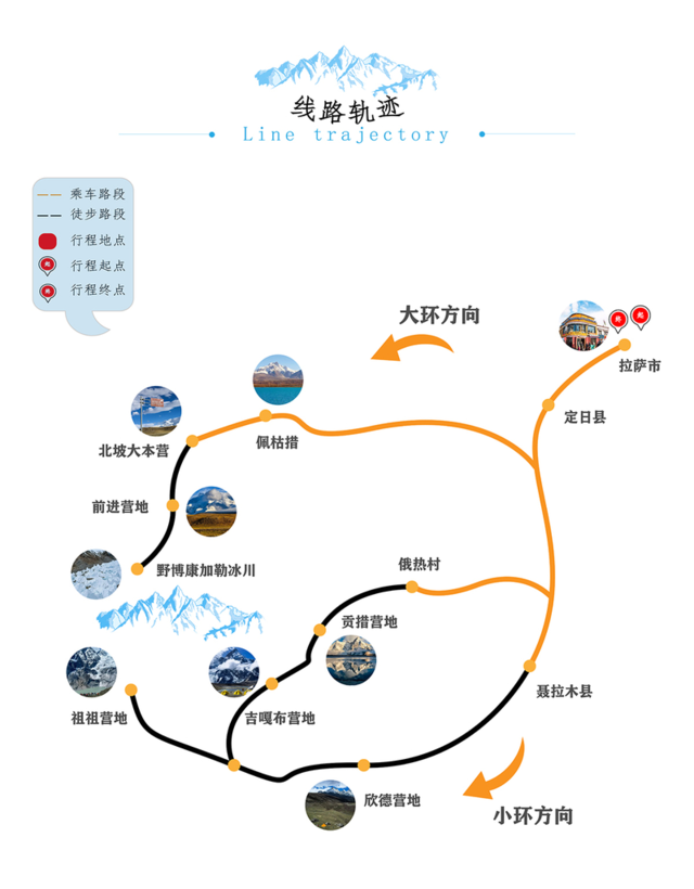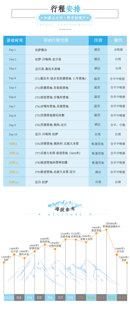 【线路介绍】 希夏邦马峰(Shishapangma),海拔8027米,位列全球8000级山峰的第14位,也是喜马拉雅山脉著名的高峰之一,位于中国西藏聂拉木县境内,也是唯一一座完全坐落于中国境内的8000米级山峰。希夏邦马环线徒步,可以从多个角度欣赏这座8000米巨峰以及它众多卫峰及雪山脚下明珠般的高山湖泊,更有机会置身于冰塔林的童话世界之中。 本次活动将用6天时间行走在海拔4000米以上,在5个晚上面对雪山而卧,从3个角度仰望希夏邦马峰群,从希夏邦马南坡河谷一路深入,之后转战希夏邦马东坡,绕着希夏邦马转一圈,处处是亮眼的雪山盛宴。 【线路亮点】 1、本次活动将用6天时间行走在海拔4000米以上,在5个晚上面对雪山而卧,从3个角度仰望希夏邦马峰群,从希夏邦马南坡河谷一路深入,之后转战希夏邦马东坡,绕着希夏邦马转一圈,处处是亮眼的雪山盛宴。 2、从多个角度欣赏这座8000米巨峰以及它众多卫峰及雪山脚下明珠般的高山湖泊,更有机会置身于冰塔林的童话世界之中。 3、俱乐部自营产品,品质保障。 4、营地专人收搭个人帐篷,坐享营地生活。 5、本次活动由专业户外领队+当地藏族向导全程服务(向导比例1:3)。 6、本线路统一提供露营高山帐(2人一顶)+蛋巢防潮垫+地席。提供卫星电话、急救包、急救钢瓶氧气等公用装备。 7、全程提供桌椅板凳,以及餐厅帐和炊事帐篷。 8、全程轻装徒步、无需负重,提供早晚丰富营地餐+营地水果、饮料,吃饱才有力气徒步。 9、全程提供户外电源,晚上提供手机,相机,无人机充电。 【希夏邦马徒步两种走法】 1、拉萨往返,希夏邦马小环线10天:以南坡和东坡两个营地为串联,徒步总里程在80公里左右。因地理位置关系徒步以开阔平坦地为主,但山峰与人的距离在10km以内,接近感和暴露感强烈。尤其在深入南坡大本营的道路上,几乎是三面雪山盘绕,彻底是一场雪山盛宴;并且在贡措营地近距离的观赏希峰群山,从视觉体验上是其他道路无法比拟的; 2、拉萨往返,希夏邦马大环线13天:大环线是在小环线基础上,增加前往希峰北坡大本营的行程,相当于从三个角度围绕希峰徒步,可从各个角度欣赏到8000级、7000米级的雪山群,算的上是中国目前最顶级的徒步路线之一。 行程安排 D1:拉萨集合 今天是集合日,队员自行到达拉萨后,入住集合酒店。其余时间可自行前往八廓街、大昭寺闲逛(请随身携带身份证)。晚上18:30领队会召集队员聚餐,开行前说明会。海拔4500米以上的青藏高原(拉萨海拔为3658米),不少人都有轻微的高原反应。此时最重要的是好好休息,不建议大家安排过多的活动。高反的症状因人而异,头痛、头晕、恶心等反应是正常的高反症状,无需过分担心。 海拔数据:拉萨3650米 住宿安排:拉萨市区酒店 用餐安排:晚餐包含,其他自理 D2: 拉萨-日喀则-定日 早上7:30早餐,8点准时出发。四个半小时到达日喀则午餐。之后继续前往定日,预计下午六点左右达到定日酒店。今天主要是赶路和适应海拔,下午经过5200米海拔的加错拉山口,运气好这里可以看见卓奥友峰和珠峰,下坡后到达白坝镇休整。 海拔数据:定日海拔4400米 住宿安排:定日酒店标间 用餐安排:AA自理 D3:定日-聂拉木县城 早上9点左右早饭,乘车出发,经过鲁鲁边防检查站(出发前准备好身份证和边防证),一个多小时到达老定日(岗嘎镇),这里天气好的情况可以看到卓奥友峰和右侧的拉布吉康群山,一个半小时抵达通拉山口,这里是观望希峰和拉布吉康群山的绝佳位置,不赶路的情况下可以在公路拍照,垭口稍作停留之后下山前往聂拉木县,到达聂拉木之前还有两个边防检查站,需要准备身份证和边防证。下午到达聂拉木后入住宾馆,下午队员自由活动。 海拔数据:聂拉木海拔3800米 住宿安排:聂拉木酒店标间 用餐安排:AA自理 D4:(T1)聂拉木-徒步至欣德营地(1号营地) 在聂拉木早餐后,驱车前往徒步地点,领队及向导安排牦牛马匹,队员整理好装备、合影之后出发。第一天整体为上坡路,上升700m;中午前先经过铁桥(这里需向导指导通过),随后是稍陡的上坡路段,缓上抵达营地。路程相对稍长,需调整好节奏为后面更高海拔做好适应。 海拔数据:欣德营地4620m,徒步9KM,爬升700m,约6-7小时 住宿安排:帐篷露营 用餐安排:早餐营地餐,午餐含路餐,晚餐营地餐 D5:(T2)欣德营地-至祖祖营地 今天早上早起可以看周围群山的日出,八点半早饭后,所有队员前往嘉龙措观景台,这里是观望嘉龙措和冷布岗东峰的绝佳位置,然后一直沿山脊前行,整个山谷尽收眼底,这里也是拍大片的好地方。祖祖营地并不远,但是这里是看雪山的绝佳位置,离雪山直线距离只有不到2公里。 说明:以往的行程今天是去南坡大本营营地,但实际上结南坡大本营地处山沟里,视野狭窄,海拔较高,一般队员都会有高反,并且风景一般。所以营地调整在祖祖,这里的好处是风光好,一样能看到希峰,而且海拔低。如果有想前往南坡大本营,请提前跟领队协商(单独前往南坡需要分队,分领队和牦牛等等,可能会增加成本)。 海拔数据:海拔4950m,徒步5KM,爬升350m,约5小时 住宿安排:帐篷露营 用餐安排:早餐营地餐,午餐含路餐,晚餐营地餐 D6:(T3)祖祖营地-吉嘎布营地 今天的行程也比较轻松,早上可以在营地多拍照,观赏完雪山之后,再慢慢下降到吉嘎布营地2号营地扎营。今天主要是以下坡为主。 海拔数据:海拔4700m,徒步5.5KM,下降300m,约5小时 住宿安排:帐篷露营 