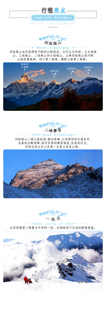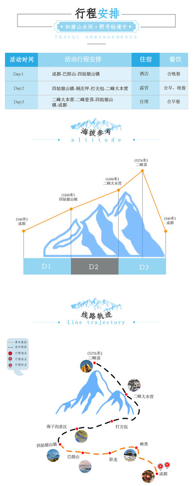 【线路亮点】 1、四姑娘山二峰山型俊俏,酷似珠峰.以其便利的交通条件,完善的后勤保障,相对容易的攀登难度,优美的风光,同样也是众多山友第一次登山首选山峰。 2、到四姑娘山不仅能欣赏四姑娘山、长坪沟、海子沟风光、藏区风情,更能尝试初级雪山攀登,与雪山亲密接触,体验站在雪山之颠的豪迈,二峰绝对是不二选择; 3、当地高山向导协作,冲顶比例1:2,提升登顶率! 4、丰富的营地餐,吃饱了才有力气徒步;全程雇马帮托运大包,轻装徒步,不负重才能玩的更嗨; 5、天天发团!根据您的假期,自由安排出发时间! 6、提供登山杖、简易冰爪等装备,轻装简行。 行程安排 【行程安排】 D1:成都-映秀-卧龙-四姑娘山镇(全程约230KM,乘车约3.5H) 根据客服通知准时集合,出发前往四姑娘山镇,途经都汶高速,在5.12汶川地震震中映秀下高速,之后沿303省道,抵达国家大熊猫保护繁殖基地,沿卧龙峡谷而上。穿越巴郎山公路隧道,抵达四姑娘山镇,晚上入住四姑娘山镇。 住宿:四姑娘山藏式客栈 餐食:自理 海拔:四姑娘山镇约3150米 温馨提示: 1.集合地点一般为成都地铁迎宾大道A口/百草路A口集合,因实际情况有可能会改变集合地址,如需要改变,领队会提前通知。 2.集合时间(平时大概是下午2-4点集合出发;节假日发团版活动,集合时间一般为早上07:00-08:30)具体出发时间以领队电话通知为准。 3.当日出发时间较晚抵达四姑娘山镇可能会天黑,存在夜晚乘车的情况,请提前安排好自己的饮用水和晚餐,乘车途中除了上卫生间基本不做停留。 4.出发当日海拔爬升较大,请提前备好厚衣物,注意海拔带来的温差,不要受凉。 5.四姑娘山镇有户外装备的出租与售卖,装备不全的伙伴可以前往采购与租赁。 6.注:当人数未满3人时,则选择拼车前往,集合地点和时间均略有变化,具体以领队通知为准。 D2:四姑娘山镇-锅庄坪-朝山坪-打尖包-二峰大本营(全程约16KM,徒步约7H) 早餐后在景区户外活动中心办完手续出发(带好身份证),今天进入海子沟,从四姑娘山镇一路攀升至锅庄坪,沿途观四姑娘山全景。进入沟内多以高山草甸为主,夹杂部分灌木丛林,植被覆盖极高,一路风景宜人。沿沟直上,经打尖包午餐,下午继续爬升,傍晚抵达大本营,这段路需要一定的体力,建议体力较差的队员提前联系马匹,以便保存体力登顶(骑马费用自理)。 住宿:大本营石头房子【需准备睡袋】 餐食:含早、晚餐,午餐自理(营地晚餐为2荤2素搭配,4菜一汤,人少微调) 海拔:大峰大本营约4300米 注意事项: 今日路程不长,但是海拔爬升较高,途中有一个小卖部可以补充水和泡面等物资。请合理安排好自己的体力,控制好自己的行进速度,预留好第二天冲顶的体力,如需要骑马请提前联系向导。 D3:二峰营地-二峰顶-二峰营地-四姑娘山镇-成都(全程约30KM,徒步约10H) 今日凌晨03:00起床,准备好冲顶的装备,吃完早餐后03:00点左右出发(夏季可能会早点出发,冲顶之后可以看日出),营地往返二峰顶大约需要6-7小时左右,登顶后拍照留念,欣赏壮阔无比的云海、日出、佛光。然后安全下撤到到营地收拾整理背包,整理完毕后将背包交给向导,集合出发。今日下山原路返回到海子沟景区大门检票处集合,人员集合完毕后乘车返回成都,大家可以在成都自由约饭,庆祝登顶的喜悦,分享过程中的辛酸得失。 住宿:自己家 餐食:含早餐,午、晚餐自理 海拔:成都约540米 注意事项: 四姑娘山海子沟属于国家重点核心保护区,没有开发,保持原生态,故大本营无电无公路(大本营石头房子住宿为通铺,无法提供洗脸、洗脚)。如因节假日或者其他原因无法入住石头房子我们将安排帐篷住宿。 温馨提示: 1.冲顶消耗的体力特别大,体力差的可以提前预订下山的马匹。 2.登山关门时间为早上9点,无论是否登顶都需要下撤。 3.冲顶路上需要用到头灯,请提前备足电池,不要使用手电、手机等照明。 4. 二峰下山时间若超过18点,安排第二天返程,当晚住宿费用自理!!!! 5.根据实际情况购买车票,不建议当天离开成都,建议订第二天的航班或车次。正常情况下抵达成都的时间约为19点-20点,由于四川的交通状况不是十分的理想,可能会因为修路、交通管制,堵车耽误时间,实际到达时间可能更晚。所以建议大家尽量购买第二天离开成都的机票或火车票! 费用说明 【集合时间】 周末团:每周五下午18:30 (逢节假日有变动,请提前与客服确定) 每日团:即非周五下午出发(2.5日)每天发团批次 周末、每日团:1680元/人 五一团:1880元/人 【费用包含】 1.交通:全程往用车(1-2人以下安排拼车往返,3人及以上安排包车往返) 2.住宿:一晚当地藏家客栈,一晚大本营石头房子 3.门票:海子沟户外门票 4.餐食:一正两早营地餐,一早为四姑娘山镇早餐 5.领队:当地高山向导1名 6.药品:高原应急药品、氧气等 7.马匹:个人装备及公用装备的驮运(全程轻装徒步,队员除食物和水之外无需其他负重) 8.保险:代买专业户外险(保额100w) 9.其他:赠送经幡、哈达、龙达。 【费用不含】 1. 路餐最少2顿 2.个人骑马等其它消费 温馨提示:(单程骑马费用为300+/匹/人,不同季节可能会有幅度,实际以当地马帮为准,且骑马不在我方赠送保险承保范围,如有因骑马引起的安全问题,请及时告知马帮协助报保险!) 3. 登顶证书(需要办理登顶证书联系客服) 4. 费用不含发票(需要发票请联系客服) 【集合地点】地铁二号线迎宾大道站A口或百草路A出口,包车可