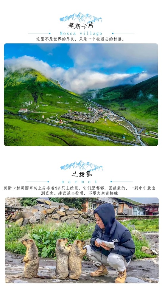 【景点简介】 莫斯卡:莫斯卡在几座大雪山的包围之中, 如同与世隔绝的孤岛,就像是诗意的栖息地,牧民们在精神领袖金龙寺日穹活佛(活佛释义:活佛,主要是汉族民众对藏族地区的一些转世修行者的称谓。汉族人习称\"活佛\",其实是不大准确的,应译称\"转世尊者\"。在藏语中,\"活佛\"则有多种不同的尊称,其中最为常用的有\"珠古\"、\"喇嘛\"、\"阿拉\"、等。当活佛圆寂后,寺院会使用不同的仪式,寻找活佛圆寂后出生的婴童。从中选定一名作为先辈活佛之转世的灵童。而后灵童会被迎入寺中,继承先辈活佛的宗教地位)的主持下,过着与世隔绝、诗意般的生活。莫斯卡人守候着这片净土,在超然物外的胜境中,人与野生动物和谐相处,无意识的达到了“天人合一”的完美境界,这便是传说中最后的村落---莫斯卡 【线路特色】 1、这里有数百个高原湖泊星罗棋布,拥有横断山区最为密集的海子群; 2、从甘孜到阿坝的极致穿越,沿途自然风光无限,宗教人文色彩丰富; 3、湖泊、草原、森林、野生动物,6、7月的高山花湖,10月漫山遍野的彩林。 4、每到花季,各色的野花种类繁多,这里堪称高山花卉的宝库 5、骨岑措、双连海、上下海、眼睛海、牛肝马肺海、情人海沿途12个各形各色湖泊一览无余。 6、奇幻之旅,体验莫斯卡的萌宠土拨鼠、情人海的裸鲤、太阳河谷的神泉。