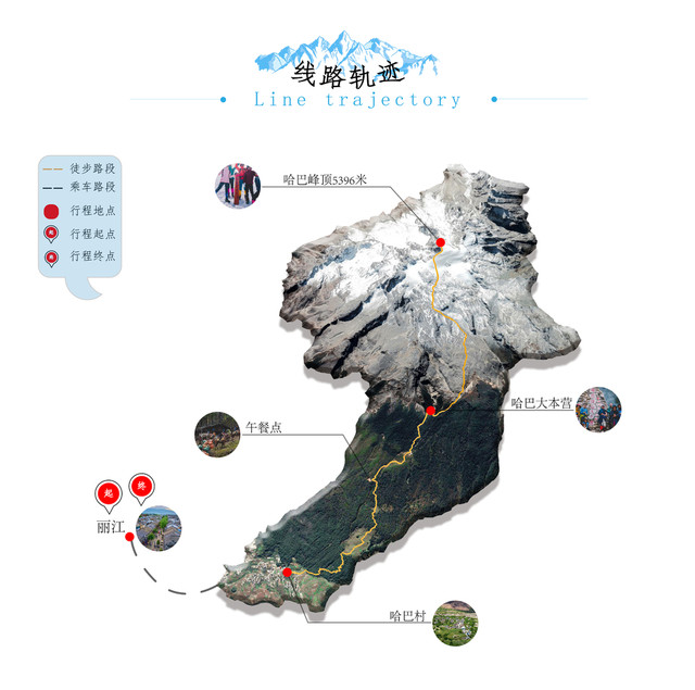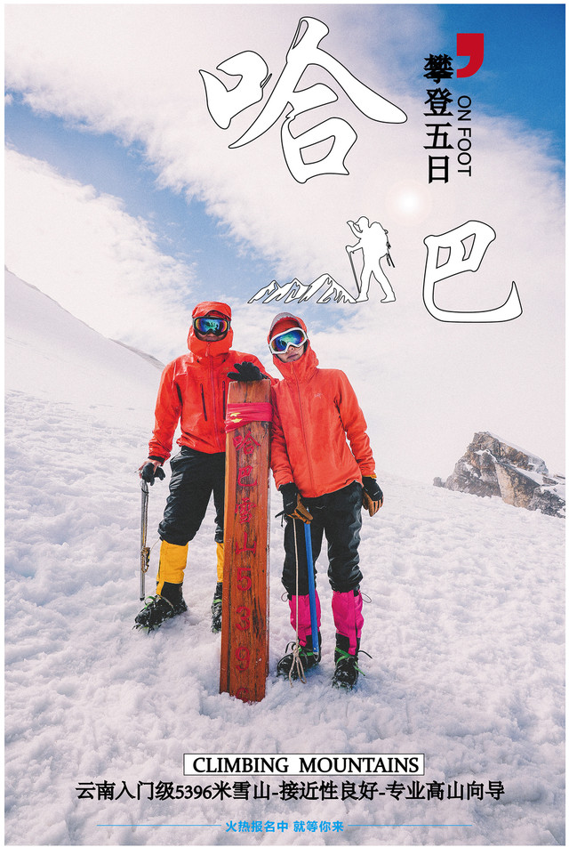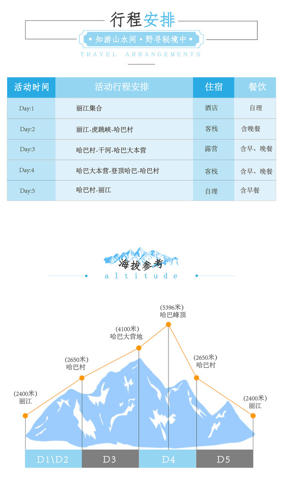 为什么要登山? 有人说因为山就在那里 也有人说人类需要征服自己 登山的理由千万个 但是每个人的心中一定都有一个雪山梦 但当我们望向海拔甚高的山峰 觉得总是遥不可及 一直没有勇气前往 其实,实现这个登上雪山之巅的梦想 也并没有想象中那么困难 人生第一座雪山 从这儿开始 √登山界公认的初等入门级训练登山首选 √良好的接近性和较长的登山窗口期 √完善和成熟的登山服务 √自然景观丰富震撼 云南香格里拉哈巴雪山,位于云南丽江与香格里拉交界区域,和玉龙雪山隔金沙江而立,举世闻名的徒步胜地虎跳峡就在两座雪山中间。海拔5396米,是云南省唯一允许攀登的5000米雪山。 哈巴雪山凭借其良好的接近性和较长的登山窗口期,以及较为完善和成熟的登山服务,成为登山界公认的初等入门级攀登雪山首选。 从雪山脚下的哈巴村(2650米)到顶峰(5396米),有着路线长度和海拔爬升高度,堪称“雪山攀登的炼金石”。 徒步哈巴雪山会经过村寨、森林、草甸、高山针叶林、杜鹃林、巨岩、雪坡等丰富的景观,风景多样而震撼。在峰顶还可观望玉龙雪山、梅里雪山、稻城亚丁三神山(仙乃日、央迈勇、夏诺多吉)。 行程安排 【活动参考行程】 D1:全国各地-丽江队员自行到达丽江,入住俱乐部统一安排的酒店,晚上可自由组织AA聚餐,领队将给大家做简单的行前说明。住宿:丽江客栈\\酒店标间餐食:自理海拔:丽江约2400米 D2:丽江-虎跳峡-哈巴村早餐后7点左右集合,从丽江出发,途中经过虎跳峡,下午到达哈巴村休整、检查装备、进行登山要领培训等,向导在了解各队员身体情况,交代次日活动安排以及互相交换意见后,大家自由活动。这一天晚上尽量早一些休息,第二天就要正式向神圣的雪山进发!住宿:哈巴村客栈\\酒店标间餐食:早餐自理、午餐自理,含晚餐海拔:哈巴村约2650米距离:行车约140km,约3小时 D3:哈巴村-干河-哈巴大本营早上7:30起床整理行装,8:30从哈巴村出发前往登山大本营(装备由骡马驮上大本营),体力较弱或需要保存体力的队员可以租马上山(安全及费用自理),中途休息食用干粮,经过6个小时左右的时间到达哈巴雪山登山大本营。在大本营安排好住宿后,由向导教授大家如何使用冰爪、冰镐,并学习滑坠制动等动作要领。晚餐后向导再次了解各队员身体状况,收拾好第二天适应性训练必带的物品后,可早点休息,养足精神。晚上一定要注意保暖,以防感冒,影响攀登计划。住宿:大本营石头房子餐食:含早餐、午餐自理,含晚餐海拔:哈巴大本营约4100米距离:徒步约8km,约6小时 特别提示:大本营海拔有4100米,有些队员可能会有轻微的高原反应,例如头疼、胸闷、喘不过气来等等,这时候要尽量避免剧烈运动、酗酒、抽烟等,保持良好的心态,多喝水,合理进食,很快就能克服高反了。D4:大本营-冲顶-大本营-哈巴村凌晨3:00起床,整理行装、检查个人装备, 3:30吃早餐,4:00跟随向导有序向顶峰进发。登顶成功(正常时间为9-10点之间)后请尽快在峰顶拍照,不要在峰顶停留过长时间,然后在高山向导的带领下下撤返回大本营。抵达大本营后,稍作休息,收拾物资装上骡马,下撤到哈巴村。 注意:登山过程中,如遇到身体不支的队员,请及时告知向导或高山协作队员,由高山协作队员带其撤回大本营;今天体力消耗较大,可提前预定下山骡马(安全及费用自理)。 冲顶时间表:3:30 大本营出发;5:30 爬升两个小山坡后到达大石板;6:00 开始到碎石段;7:00 进入冰雪混合地带;8:00 换上冰爪,大约4900米,冲击绝望坡;9:30 到达月亮湾;10:00 登顶,拍照留念;11:30 开始起风,此时无论在什么位置,都必须下撤。住宿:哈巴村客栈\\酒店标间餐食:含早餐、午餐自理,含晚餐海拔:哈巴大本营约4100米,哈巴登顶5396米距离:大本营-登顶往返约8km,返回哈巴村合计约16公里 D5:哈巴村-丽江今日是返程日,大约下午15:00到达丽江,结束哈巴雪山活动。我们总会相遇,我们总要离别,青山不改,绿水长流,他日江湖再见。住宿:哈巴村客栈\\酒店标间餐食:含早餐、午餐自理,含晚餐海拔:哈巴大本营约4100米,哈巴登顶5396米距离:大本营-登顶往返约8km,返回哈巴村合计约16公里 费用说明 【活动费用】 日常价(双号集合 单号出发) 1V1协作:3580元 1V2协作:2980元(2人报名方可预订;12-次年3月,7-8月不可预订) 9月30日-10月4日(天天发团) 1V1协作:3980元 1V2协作:3380元(2人报名方可预订;12-次年3月,7-8月不可预订) 【费用包含】 1、住宿:含哈巴村2晚、大本营1晚住宿; 2、门票:虎跳峡门票,进山门票,注册费,环境保护费; 3、用餐:哈巴村早晚餐各2个、大本营早晚餐各1个; 4、交通:丽江至哈巴村往返车费; 5、向导:专职登山协作费用、全程向导费用; 备注:丽江集散4人以上安排向导,4人以下则安排车辆送至哈巴村由协作带队; 6、马队:包含哈巴村到大本营往返驮运食品,装备的托运费; 7、装备费用:活动所需要公用装备,技术装备(专业冰爪、头盔,冰镐、安全带、路绳、登山杖、动力绳;)燃料及其他公用设备; 8、保险:专业登山保险。 【费用不含】 1、出发地往返丽江的大交通; 2、登顶队员需支付1v1协作200元小费,1比2协作每人150元; 3、税费、个人骑马消费及其他未注明费用。 赠送福利: 1、赠送丽江集合日1晚舒适性住宿; 2、登顶赠送登顶证书/纪念奖牌1枚; 3、登山杖1对、矿泉水1瓶、一次性雨衣1件、魔术头巾1条; 【提供装备】 1.技术装备:专业冰爪、头盔,