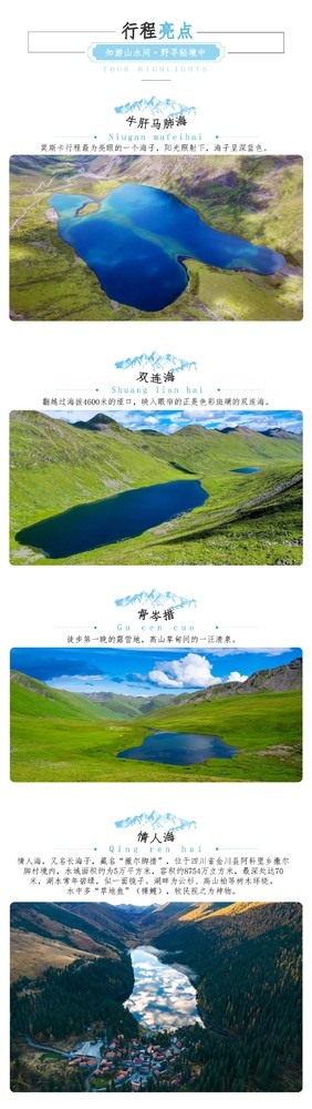 【景点简介】 莫斯卡:莫斯卡在几座大雪山的包围之中, 如同与世隔绝的孤岛,就像是诗意的栖息地,牧民们在精神领袖金龙寺日穹活佛(活佛释义:活佛,主要是汉族民众对藏族地区的一些转世修行者的称谓。汉族人习称\"活佛\",其实是不大准确的,应译称\"转世尊者\"。在藏语中,\"活佛\"则有多种不同的尊称,其中最为常用的有\"珠古\"、\"喇嘛\"、\"阿拉\"、等。当活佛圆寂后,寺院会使用不同的仪式,寻找活佛圆寂后出生的婴童。从中选定一名作为先辈活佛之转世的灵童。而后灵童会被迎入寺中,继承先辈活佛的宗教地位)的主持下,过着与世隔绝、诗意般的生活。莫斯卡人守候着这片净土,在超然物外的胜境中,人与野生动物和谐相处,无意识的达到了“天人合一”的完美境界,这便是传说中最后的村落---莫斯卡 【线路特色】 1、这里有数百个高原湖泊星罗棋布,拥有横断山区最为密集的海子群; 2、从甘孜到阿坝的极致穿越,沿途自然风光无限,宗教人文色彩丰富; 3、湖泊、草原、森林、野生动物,6、7月的高山花湖,10月漫山遍野的彩林。 4、每到花季,各色的野花种类繁多,这里堪称高山花卉的宝库 5、骨岑措、双连海、上下海、眼睛海、牛肝马肺海、情人海沿途12个各形各色湖泊一览无余。 6、奇幻之旅,体验莫斯卡的萌宠土拨鼠、情人海的裸鲤、太阳河谷的神泉。 行程安排 D1:成都集合(全天集合时间) 今日住宿:成都市区商务酒店标准间 今日餐饮(自理)荐:武侯祠耍都广场(美食街);玉林美食广场(美食街); 成都特色小吃推荐:酸辣粉、担担面、伤心凉粉、豆花、三大炮、麻圆、双流老妈兔头等等。 今日成都闲逛推荐:武侯祠、锦里步行街(小吃)、文殊院步行街(小吃)、宽窄巷子步行街(有小吃)、杜甫草堂、青羊宫、春熙路(有小吃)商业街等等。 (温馨提示:集合日为自由活动,不是正式的行程,请在自由活动时注意人身财产安全,集合日不含保险。到集合酒店报“姓名”拿房,房费已付,押金自付,活动报名截止后,我们才开始预定房间。一般在出发前3天,我们会将酒店信息发送到您的手机。) D2:成都--四姑娘山镇--丹巴县--莫斯卡村 早上酒店早餐后我们的领队、车辆会前往酒店集合人员统一出发。沿震后美丽的省道303一路前行。经过熊猫家园卧龙,云海奇观之地巴郎山后抵达四姑娘山镇午餐,在这里我们可以拍摄美丽的四位姑娘。下午时分到达没人滋养之地丹巴,继续乘车2个半小时抵达今日住宿地莫斯卡村,莫斯卡村为草原游牧部落建立的村落,是早观晨曦晚观星辰的极佳之地。 今日餐饮:早餐、晚餐由俱乐部统一安排;午餐自理 今日住宿:莫斯卡藏式民居多人间 今日海拔:成都550米、巴郎山隧道3900米、四姑娘山镇3300米、莫斯卡村3900米 今日距离:390km行车约8-9小时 D3:莫斯卡--各冲沟--骨岑措 早上睡到自然醒,或早起前往莫斯卡北山坡拍摄莫斯卡坛城晨景。太阳出来后在村里可寻找莫斯卡最为出名的土拨鼠。莫斯卡游玩完毕后我们打包装备上马开始徒步前往各冲沟,各冲沟内有两处海子,分别为:骨岑措、小海子,骨岑措为莫斯卡人一心敬畏的神湖,大约徒步3-4小时可到达湖边营地,这里湖水清澈见底,每到6月鲜花满地,是不可多得的星级营地。 今日餐饮:早餐、晚餐由俱乐部统一安排;午餐自理 今日住宿:骨岑措营地露营 今日海拔:莫斯卡3900米、骨岑措4300米 今日距离:7km,徒步约3-4小时 D4:骨岑措--小海子--双连海垭口-双连海 各冲沟由东向西延伸,早晨太阳升起之际,光影斜射入内配上骨岑措的晨雾,此乃一景。每当雨过天晴,湖边纤长窈窕的朱李敖像美人出浴般亭亭玉立,山脚下丰润的水草召唤着天边的洁白的云朵,经小海子开始翻越海拔4600米的双连海垭口。一条望不到头的沟壑赫然眼前,这便是阿科里的秘密--错朗沟,垭口下方正是色彩斑斓的双连海,由海子延申的大河宛如一条巨龙朝东连绵而去,沿河流而下下午时分便可抵达上下海营地。 今日餐饮:早餐、晚餐由俱乐部统一安排;午餐自理 今日住宿:上下海营地 今日海拔:骨岑措4300米、双连海垭口4600米、双连海4300米、上下海4300米 今日距离:13km,徒步约6小时 D5:上下海--下错朗沟--牛肝马肺海垭口--眼镜海--牛肝马肺海 早上睡到自然醒,上下海营地的早上很容易出现云海、白虹等奇观。今日行程非常轻松,早餐后打包好装备开始翻越4600垭口,行途过程中可看到整个错朗沟全景。翻越垭口后映入眼帘的当属此次路途中最美的海子--牛肝马肺海,它也叫真·情人海,如同两位缠绵的情侣紧紧相拥。下午时分抵达湖边后扎营开始享受这一无世无争的清静之地。体能较好的伙伴还可以徒步1-2小时到达西边垭口处俯瞰眼镜海。 今日餐饮:早餐、晚餐由俱乐部统一安排;午餐自理 今日住宿:牛肝马肺海营地 今日海拔:下错朗沟4100米、牛肝马肺海垭口4600米、牛肝马肺海4300米 今日距离:12km,徒步约5小时 D6:牛肝马肺海--情人海--太阳河谷--马尔康县(或观音桥镇) 早上自由起床拍摄湖边美景,可前往湖中的岛心拍摄。早餐后我们整理准备一路下山,抵达太阳河谷。卸下装备后我们乘车前往情人海欣赏“四川喀纳斯”之美。下午时分驱车返回马尔康县或观音桥镇。 今日餐饮:早餐、晚餐由俱乐部统一安排;午餐自理 今日住宿:马尔康县(或观音桥镇)酒店标准间 今日海拔:牛肝马肺海4300米、情人海3900米、马尔康2600米 今日距离:10km,徒步约3-4