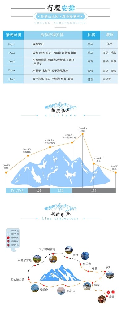 【线路特色】 1、为什么要登山,因为山在那里。为什么要徒步,因为徒步可以领略常人所不曾见过的美丽风景,依靠自己体力和顽强毅力,漫长跋涉,去翻越一座座高山,通过灌木丛,碎石坡,冰雪路面,所收获的又岂止是风景。 2、中国十大经典徒步线路之一、四川最经典徒步线路。 3、行程有足够的时间适应高原,既有挑战,又能顺利的完成。 4、夏天的花海、秋天的红叶彩林、都是值得推荐的徒步天堂。 5、该线路是集雪山、河流、高山海子、高山草甸、原始森林等的线路无论是徒步穿越还是徒步摄影皆可。 行程安排 D1:成都集合 今日全国各地的队友将来到成都集合,统一入住我俱乐部安排的酒店。如果您的时间比较宽裕,还可以自行安排在成都市区的旅游活动,推荐游览锦里、武侯祠、杜甫草堂、宽窄巷子等景点,品尝成都特色美食,感受天府之国的休闲生活,相信绝对会让大家深深地体会到什么是“休闲之都”啦! 住宿:成都市区酒店(双人标间) 餐饮:全天餐费自理 海拔:成都约540米 D2:成都-映秀-卧龙-巴郎山-四姑娘山镇 早上从酒店门口出发,一路上途经映秀、卧龙,一路观赏“熊猫之乡”、“宝贵的生物基因库”、“天然动植物园”,顺着盘山公路翻越巴郎山,穿过巴郎山隧道,猫鼻梁拍摄四姑娘山全景,然后抵达四姑娘山镇。 住宿:四姑娘山镇客栈(双人标间) 餐饮:酒店含早、途中午餐自理、四姑娘山镇晚餐 需时:全程200km,行车4小时左右 海拔:成都约540米,巴郎山约3900米,四姑娘山镇约3200米 D3:四姑娘山镇-喇嘛寺-枯树滩-干海子-木骡子 乘观光车进入长坪沟,抵达喇嘛寺后,就开始我们为期三天的徒步穿越行程,长坪沟全长29公里,面积约为100平方公里,峡谷长天、平缓悠长,四姑娘山就坐落在沟内16公里处。长坪沟景区内有古柏幽道、喇嘛寺、干海子及数十米高的飞瀑,并有奇石之景。夏天,山花与油菜花齐开;秋日,赤桦与红枫竞艳。历经沧桑的翠柏青松郁郁葱葱,飞瀑流泉在密林中哗哗作响,古代驿路在茫茫林海里穿梭延伸。中午在干海子稍作休息并解决午餐(路餐),当天晚上在四姑娘山幺妹峰脚下的木骡子营地露营。 住宿:木骡子营地露营 餐饮:四姑娘山镇早餐、午餐(路餐自理)、营地晚餐 需时:约13km,徒步6小时左右 海拔:喇嘛寺约3400米,枯树滩约3500米,木骡子约3760米 D4:木骡子-水打坝-叉子沟尾营地 早起拍摄骆驼峰日照金山以及长坪河谷风光,早餐后撤营离开木骡子轻装向长坪沟尾徒步,经水打坝,乌龟石,羊满台,抵达叉子沟尾露营。到达营地时间很充足当天早早休息,为第二天的长途跋涉做准备。 住宿:叉子沟尾营地露营 餐饮:营地早餐、午餐(路餐自理)、营地晚餐 需时:约14km,徒步7小时左右 海拔:水打坝约3800米,叉子沟尾营地约3900米 D5:叉子沟尾-垭口-磐羊湖-毕棚沟-理县-成都 今天早起,凌晨3点左右出发,具体根据领队安排时间为准,今天体力要求相对较大,大家做好准备从营地到垭口大约6km,开始的一段路非常陡峭,需要倍加小心,后面坡度稍缓一些,在经过一个大平台之后,垭口就在眼前了。翻越垭口,一路下坡,来到毕棚沟内的三棵树营地,之后就是毕棚沟的大路了,一路的景色也非常棒,抵达公路边三棵树之后,等待后面的队员到来,一起乘坐景区电瓶车来到上海子接待站,在此乘坐景区观光车抵达毕棚沟大门,到达景区大门,乘上早已等候我们的车子,当天晚上抵达成都。 住宿:不含,可代订 餐饮:早(含),午餐(路餐自理),晚餐(自理) 行程:重装徒步9小时左右,约14km;行车3小时左右,约190km 海拔:成都约540m 温馨提示: 1.抵达成都时间约为19:00-20:00,由于四川的交通状况不是十分的理想,可能会因为修路、交通管制,堵车耽误时间,实际到达时间可能更晚。所以建议大家尽量购买第二天离开成都的机票或火车票! 费用说明 【费用包含】 1.交通:全程进山往返交通费用,根据人数选择合适车型。 2.住宿:按照行程所列标准入住(成都1晚+四姑娘山1晚+2晚露营)。 3.餐饮:3正5早含营地餐。营地晚餐为2荤2素1汤、营地早餐粥、大饼、榨菜。 4.门票:长坪沟户外活动票、长坪沟观光车、毕棚沟电瓶车、毕棚沟观光车、毕棚沟门票。 5.领队:专业户外领队全程服务。 6.马匹:驮运装备费用(个人行李限重20kg)。 7.装备:活动所需要的公用装备。 8.组织:户外活动组织费。 9.保险:活动期间户外高原组合意外保险100万。 【费用不含】 1.其他个人消费、个人骑马等。 2.路餐3顿自理。 3.背夫费用(D5翻越垭口马匹过不去,需自己负重或请背夫,公用装备俱乐部统一运送)。 注:骑马、背包价格参考: 1.四姑娘山镇-木骡子营地骑马:350-400元,具体价格需要与马帮协商。 2.木骡子营地-叉子沟尾营地骑马:350-400元,具体价格需要与马帮协商 以上价格在国庆节期间都有调整幅度,具体以当地为准。 叉子沟尾背夫背包:400-500/包(国庆600左右/包,具体价格需要与背夫协商) 特别提示: 我俱乐部有权根据实际情况,在不减少游览景点及接待标准的前提下对行程游览顺序进行调整。如因不可抗力影响,如地震、山洪、道路塌方等,导致行程无法完成或更改路线,大家通过协商进行费用退补(行程减少或取消按未发生费用全额退费,行程增加或绕道按实际增加费用补费)。参与队员可以打印此贴作为行程依据。 注意事项 【活动装备】 第一类:服装装备 1、冲锋衣裤(户外活动必备,防风、防水、透气、耐磨……) 2、抓绒衣(含WIN