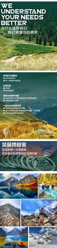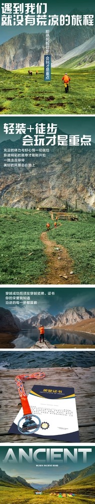 第一天| Day One 行程:各地-库车市 请当日下午17:00前到达集合,检查装备、行前准备会议。 今天为行程的第一天,请在规定的时间内参加准备会,并有专人检查装备,当晚住在库车市。 餐食:自理 夜宿:库车市(酒店标准间) 第二天| Day Two 行程:库车市 -黑英山乡(1920米)(包车)-博孜日格河谷营地(2180米) 乘车前往黑英山乡,简单休整后从黑英山乡出发沿河谷上行,从1940米的黑英山沟口行至2180米的露营地博孜日格河谷,黑英山乡隶属新疆阿克苏地区的拜城县,是从南疆穿越乌孙古道到达北疆伊犁的必经之地,牧民多为维吾尔族,当天行走约17公里,今晚我们在河谷内扎营。 行车距离:约110KM 徒步距离:17KM 餐食:库车酒店早餐、午餐路餐、晚餐四菜一汤 夜宿:博孜克日格河谷营地 第三天| Day Three 行程:博孜日格河谷营地(2180米)-博孜克日格河谷营地(3280米) 早上出发,一路沿河谷上行约20公里。博孜克日格河谷蜿蜒曲折,基本全是碎石坡,冰川融水沿碎石缝隙流入河谷,河水时而漫过石块,时而汹涌拍打石块。从今天开始需要频繁过河,约30-40次。有些地方水流缓而齐腰深。有些水流小仅没脚面。今晚我们将在河谷中扎营。 徒步距离:22KM 餐食:营地早餐、午餐路餐、晚餐四菜一汤 夜宿:博孜克日格河谷营地 第四天| Day Four 行程:博孜克日格河谷营地(3280米)-阿克布拉克达坂(3820米)-阿克库勒高山湖(天堂湖)营地(3020米) 早上吃完早饭后继续在博孜克日格河谷里行进,一路上行,中午时分翻越3820米的阿克布拉克达坂。继续向东北方向下行翻过湖畔的乱石堆到达沿湖西侧绕行,至著名的网红打卡地-天堂湖老虎口,在此你可以拍照留念,环湖徒步...当晚扎营至天堂湖营地。海拔约3020米。 徒步距离:15KM 餐食:营地早餐、午餐路餐、晚餐四菜一汤 夜宿:天堂湖营地 第五天| Day Five 行程:阿克库勒高山湖(天堂湖)营地(3020米)- 阔克苏河营地(1980米) 天堂湖停留半天,可在此尽情拍摄,体验。 早晨起床后修整,清晨的天堂湖静谧而灿烂,第一缕阳光映射在峰顶,在巍蔚壮蓝的湖水映衬下犹如仙界;中午出发,沿阿克布拉克河谷开始下行,这里是深山牧场,零星牛羊点缀在河谷中。途中需要过河7-8次,一路不断下降。下午抵达阔克苏河过溜索后扎营。 徒步距离:18KM 餐食:营地早餐、午餐路餐、晚餐四菜一汤 夜宿:阔克苏河营地 第六天| Day Six 行程:阔克苏河营地(1980米)-库诺萨依营地(3350米) 今天沿库诺萨依方向继续行走5公里左右我们开始穿越道道溪水进入丛林,身后是闻名遐迩的阔克苏河如一道蓝绿色的绸缎蜿蜒盘踞谷中,季节不同选择线路也有不同,可能会沿小河谷前行,如果河水大就要在山腰上行进,当晚在库诺萨依营地扎营。 徒步距离:18KM 餐食:营地早餐、午餐路餐、晚餐四菜一汤 夜宿:库诺萨依营地 第七天| Day Seven 行程:库诺萨依营地(3350米)-琼达坂(3760米)-琼库什台河谷营地(2800米) 映入眼帘的是雪线之上湛蓝的天空或者狂风暴雪,先沿着库诺萨依河谷行走几小时后开始翻越琼达坂(3700米)站在达坂顶上可以看到峰峦叠嶂,感受大自然壮阔的魅力,途中需要过河一次,然后剧烈下降后会经过一座木桥向小木屋进发会翻越几个碎石坡,最后到达琼库什台河谷。当晚在琼库什台河谷扎营。 徒步距离:14KM 餐食:营地早餐、午餐路餐、晚餐四菜一汤 夜宿:琼库什台河谷营地 第八天| Day Eight 行程:琼库什台河谷营地(2800米)-琼库什台村(2000米)-特克斯县-伊宁市(包车) 早上出发,一路沿河谷下行方向是西偏北方向下行有很明显的马道,坡度不大,河谷时窄时宽,宽处是优等高山牧场,牛羊成群,木屋点点。行走约14公里左右和约定车辆汇合后乘汽车前往伊宁市,在此可以把酒言欢庆祝成功穿越。当晚住在伊宁市。 行车距离:约220KM 徒步距离:14KM 餐食:营地早餐、午餐路餐、晚餐八菜一汤 夜宿:伊宁市(酒店标准间) 第九天| Day Nine 行程:伊宁市-各地 今天结束乌孙古道探险之旅。(全程结束)如时间充裕,您可去市区逛逛,新疆干果美名远扬,不妨带些回去馈赠亲友。 餐食:酒店早餐 注:1、徒步期间全程无网络信号; 2、户外活动有一定不可预见性,请将返程时间预留一天。 【旅游时间】 第一期:2023年6月3日-2023年6月11日 第二期:2023年6月10日-2023年6月18日 第三期:2023年6月17日-2023年6月25日 第四期:2023年6月22日-2023年6月30日 第五期:2023年7月1日-2023年7月9日 第六期:2023年7月22日-2023年7月30日 第七期:2023年7月29日-2023年8月6日 第八期:2023年8月5日-2023年8月13日 第九期:2023年8月12日-2023年8月20日 第十期:2023年8月19日-2023年8月27日 第十一期:2023年8月26日-2023年9月3日 第十二期:2023年9月2日-2023年9月10日 第十三期:2023年9月9日-2023年9月17日 第十四期:2023年9月16日-2023年9月24日 第十五期:2023年9月23日-2023年10月1日 第十六期:2023年9月29日-2023年10月7日 第十七期:2023年10月1日-2023年10月9日 第十八期:2023年10月2日-2023年10月10日 【活动费用】 人民币:6280元/人 【费用包含】 1. 交通:库车-黑英山、琼库什台-特克斯-伊宁集体包车费; 2. 餐食:2顿酒店早餐,1顿庆功宴,徒步途中全程餐饮服务费用,徒步途中餐桌+餐椅+封闭式餐厅帐篷,根据行程随机一晚赠送手抓羊肉(替换当晚四菜一汤); 3. 住宿:1晚库车市住宿、1晚伊宁市住宿; 4. 物资运输:马匹费用(全程驮运物资),及马夫雇佣费; 5. 领队:熟悉当地人文、地理,持有登山协会认证领队证; 6. 保险:80万元个人户外探险意外伤