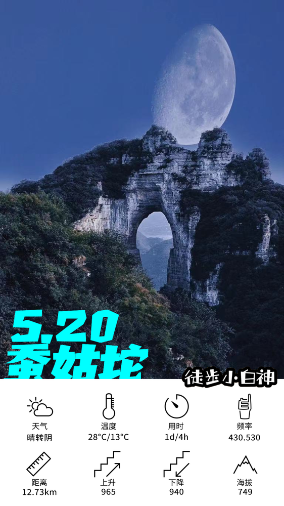 徒步路线成熟,部分路段不好走,从蚕姑坨附近的沙岭村出发,经过老君堂,是一个环线,全程13公里,累计爬升970米,下降940米。报名者需要有一定的运动基础。徒步小白神路线等级为0级/000.000。