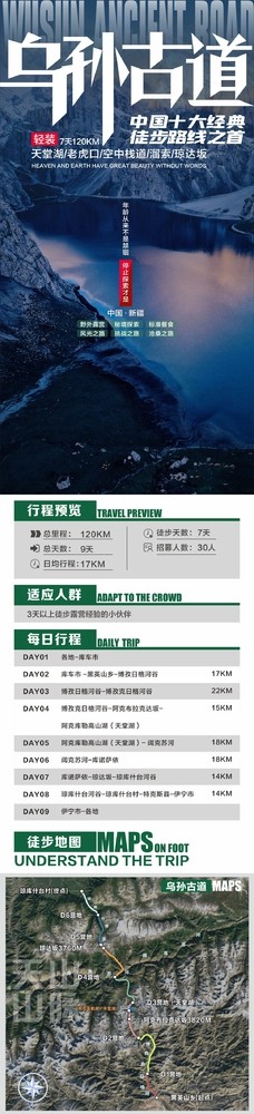 第一天| Day One 行程:各地-库车市 请当日下午17:00前到达集合,检查装备、行前准备会议。 今天为行程的第一天,请在规定的时间内参加准备会,并有专人检查装备,当晚住在库车市。 餐食:自理 夜宿:库车市(酒店标准间) 第二天| Day Two 行程:库车市 -黑英山乡(1920米)(包车)-博孜日格河谷营地(2180米) 乘车前往黑英山乡,简单休整后从黑英山乡出发沿河谷上行,从1940米的黑英山沟口行至2180米的露营地博孜日格河谷,黑英山乡隶属新疆阿克苏地区的拜城县,是从南疆穿越乌孙古道到达北疆伊犁的必经之地,牧民多为维吾尔族,当天行走约17公里,今晚我们在河谷内扎营。 行车距离:约110KM 徒步距离:17KM 餐食:库车酒店早餐、午餐路餐、晚餐四菜一汤 夜宿:博孜克日格河谷营地 第三天| Day Three 行程:博孜日格河谷营地(2180米)-博孜克日格河谷营地(3280米) 早上出发,一路沿河谷上行约20公里。博孜克日格河谷蜿蜒曲折,基本全是碎石坡,冰川融水沿碎石缝隙流入河谷,河水时而漫过石块,时而汹涌拍打石块。从今天开始需要频繁过河,约30-40次。有些地方水流缓而齐腰深。有些水流小仅没脚面。今晚我们将在河谷中扎营。 徒步距离:22KM 餐食:营地早餐、午餐路餐、晚餐四菜一汤 夜宿:博孜克日格河谷营地 第四天| Day Four 行程:博孜克日格河谷营地(3280米)-阿克布拉克达坂(3820米)-阿克库勒高山湖(天堂湖)营地(3020米) 早上吃完早饭后继续在博孜克日格河谷里行进,一路上行,中午时分翻越3820米的阿克布拉克达坂。继续向东北方向下行翻过湖畔的乱石堆到达沿湖西侧绕行,至著名的网红打卡地-天堂湖老虎口,在此你可以拍照留念,环湖徒步...当晚扎营至天堂湖营地。海拔约3020米。 徒步距离:15KM 餐食:营地早餐、午餐路餐、晚餐四菜一汤 夜宿:天堂湖营地 第五天| Day Five 行程:阿克库勒高山湖(天堂湖)营地(3020米)- 阔克苏河营地(1980米) 天堂湖停留半天,可在此尽情拍摄,体验。 早晨起床后修整,清晨的天堂湖静谧而灿烂,第一缕阳光映射在峰顶,在巍蔚壮蓝的湖水映衬下犹如仙界;中午出发,沿阿克布拉克河谷开始下行,这里是深山牧场,零星牛羊点缀在河谷中。途中需要过河7-8次,一路不断下降。下午抵达阔克苏河过溜索后扎营。 徒步距离:18KM 餐食:营地早餐、午餐路餐、晚餐四菜一汤 夜宿:阔克苏河营地 第六天| Day Six 行程:阔克苏河营地(1980米)-库诺萨依营地(3350米) 今天沿库诺萨依方向继续行走5公里左右我们开始穿越道道溪水进入丛林,身后是闻名遐迩的阔克苏河如一道蓝绿色的绸缎蜿蜒盘踞谷中,季节不同选择线路也有不同,可能会沿小河谷前行,如果河水大就要在山腰上行进,当晚在库诺萨依营地扎营。 徒步距离:18KM 餐食:营地早餐、午餐路餐、晚餐四菜一汤 夜宿:库诺萨依营地 第七天| Day Seven 行程:库诺萨依营地(3350米)-琼达坂(3760米)-琼库什台河谷营地(2800米) 映入眼帘的是雪线之上湛蓝的天空或者狂风暴雪,先沿着库诺萨依河谷行走几小时后开始翻越琼达坂(3700米)站在达坂顶上可以看到峰峦叠嶂,感受大自然壮阔的魅力,途中需要过河一次,然后剧烈下降后会经过一座木桥向小木屋进发会翻越几个碎石坡,最后到达琼库什台河谷。当晚在琼库什台河谷扎营。 徒步距离:14KM 餐食:营地早餐、午餐路餐、晚餐四菜一汤 夜宿:琼库什台河谷营地 第八天| Day Eight 行程:琼库什台河谷营地(2800米)-琼库什台村(2000米)-特克斯县-伊宁市(包车) 早上出发,一路沿河谷下行方向是西偏北方向下行有很明显的马道,坡度不大,河谷时窄时宽,宽处是优等高山牧场,牛羊成群,木屋点点。行走约14公里左右和约定车辆汇合后乘汽车前往伊宁市,在此可以把酒言欢庆祝成功穿越。当晚住在伊宁市。 行车距离:约220KM 徒步距离:14KM 餐食:营地早餐、午餐路餐、晚餐八菜一汤 夜宿:伊宁市(酒店标准间) 第九天| Day Nine 行程:伊宁市-各地 今天结束乌孙古道探险之旅。(全程结束)如时间充裕,您可去市区逛逛,新疆干果美名远扬,不妨带些回去馈赠亲友。 餐食:酒店早餐 注:1、徒步期间全程无网络信号; 2、户外活动有一定不可预见性,请将返程时间预留一天。 【旅游时间】 第一期:2023年6月3日-2023年6月11日 第二期:2023年6月10日-2023年6月18日 第三期:2023年6月17日-2023年6月25日 第四期:2023年6月22日-2023年6月30日 第五期:2023年7月1日-2023年7月9日 第六期:2023年7月22日-2023年7月30日 第七期:2023年7月29日-2023年8月6日 第八期:2023年8月5日-2023年8月13日 第九期:2023年8月12日-2023年8月20日 第十期:2023年8月19日-2023年8月27日 第十一期:2023年8月26日-2023年9月3日 第十二期:2023年9月2日-2023年9月10日 第十三期:2023年9月9日-2023年9月17日 第十四期:2023年9月16日-2023年9月24日 第十五期:2023年9月23日-2023年10月1日 第十六期:2023年9月29日-2023年10月7日 第十七期:2023年10月1日-2023年10月9日 第十八期:2023年10月2日-2023年10月10日 【活动费用】 人民币:6280元/人 【费用包含】 1. 交通:库车-黑英山、琼库什台-特克斯-伊宁集体包车费; 2. 餐食:2顿酒店早餐,1顿庆功宴,徒步途中全程餐饮服务费用,徒步途中餐桌+餐椅+封闭式餐厅帐篷,根据行程随机一晚赠送手抓羊肉(替换当晚四菜一汤); 3. 住宿:1晚库车市住宿、1晚伊宁市住宿; 4. 物资运输:马匹费用(全程驮运物资),及马夫雇佣费; 5. 领队:熟悉当地人文、地理,持有登山协会认证领队证; 6. 保险:80万元个人户外探险意外伤