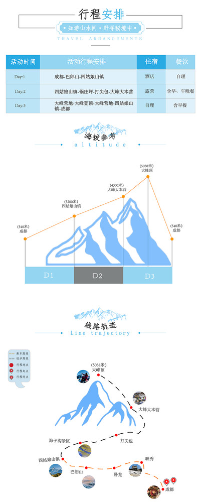 【费用明细】 D1:成都-都江堰-巴郎山-四姑娘山镇 下午6:30集合出发(节假日早上出发)前往四姑娘山镇,途经都江堰,出城上都汶高速,在5.12汶川地震震中映秀下高速,之后沿303省道,沿卧龙峡谷而上。翻越海拔4532米的熊猫王国-巴朗山,观巴朗山的草甸,领略巴朗山的雄奇自然风光,路过四姑娘山最佳拍摄点之一猫鼻梁,欣赏四姑娘山全景,晚上入住四姑娘。PS:今天行车时间较长,请准时到达集合地点。 餐饮:全天自理 住宿:四姑娘山客栈 海拔:四姑娘山约3200M 注意事项: 1. 今日抵达四姑娘山镇可能时间较晚,请提前安排自己的晚餐,中途除上厕所基本不做停留;部分个人装备镇上有售卖或租赁点,具体可咨询领队。 2. 由于山区气候,巴朗山夜间容易起雾,造成行车安全受到威胁,请大家准守出发时间! D2:日隆-锅庄坪-打尖包-大峰大本营 用过早餐后,打包整理个人装备,在清点上马后出发,今天的徒步时间长,强度较大,(建议佩戴护膝使用登山杖)开始我们的徒步,路程在16公里左右,大约在下午5点左右到达大峰大本营,安营扎寨,统一吃完营地餐之后提早入睡。 餐饮:早餐-含 午餐-路餐自理 营地晚餐-含 住宿:大峰大本营露营 海拔:大本营海拔4200M 注意事项: 今日路程不长,但是海拔爬升较高,途中有一个小卖部可以补充水和泡面等物资。请合理安排好自己的体力,控制好自己的行进速度,预留好第二天冲顶的体力,如需要骑马请提前联系向导。 D3:大峰营地-大峰登顶-大峰营地-四姑娘山镇-成都 凌晨4:00起床,吃完早餐后4:30准时出发(根据季节不同出发时间可能有调整,具体根据领队安排为准),往返大峰顶大约需要6小时左右,在大峰营地自由吃完午餐后下撤到四姑娘山镇,在四姑娘山镇稍作休息之后出发回到成都,大家可以在成都自由约饭,庆祝登顶的喜悦,分享过程中的辛酸得失。 餐饮:早餐-含 午餐(路餐)-敬请自理 晚餐-自理 住宿:自理 海拔:成都约540M 下撤备用线路:大峰营地-打尖包-海子沟-海子沟桥头公路,此线路下撤节约2小时左右,不走回头路,具体根据实际情况安排。 注意事项:四姑娘山海子沟属于国家重点核心保护区,没有开发,保持原生态,故大本营无电无公路(大本营石头房子住宿为通铺,无法提供洗脸、洗脚)。 费用说明 【集合时间】常规:每周五下午15点左右 (逢节假日有变动,请提前与客服确定) 非常规:即非周五下午出发(2.5日)每天发团批次 【集合地点】出发前短信告知 【适合人群】摄影爱好者(18-55岁)身体健康者 【出团通知】统一通知 【活动费用】常规:1880元/人 提供冰爪、登山杖、头灯,节假日大本营石头房子铺位不足则安排露营,并提供露营装备。 【费用包含】 1、交通:全程往返包车 2、住宿:一晚当地住宿 3、门票:海子沟户外管理票 4、餐食:按行程所列餐食 5、领队:专业登山领队1-2名,当地高山向导1名 6、药品:高原应急药品、氧气等 7、马匹:个人装备及公用装备马匹驮运 8、登山报备:登山活动需经四川省登山协会备案批准 9、保险:专业户外险(保额80w) 【费用不含】 1、部分餐食 2、个人骑马等其他消费 3、睡袋等装备 注:以上费用不含发票 注意事项 活动装备 第一类:服装装备 1、冲锋衣裤(户外活动必备,防风、防水、透气、耐磨……) 2、抓绒衣(含WINDSTOPPER,主要是防风、保暖) 3、排汗内衣(户外运动后保持身体干燥) 4、快干衣裤(夏天出行的必备,裤管、袖管最好是可以脱卸的) 5、羽绒衣裤(冬天出行或者去高原地带的保暖必备) 6、其他个人衣物(一次性内裤、汗衫T恤……) 7、徒步登山鞋(适应性强、耐磨、防水、最好是中高帮的,可保护叫脚踝) 8、溯溪鞋或运动凉鞋(可作营地鞋,徒步也可直接穿) 9、排汗袜子(最好是COOLMAX料的,配合GORE—TEX鞋穿,可排脚汗,可防冻伤,可防起水泡) 10、遮阳帽(圆边的、棒球帽式的、随便喜好,能挡太阳就行) 11、抓绒帽(主要是保暖) 12、薄手套(主要为了活动方便、防晒伤) 13、厚手套(主要是保暖的功效) 14、眼镜(运动型的更好一点,主要功能是遮阳,防紫外线,也可以用来摆酷) 15、头巾(即可擦汗,又可做围脖摆酷、御寒) 第二类:辅助装备 1、保温水壶(高原出行必备,喝一口热水是一种享受) 2、头灯(在营地或夜行的时候照明,备足电池) 3、登山杖(使用得好,可以节省20%左右的体力,减小对膝盖冲击力) 4、护膝(有膝伤的队员必带,无伤的也要保护) 5、雪套(在雪地或者泥泞路段很管用) 6、大背包或者驮包(用以马或牦牛托运) 7、冲锋包(小包,背负路餐以及其他随身物品) 8、背包防雨罩或防雨袋(用于防雨和防赃) 9、防水袋(用于睡袋以及其他衣物防水亦可用大塑料带代替) 第三类:露营装备 1、睡袋(睡袋极限温标至少-15度以下) 2、帐篷(四季帐或者高山帐) 3、帐篷地席(保护你的帐篷底面,免受磨损。可选择带) 5、防潮垫(泡沫垫或者充气垫) 6、铝膜地席(可选择带) 7、炉头、套锅(用于烧水煮茶,可选择带) 第四类:其他装备 1、餐具(营地餐个人餐具自备) 2、路餐(建议:巧克力、牛肉干、葡萄干、能量棒、榨菜、水果、面包等高热量等食品) 3、个人常用药(根据个人的身体状况,酌情携带。高原上医药条件落后,请备足所需剂量) 4、个人卫生:牙膏、牙刷、毛巾、爽足粉、润肤霜、防晒霜(50倍以上,重要、必备)、唇膏(重要、必备)护手霜,发热贴,指甲刀,垃圾袋 【公共装备】 炊事帐篷、炊具、食品、燃料、对讲机、应急药品氧气等。 活动报