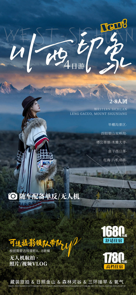 行程简介: D1 成都-毕棚沟(冰瀑.雪山.森林)-古尔沟 D2 古尔沟-四姑娘山双桥沟(雪山.森林.河谷)-四姑娘山镇 D3 四姑娘山镇-丹巴-塔公草原(藏装旅拍)-木雅大寺-鱼子西(守候日落金山)-新都桥 D4 新都桥-康定机场路(公路大片)-远观斯丁措-红海子-成都 说明:师傅在不减少景点的情况下可根据实际情况调整景点游玩先后顺序。 费用包含 1、来回车费,5座SUV或7座、9座商务车随机安排; 2、全程3晚标间住宿(舒适型、高档型); 3、不提供专业导游服务,仅安排中文司机负责行程活动中接待服务,司机不进景区; 4、【活动赠送】(赠送项目不用不退,国庆、元旦、春节、五一、清明、端午等大型节假日除氧气和意外险,其余取消赠送): 1、每人赠送一瓶氧气; 2、户外旅游意外保险; 3、塔公草原定点旅拍:服装1套,3张精修(如塔公草原无法安排则取消赠送,介意慎拍); 4、成都三环内(除东站)上门接早(三环外的游客需要赶到三环内集合地点); 5、随车配备单反或无人机。 关于摄影团的说明: 1、领队陪同游玩,兼职司机,双桥沟景区领队不陪同; 2、禁飞地区或遇大风或降雨天气等客观条件,不具备航拍条件时,领队可以选择不拍,敬请谅解! 3、大型节假日,清明、五一、端午、国庆、元旦、春节等无摄影领队带队。 费用不含 1、全程餐费。建议现场AA,结伴觅食,司机不参与AA。如不一起用餐,全车人补贴司机80元/天,如车上4个人,行程3天就是3*80除以4=60元,国庆节春节餐补120元/天; 2、全程可能产生的个人消费等; 3、 单房差:不含自然单房差;拼房不成功或带小孩的单独客人需要补房差; 4、 景区门票等自理。参考价格,具体的以实际为准:毕棚沟门票+观光车130/人,四姑娘山-双桥沟门票80元/人+观光车70元/人,红海子、鱼子西、木雅大寺、塔公草原卫生费约20元/人;由于鱼子西道路条件有限,中转车60元/人,费用自理(原车师傅如愿意前往,也需补该费用给师傅)。 活动费用 舒适住宿版:1680元/人 高档住宿版:1780元/人 元旦假期版:12.29号-1.1号 基础增加200元/人 行程详情 D1:成都-毕棚沟(冰瀑.雪山.森林)-古尔沟(约240km) 餐:AA用餐 住宿:古尔沟酒店标间 舒适酒店:源泉酒店/嘉源温泉酒店/美谷温泉酒店/唛朵温泉酒店/藏家休闲山庄或同级酒店 高档酒店:诗曼温泉酒店/西康亚温泉酒店/凯瑞诗温泉大酒店/神峰初见温泉酒店/石木居酒店/醉佳酒店或同级酒店 早上集合出发(具体时间以通知为准),前往【毕棚沟景区】,是国内非常知名的红叶观赏圣地,是一个集原生态景观博览、登山穿越、极地探险、滑雪滑冰、休闲度假于一体的大型原生态旅游风景区。景区内红叶、杜鹃花种类繁多,森林原始、瀑布飞挂、冰川奇特。毕棚沟以其优美的自然风光、完美的自然生态景观、优良的生态环境著称。后返回新都桥酒店入住。 温馨提示: 初入高原,避免剧烈运动造成不适。 D2:古尔沟-四姑娘山双桥沟(雪山.森林.河谷)-四姑娘山镇(约360km) 餐:AA用餐 住宿:四姑娘山镇酒店标间 舒适住宿:四姑娘山云逸锦峰/圣洁酒店/丹巴甲居风情大酒店/云逸锦峰/尚客优/金源/金珠大酒店或同级酒店 高档住宿:四姑娘山东方峰雅/丹巴金河/四姑娘山玫瑰/美人谷/悦山度假/情怀谷酒店/楠城云顶酒店或同级酒店 早餐后前往【四姑娘山双桥沟】,四姑娘山风景区由双桥沟、长坪沟、海子沟三部分组成。全长30余公里,面积216.6平方公里的双桥沟风景,最为集中,最为迷人。双桥沟景区平均海拔约3500米,游玩时间约3小时,门票参考80元/人+观光车70元/人。沟内主要以雪峰、牧场、草地、森林等为主,沟内山势陡峭曲折,林木葱郁,是四姑娘山美丽的一条沟。漫步沟内,可体验到真正的牧区风光。每当春秋季节,沟内五颜六色,蔚为壮观。冬季如入瑞士的童话冰雪世界。沟内有观光车直达沟尾,可以毫不费力,轻松观赏沟内奇景,晚上入住四姑娘山镇酒店。 温馨提示: 切记带上厚外套,以及帽子围巾墨镜,山上风大温度低,以防感冒高反。 D3:四姑娘山镇-丹巴-塔公草原(藏装旅拍)-木雅大寺-鱼子西(守候日落金山)-新都桥(约293km) 餐:AA用餐 住宿:新都桥酒店标间 舒适住宿:大观景/嘉阖/大成/瑞景/好摄之途/云端观景/美域/白云间/康藏华庭等 高档住宿:康定摄影天堂大酒店/梵音阿缦/浪波湾大酒店(康定新都桥店)/云顶星空/星梦酒店/伊莎酒店/印象雅致酒店/如家酒店(康定新都桥店)/泥朵仓嘉云舍/暮山映雪·私汤别院(康定新都桥店)/好摄星空贵宾楼/四季如歌酒店/维也纳3好酒店(康定新都桥店)/康定云天假日酒店(新都桥店)/姝蔓雪域酒店(新都桥店)等 早餐后途经【塔公草原】,前往【木雅大寺】,位于塔公草原深处的一个小村落“各日马村”,四面环山背靠雅拉神山,这是一个由觉姆庙,喇嘛寺、佛学院和藏医院组成的寺庙群,绵延数里。随后驱车前往【鱼子西】,鱼子西位于康定市塔公镇,是一个宁静优美原始传统的游牧部落。这里能360°观看贡嘎雪山、雅拉雪山,在阳光照耀下显得格外巍峨,抬头远望,山峰常年白雪皑皑。特别是在傍晚的时候,太阳光洒落在雪山顶,雪山顶全部都是一片金色,景致堪称一绝。后返回新都桥酒店入住。 温馨提示: 1、由于鱼子西道路条件有限,中转车60元/人,费用自理。(原车师傅如愿意前往,也需补该费用给师傅)。 2、如因为堵车、天气等原因,鱼子西无法赶上日落,则替换为八郎生都村、扎真、新都桥观景台等同类型观景点,如产生