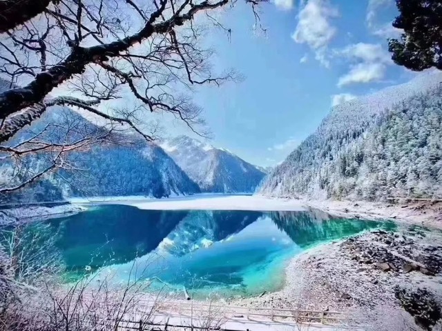 九寨沟银装素裹的林木与蓝冰叠瀑相拥,天地间唯有湛蓝与洁白相衬,如梦如幻。