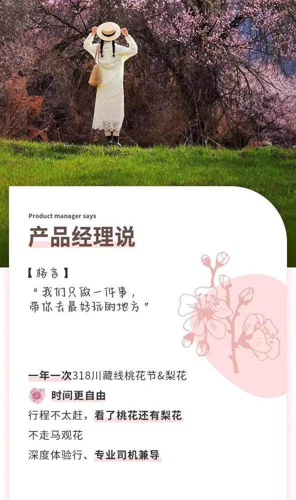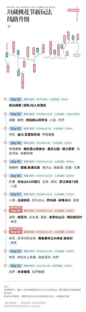 Day 01.抵达成都 | 接机/站服务 行驶里程:无 行车时间:不动车 海拔说明:540m ▶ 用餐:活动集合日,全天不含餐 ▶ 住宿:赠送成都集合日4钻酒店 今天大家由全国各地自行前往成都,我们会安排工作人员前往机场/车站接到大家前往指定酒店入住。 然后大家可以自己安排今日的自由活动啦!如果时间充裕,您可以自行去成都小酒馆坐坐,或者是去IFS广场和熊猫爬墙合个影,可以去到大熊猫繁育研究基地看望可爱的“滚滚”们,还可以去武侯祠、宽窄巷子、古街锦里感受老成都文化。 成都特色美食也是一绝,有火锅、钵钵鸡、糖油果子、钟水饺、龙抄手、红糖锅盔、还有各类“苍蝇馆子”,五花八门,色味俱佳,来之前一定要做足功课!成都饮食偏麻、辣,一定注意不要暴饮暴食、吃太辣致肠胃不适。 【注意事项】 1. 接机接站人员(联系方式会提前一天告之您),抵达后会在出口处接团; 2. 集合日为自由活动,不是正式的行程,请在自由活动时注意人身财产安全,集合日不含保险; 3. 建议队员们在集合日抵达成都后,可在市区采购一些旅行用品,如零食、佐餐小菜、药品等; 4. 未支付尾款和未签定合同的队员,可以选择到公司支付尾款,签定合同;也可以选择上车后支付尾款,签定合同。上车后支付尾款的队员,不能在车上刷卡,但可以上车后转账。 Day 02.成都 - 映秀 - 四姑娘山双桥沟 - 小金 - 丹巴 行驶里程:410km 行车时间:约6.5小时 海拔说明:540m—2900m—2360m—1860m ▶ 用餐:含酒店早餐,午餐晚餐需自理 ▶ 住宿:丹巴县城双人标间 早餐后我们从成都出发,经过映秀、卧龙抵达四姑娘山双桥沟。 四姑娘山有双桥沟、长坪沟、海子沟三个景区,其中双桥沟是游览方式最轻松、景点最集中的景区。抵达后我们乘景区观光车进入【四姑娘山双桥沟】,双桥沟全长约34.8公里,景区比较有特色的是撵鱼坝栈道,四姑娘山景区的灵秀与宏伟在这里很好地融合在一起。景区内分三段,已开发20几个景点,可观看到十几座海拨4000多米以上的雪山;前段为杨柳桥、阴阳谷、白杨林带、日月宝镜山、五色山等奇景;中段为撵鱼坝,包括人参果坪、沙棘林、尖山子、九架海等景点。 双桥沟游览结束后,我们前往到甘孜藏族自治州东部的丹巴县。 【注意事项】 (1)建议上高原前3天,不要洗澡,以免感冒引起高原反应,会影响整个行程,如果有一定的忍耐力,建议多忍耐几天,确定自己已经适应高原再洗澡; (2)藏区水电供应不足,偶尔停水停电,请自备湿巾以及手电筒,可能会出现洗澡水水温不稳定,或者在洗澡过程当中停水的现象,所以洗澡的速度要快,最好是完全适应藏区后再洗澡; (3)此日行程较长,可能会稍感枯燥,下午的金川才是我们今日的行程重点,所以沿途停车较少,敬请见谅。 Day 03.丹巴 - 金川.百里梨花海 - 甲居藏寨 行驶里程:95km 行车时间:约2.3小时 海拔说明:1860m—2160m ▶ 用餐:含酒店早餐,晚餐嘉绒藏餐,午餐需自理 ▶ 住宿:甲居藏寨民宿双人标间 吃过早餐,我们依次在甲居藏寨的三个观景台停留拍摄后,直奔我们今天的主题——金川梨花。 先前往观景台,观赏和拍摄【金川河谷】百里梨花的壮观景象。金川素有“中国雪梨之乡”的美誉,无论河坝沃土还是半山坡地,漫山遍野都栽种梨树,每到仲春三月,万亩梨海,百里白蕊,整个金川河谷似茫茫雪海。待拍摄结束后,沿大金川河向丹巴方向前进,沿途观赏大渡河谷两岸藏寨掩映在花海中的美景,这一带是丹巴嘉绒藏族文化的起源地之一,人文景观也颇多,可尽情游览拍摄。 下午返回甲居藏寨入住民宿,晚上享用独具风味的嘉绒藏餐,大口吃肉大口喝酒,用完餐我们就入住在藏寨,真正的深入体验藏家风情! 【甲居藏寨】,2005年《中国国家地理》杂志组织的选美中国活动中,以甲居藏寨为代表的“丹巴藏寨”被评为“中国最美的六大乡村古镇”之首。这是最具嘉绒藏族特色的村寨,“甲居”藏语是百户人家之意,藏寨建筑运用红白黑色,依山而建,从大金河谷层层向上攀缘,一直伸延到卡帕玛群峰脚下,整个山寨依着起伏的山势迤逦连绵,在相对高差近千米的山坡上,一幢幢藏式楼房洒落在绿树丛中,配上蓝天白云,金黄的玉米,满树果子,景色非常壮观。 【注意事项】此日行程较长,可能会稍感枯燥,下午的金川才是我们今日的行程重点,所以沿途停车较少,敬请见谅。 Day 04.甲居藏寨 - 雅拉雪山观景台 - 墨石公园 - 塔公草原 - 玛尼河谷 - 新都桥镇 行驶里程:210km 行车时间:约5小时 海拔说明:1860m—3060m—3500m—3730m—4200m—3630m ▶ 用餐:含酒店早餐,中晚需自理 ▶ 住宿:新都桥镇酒店双人标间 今天我们的行程进入密集的景观带,早餐后出发,经远眺雅拉雪山的最好观测点——【雅拉雪山观景台】,雅拉雪山海拔5820米,目前依然是处女峰,未有攀登者成功登顶,因此眺望它是最寻常的方式之一,看皇冠状的峰顶覆着皑皑白雪,犹如披上了一条圣洁的哈达。这里是雅拉雪山的最佳观赏点,雅拉雪山是佛教二十四神山之一,登上观景台远观白雪覆盖的圣洁【雅拉神山】。 然后我们抵达八美【墨石公园】。这里被称为“中国地质百慕大”,也有人说这里是“川西的冰岛”,是我国唯一的高原石林景观,同时也是318道上新晋的网红打卡地,具有“春赏格桑夏避暑,秋观彩林冬踏雪”的风光;墨石公园有着许多千姿百态的奇幻墨石,忽而是高耸绿地又忽而裸露出冷峻的黑灰岩面,参差起落极具外星球