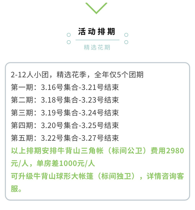 以上排期安排牛背山三角帐(标间公卫)费用2980元/人,单房差1000元/人