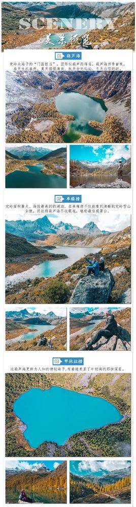 全年组队33期,欢迎独立定制 第01期:04月20日集合-04月24日 第02期:04月30日集合-05月04日 (五一节) 第03期:05月01日集合-05月05日 (五一节) 第04期:05月11日集合-05月15日 第05期:05月18日集合-05月22日 第06期:05月25日集合-05月29日 第07期:06月01日集合-06月05日 第08期:06月08日集合-06月12日 (端午节) 第09期:06月15日集合-06月19日 第10期:06月22日集合-06月26日 第11期:06月29日集合-07月03日 第12期:07月06日集合-07月10日 第13期:07月13日集合-07月17日 第14期:07月20日集合-07月24日 第15期:07月27日集合-07月31日 第16期:08月03日集合-08月07日 第17期:08月10日集合-08月14日 第18期:08月17日集合-08月21日 第19期:08月24日集合-08月28日 第20期:08月31日集合-09月04日 第21期:09月07日集合-09月11日 第22期:09月14日集合-09月18日 (中秋节) 第23期:09月21日集合-09月25日 第24期:09月30日集合-10月04日 (国庆节) 第25期:10月01日集合-10月05日 (国庆节) 第26期:10月02日集合-10月06日 (国庆节) 第27期:10月12日集合-10月16日 第28期:10月19日集合-10月23日 第29期:10月26日集合-10月30日 第30期:11月02日集合-11月06日 第31期:11月09日集合-11月13日 第32期:11月16日集合-11月20日 第33期:11月23日集合-11月27日 全年执行基础价:2280元/人,国庆黄金周执行价:2880元/人 Day1:全国各地-成都 今日全国各地的队友将来到成都集合,统一入住我俱乐部安排的酒店。如果您的时间比较宽裕,建议各位朋友尽量早些到达,漫步游走,在各类小吃及景点中感受慢生活的成都。还可以自行安排在成都市区的旅游活动,推荐游玩地点:【锦里古街】、【武侯祠】、【宽窄巷子】,以及国内十大商业街之一的【春熙路】。美食推荐:在锦里和宽窄巷子有众多成都小吃:龙抄手、担担面、肥肠粉、冒菜。品尝成都特色美食,感受天府之国的休闲生活,相信绝对会让大家深深地体会到什么是“休闲之都”啦! 餐饮:全天餐费自理 住宿:成都酒店双人标间 海拔:成都约500米 温馨提示:集合日为自由活动,不是正式的行程,请在自由活动时注意人身财产安全,集合日不含保险。到集合酒店报“党岭徒步+姓名”拿房,房费已付,押金自付,活动报名截止后,我们才开始预定房间。在出发前3天,客服内勤会将酒店信息发送到您的手机,请及时回复,如客服内勤未收到您短信回复,则会与您取得电话联系,集合当日21:00前领队将会与您取得联系,告知次日出发时间等具体出行提示。 Day2 :成都-四姑娘山-中路藏寨 早餐后在酒店门口集合,乘车经成灌高速前往巴郎山,在观景台拍摄四姑娘山全景后,中午抵达四姑娘山镇午餐,之后沿小金川一路下行前往美人滋养之地丹巴,下午时分到达墨尔多神山下的丹巴中路藏寨,在这里快节奏的生活瞬间变慢,感受嘉绒藏乡风情,品藏寨特色晚餐。 餐饮:含早餐、嘉绒晚餐,午餐自理 住宿:中路藏家双人标间 海拔:中路藏寨约2200米 温馨提示:全天320km,行车约6小时,中路藏寨隐世纯朴,藏家住宿条件舒适整洁,硬件设施不比酒店齐全。 Day3:丹巴藏寨-卡尔杂-甲依拉措-党岭村 早晨徒步前往观景台欣赏藏寨全景,清晨的藏寨、云雾、光线共同构建了一幅幅水墨之境,之后乘车前往党岭村,安排好住宿后,收拾当天所需的装备开始向卓依拉措进发,从村内乘车约40分钟抵达徒步起点,徒步约2-3小时到达甲依拉措湖旁,此湖一年迎接的客人不足200人,并且湖水常年呈现乳白色,当地又称“牛奶海”。从这里仰望党岭三神山又是另一种风景,下午时分我们开始沿河谷下撤回到公路旁,乘车返回党岭村。 餐饮:含早餐、晚餐,午餐自理 住宿:党岭藏家标间/多人间 海拔:甲依拉措4000米、党岭村3400米 温馨提示:全天行车70km,徒步往返12km约5H,也可以选择骑马或者摩托车,费用及安全需自理。 Day4 :党岭村-飞机坪-葫芦海-卓雍措-党岭村 早餐后整理好装备出发,徒步进入横断山脉中最迷人的胜地。沿途欣赏党岭迷人的自然风光。沿着柯鲁河谷上行,来到美丽的葫芦海。葫芦海是状似葫芦的湖泊,由一大一小的两个湖泊组成,继续前景能观赏到小葫芦海,从小葫芦海爬升约200米后抵达最佳观景位,往东侧是全景葫芦海,往西侧是三神山下的卓雍措湖,在冰川的加持下越发神圣,下午时分原路返回党岭村。 餐饮:含早餐、晚餐,午餐自理 住宿:党岭藏家标间/多人间 海拔:葫芦海4100米、卓雍措4300米 温馨提示: (1)党岭村-葫芦海-卓雍措往返徒步17km,约7-8小时。 (2)党岭村前往葫芦海可徒步或者骑马前往,若需骑马需提前一天像当地马帮订马(骑马单边价格为200元、往返为400元),骑马属于个人行为,若发生摔马等事件与本俱乐部无关。 (3)葫芦海距卓雍措单边距离为2km,徒步往返时间需3-4小时,请自行评估体能时间。 (4)葫芦海周围无餐食提供点,故今日需自备一顿路餐。 (5)高原天气变化莫测,前往葫芦海徒步请自行准备防雨。 Day5 ;党岭村-丹巴-泸定-成都 早餐后告别美丽的党岭,过丹巴经瓦丹路抵达泸定后,沿雅康高速返回成都,结束精彩的横断秘地徒步之旅。 餐饮:含早餐,午餐、晚餐自理 住宿:自理,可代订 海拔:成都约500米 温馨提示:党岭村-成都车程约7H,到达成都的时间大约在下午5点左右,建议订8点以后的机票。 费用说明 【费用包含】 1、交通:当地全程交通费用,根据人数选择合适车型。 2、住宿:按照行程所列标准入住(1晚酒店+3晚藏家客栈)。 3、餐饮:4早餐,3晚藏家晚餐。 4、门票:党岭卫生费、甲依拉措门票。 5、领队