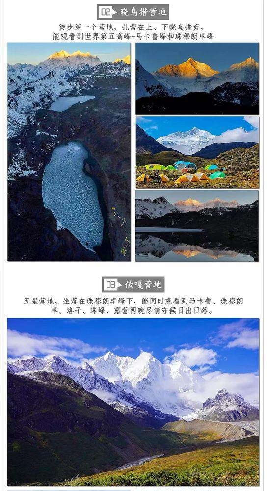 2024全年排10期,6人起发,团队欢迎定制 第一期:04月30日-05月11日 五一节特价9980元/人 第二期:05月11日-05月22日 山花季 第三期:05月18日-05月29日 山花季 第四期:05月25日-06月05日 山花季 第五期:06月01日-06月12日 山花季 第六期:06月08日-06月19日 端午节 第七期:06月15日-06月26日 山花季 第八期:09月15日-09月26日 中秋节 第九期:09月26日-10月07日 国庆节 第十期:10月01日-10月12日 国庆节 全年执行价:常规团期;”10500元/人,国庆节11500元/人 【线路介绍】 在世界最高峰下徒步,珠峰东坡徒步路线毫无疑问是一条经典的户外徒步线路,被誉为“世界十大景观”之一、“世界十大经典徒步线路”之一。每年都有一些国外的摄影师和驴友想尽办法办手续都要到珠峰东坡来徒步拍摄。沿途可以欣赏到众多六、七千米的雪山,同时可以欣赏到珠峰(世界第一)、洛子峰(世界第四)、马卡鲁峰(世界第五)。这个地区的特点主要是海拔高(平均海拔在4000m以上),雪山融水形成湖泊众多,天气好时能近距离欣赏雪山的震撼之美。珠峰东坡线路上人迹罕至,生态原始,水源丰富,珍稀动植物时有所见,星星点点的高山湖泊如宝石般散布,加之嘎玛沟沟谷幽深,景色非常之迷人。除了嘎玛沟之外,我们还要经过兰花谷、穷卓谷,夏季是观赏高山杜鹃的绝佳之地,秋天则是户外摄影的不二之选。我们的活动安排13天,其中车程3-4天,徒步8-9天,每天5~8小时,大约9~15公里,中上难度,有一定高海拔徒步露营经验者都可完成。5月6月初和9月底最佳,7月8月为雨季,山峰经常被云雾所遮挡,但难得的云海景观这时候才有,5月底6月初除了观看壮美的雪山也是观赏高山杜鹃盛开的季节,9月底雨季过了,天气清澈透蓝,是拍摄雪山的最佳时间。 【线路亮点】 1、这是一次世界顶级徒步圆梦之旅,这里与世隔绝,远离城市的喧嚣,珍稀野生动植物繁多,高原湖泊星罗棋布,风景非震撼两字能形容......2、这条带有探险性质的高海拔深度行摄线路,可以近距离欣赏我国喜马拉雅核心地带的世界第一高峰-珠峰、世界第四的洛子峰、世界第五的马卡鲁以及全景都在中国境内的第二高山峰珠穆朗卓等世界级雪山带来的震撼之美,人迹罕至,恍若梦中的香格里拉。3、我们有一天两夜的时间在措学仁玛停留,可尽情拍摄雪山、倒影以及星空。4、本次活动由专业户外领队+当地藏族向导全程服务。5、本线路统一提供露营高山帐(2人一顶)+蛋槽防潮垫。提供卫星电话、急救包、急救钢瓶氧气等公用装备。6、全程提供桌椅板凳,以及餐厅帐和炊事帐篷,每天都可以在营地坐着享受营地生活。7、全程轻装徒步、无需负重,提供早晚丰富营地餐+营地水果、饮料,吃饱才有力气徒步。8、全程提供户外电源,晚上提供手机,相机,无人机充电。9、自营产品,品质保障。 行程安排 D1:拉萨集合(海拔3665米) 今天为集合日,晚上8点领队将在集合酒店给大家开行前说明会。建议提前2-3天到达拉萨适应、调整状态。提前到达的队员可以去大昭寺、八廓街、布达拉宫等市内景点逛逛。 住宿:拉萨4星级酒店标间 用餐:含晚餐欢迎晚宴 D2:拉萨-羊湖-日喀则(海拔3800米) 早上8点左右酒店集合出发,乘车前往日喀则。经羊湖,宁金抗沙雪山 ,卡若拉冰川、满拉水库、远观江孜古堡后经年楚河谷地来到后藏首府日喀则。时间允许还可以前往扎什伦布寺游玩,今天也以适应为主。 住宿:日喀则酒店标间 用餐:含早餐,中晚自理AA D3:日喀则-扎西宗-曲当乡(3700米) 酒店早饭后出发,途中翻越加乌拉垭口(5200米),在加乌拉山上能看到5座8000米以上的山峰(珠峰(第一)、洛子峰(第四)、马卡鲁峰(第五)、卓奥友峰(第六)、希夏邦马峰(第十四)。进入珠峰自然保护区,下午到达曲当乡。 住宿:曲当乡多人间 用餐:含早餐,中晚自理AA D4:曲当乡-优帕村-晓乌措(4300米) (徒步第1天)早上我们乘车前往徒步起点优帕村,从优帕村开始徒步,一路缓坡上行。飘荡在山间的云雾和刺眼的阳光,至晓乌拉垭口下的晓乌措湖畔露营。期间大约有三个比较大的爬升,整个行程用时约6个小时。晓乌错是晓乌拉垭口下的一个高山湖泊,这里天气好的情况下,可以看到马卡鲁峰和珠穆郎卓峰。 徒步数据:徒步约5小时,约10km,上升900m 住宿:帐篷露营 用餐:营地早晚餐、路粮午餐 D5:晓乌措-晓乌拉(4900米)-卓湘兰花谷(4000米) (徒步第2天)早起用餐,天气好的话我们将看到马卡鲁和珠穆郎卓的日照金山以及它们在晓乌错的倒影!此处是整个行程中观看马卡鲁峰的最佳地点之一。中午翻越晓乌拉垭口(4900米),陡坡下降到嘎玛沟的起点卓湘(4030米)山谷地带。一路感受植被的变化。下午沿谷行走,抵达营地兰花谷(兰花谷是通往珠峰东坡和嘎玛沟的分路点)。 徒步数据:徒步约7-9小时,约17km,上升350m/下降900m 住宿:帐篷露营 用餐:营地早晚餐、路粮午餐 D6:兰花谷-措朗湖-夏侬牧场-汤湘观景台(4510米) (徒步第3天)从兰花谷沿原始森林上行,植被垂直分布状态明显,到达山脊后可俯瞰嘎玛沟全貌,如果有缘更可以邂逅马卡鲁峰(8463米)。中午到达雪山怀抱的措朗湖。湖水经过一个泄水口注入嘎玛沟内,措郎山谷两端雪山相映。午后翻过一个垭口就到达了野花灿烂的夏侬牧场,然后一路都比较平坦,一直到达今天的营地汤湘观景台营地。 徒步数据:徒步约7-8小时,约14km,上升550m 住宿:帐篷露营 用餐:营地早晚餐、路粮午餐 D7:汤湘观景台-巴当-俄嘎(4690米) (徒步第4天