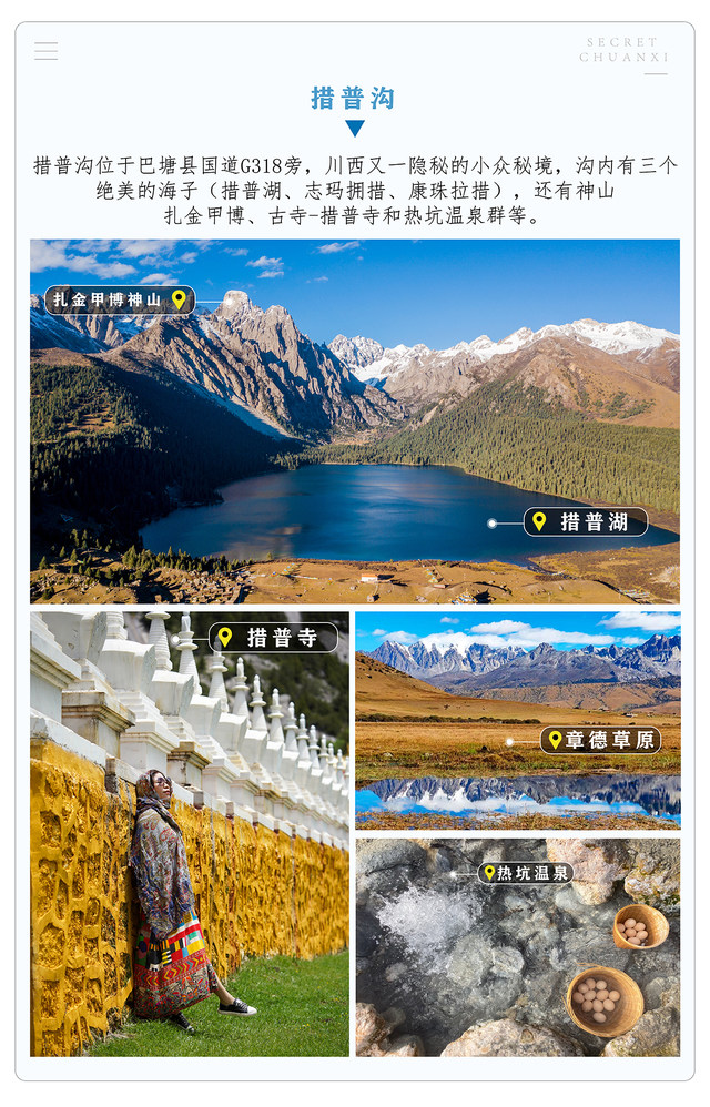 全年组队30期,D1为成都集合日期,次日(D2)正式出发,集合日成都当晚住宿酒店由我们安排。节假日略有调整。 第01期:04月30号-05月05号 –五一节 第02期:05月10号-05月15号 第03期:05月17号-05月22号 第04期:05月24号-05月29号 第05期:05月31号-06月05号 第06期:06月07号-06月12号 –端午节 第07期:06月14号-06月19号 第08期:06月21号-06月26号 第09期:06月28号-07月03号 第10期:07月05号-07月10号 第11期:07月12号-07月17号 第12期:07月19号-07月24号 第13期:07月26号-07月31号 第14期:08月02号-08月07号 第15期:08月09号-08月14号 第16期:08月16号-08月21号 第17期:08月23号-08月28号 第18期:08月30号-09月04号 第19期:09月06号-09月11号 第20期:09月13号-09月18号 –中秋节 第21期:09月30号-10月05号 –国庆节 第22期:10月01号-10月06号 –国庆节 第23期:10月02号-10月07号 –国庆节 第24期:10月11号-10月16号 第25期:10月18号-10月23号 第26期:10月25号-10月30号 第27期:11月01号-11月06号 第28期:11月08号-11月13号 第29期:11月15号-11月20号 第30期:11月22号-11月27号 全年执行活动价格:3280元/人,国庆节活动价格:3880元/人 D1:成都集合 今日全国各地的队友将来到成都集合,统一入住我俱乐部安排的酒店。如果您的时间比较宽裕,建议各位朋友尽量早些到达,漫步游走,在各类小吃及景点中感受慢生活的成都。还可以自行安排在成都市区的旅游活动,推荐游玩地点:【金沙遗址】、【武侯祠】、【杜甫草堂】、【熊猫基地】,以及国内十大商业街之一的【春熙路】。 美食推荐:在锦里和宽窄巷子有众多成都小吃:龙抄手、担担面、肥肠粉、冒菜。品尝成都特色美食,感受天府之国的休闲生活,相信绝对会让大家深深地体会到什么是“休闲之都”啦! 餐饮:自理; 住宿:成都市区精品酒店(双人标间独卫); 海拔:成都约500米; 温馨提示:集合日为自由活动,请在自由活动时注意人身财产安全。到集合酒店报“+姓名”拿房,房费已付,押金自付,活动报名截止后,我们才开始预定房间。一般在出发前3天,我们会将酒店信息发送到您的手机。 D2:成都-康定-新都桥-黑石城-雅江 酒店早餐后出发,经雅康高速过兴康特大桥后到达甘孜州州府-康定,简单休整后翻越康巴第一关-折多山4298米,约中午时分抵达摄影家走廊-新都桥午餐,后经过高尔寺山前往黑石城,这里是拍摄贡嘎山的最佳位置,是同时眺望贡嘎雪山与雅拉雪山空中距离最短的地方,尽情拍摄后晚上入住雅江县城酒店。 餐饮:自理; 住宿:雅江精品酒店(双人标间独卫); 海拔:新都桥约3300米,雅江约2600米; D3:雅江-理塘县-千户藏寨-格聂之眼-冷古寺/乃干多村 酒店早餐后出发,经剪子弯山、卡子拉山到达世界高城-理塘4014米,县城午餐后,带领大家领略世界高城的魅力,不止有汤浓味美的牦牛汤锅,还有国道G318打卡点、勒通古镇-千户藏寨等。后驱车翻越铁匠山垭口,这里草甸连绵,怪石嶙峋,高原海子如珍珠般散落,仿佛来到异域星球。经过几处天然的温泉泉眼,有兴趣的朋友还可以停下来泡泡脚,经过丁真的家乡-下则通村后,大约20分钟的车程抵达格聂之眼。它静谧地躺在格聂神山下,从高处俯视宛如一只水汪汪的大眼睛,这里视野开阔绵延的草甸尽头耸立着格聂、喀麦隆、肖扎三座神山,我们在此处守候日落,晚上入住冷古寺或乃干多村宾馆。 餐饮:自理; 住宿:冷古寺/乃干多村宾馆(双人标间); 海拔:理塘约4014米,格聂之眼约3800米,铁匠山垭口约4700米 ,冷古寺约3600米; 温馨提示: 1、喇叭垭乡-下则通村-格聂之眼-冷古寺路况大多为土石路面,会有点颠簸; 2、冷古寺宾馆、乃干多村条件一般,冷古寺没有信号; D4:冷古寺/乃干多村-格木村-巴塘/措拉镇 宾馆早餐后出发,冷古寺藏有三宝(母鹿角、反转法螺、格聂之心)感兴趣的朋友可花费10-30元的费用参观格聂三宝。后我们驱车穿越格聂南线前往瑞士风光的格木村,沿线车辆极少、人烟罕见、格聂神山相伴、独享独享这一片大自然的极美风光,晚上入住巴塘县或措普沟沟口酒店。 餐饮:自理; 住宿:巴塘或措拉镇酒店标间; 海拔:巴塘县海拔约2600米; 温馨提示: 1、今日请准备部分路餐,沿途村庄没有餐饮条件 D5:巴塘/措拉镇-措普沟一日游玩-理塘县/雅江 酒店早餐后进入措普沟景区游玩,这里有遗世独立的湖泊 【措普湖、志玛拥措、康珠拉措】,有金色草甸和成群的岩羊,有治愈的温泉【热坑温泉群】,还有以扎金甲博为首的雪山群,我们可先乘观光车、电瓶车先抵达沟内最深处的措普寺,再徒步一一游览出沟,下午前往理塘县酒店入住。 餐饮:自理; 住宿:理塘县/雅江精品酒店; 海拔:措普寺约4160米; 温馨提示: 1、今日请准备午餐,景区内没有餐饮条件 D6:理塘县/雅江-新都桥-康定-成都 酒店早餐后出发,沿G318国道翻越卡子拉山过剪子弯山、高尔寺山回到新都桥,下午经雅康高速回到成都,结束本次活动。 餐饮:自理; 住宿:自理,可代订; 海拔:成都约540米; 温馨提示: 1、今日返程,如遇堵车、交通管制可能影响原定航班和车次,建议大家定22:00以后的票; 【费用包含】 1、交通:全程进山往返交通费用,安排5-12座车,精品小团出行; 2、住宿:按行程所列标准入住5晚,包含活动前一晚赠送成都酒店住宿(如不住成都赠送酒店,费用不退)。冷古寺、措普沟口相对住宿条件一般请做好心理准备。 3、餐饮:赠送理塘牦牛肉汤锅1顿 4、保险:专业户外旅行保障险,游客意外险,最高保险额100万元。(不含财产险,贵重物品请
