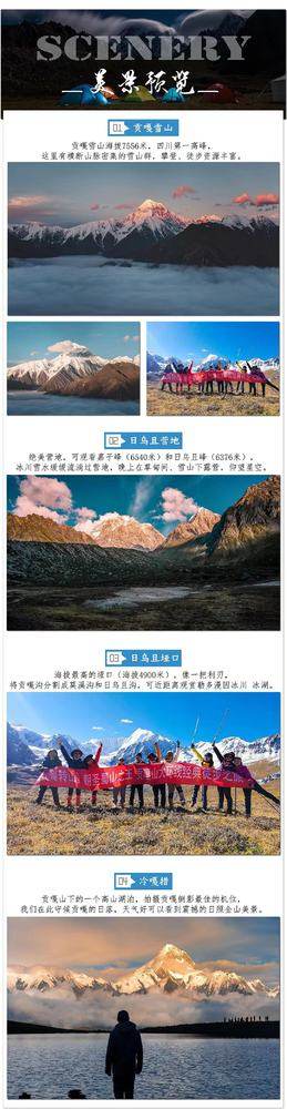 D1:成都集合 今日全国各地的队友将来到成都集合,统一入住我俱乐部安排的酒店。如果您的时间比较宽裕,还可以自行安排在成都市区的旅游活动,推荐游览锦里、武侯祠、杜甫草堂、宽窄巷子等景点,品尝成都特色美食,感受天府之国的休闲生活,相信绝对会让大家深深地体会到什么是“休闲之都”啦! 住宿:成都市区酒店(双人标间) 餐饮:全天餐费自理 海拔:成都约540米 D2:成都-雅安-二郎山-泸定-康定-老榆林-电站-格西草原 早餐后在酒店门口集合乘车经成雅高速前往雨城雅安,沿途欣赏川西田园风光。下高速沿318国道一路西行,伴着秀美青衣江途径二郎山隧道、大渡河、泸定桥,康定城,一路行摄,康定城采购物资后继续前进,在老榆林村换乘小车前往格西草原露营。 住宿:格西草原露营 餐饮:酒店含早,午餐自理,营地晚餐 需时:约360km,行车7小时左右; 海拔:格西草原约3400米 D3:格西草原-两岔河-下日乌且-上日乌且 早餐后向上日乌且进发。沿途欣赏高原风光,2小时后到达大河坝,河对岸隐约出现大面积红石滩,领队带领大家稍微驻足拍照。一路向南,沿途欣赏田海子雪山(海拔6070米)、小贡嘎(海拔6027米),晚上抵达上日乌且(海拔4350米)扎营。 住宿:上日乌且营地露营 餐饮:营地早餐,午餐(路餐)自理,营地晚餐 需时:约17km、徒步7.5小时左右 海拔:老榆林3200米、下日乌且4100米、上日乌且4350米 D4:上日乌且-日乌且垭口-莫溪沟尾营地(勒多漫因BC) 早餐后拔营出发,开始翻越日乌且垭口,海拔高度上升700米,一路爬升直观感受高山植被的变化。沿途欣赏小贡嘎、嘉子峰、日乌且冰川风光,及其冰川、高山湖泊,运气好的话在垭口附近还可以发现古生物化石。傍晚在莫溪沟尾扎营。体力不支者可在日乌且牧场雇佣马匹骑马上山(仅限夏及秋季)。 住宿:莫溪沟尾营地露营 餐饮:营地早餐,午餐(路餐)自理,营地晚餐 需时:约16km、徒步6小时左右 海拔:上日乌且4350米、日乌且垭口海拔4920米、莫溪沟尾营地4100米 D5:莫溪沟营地(勒多漫因BC)-龙结蔓垭口-玉龙西村(泉华滩) 早餐后莫溪沟营地出发,一路缓坡翻越龙结蔓垭口,垭口处我们能提前观看到贡嘎主峰的雪山群,6 7 8月山坳处野花遍地,与远处的雪山遥相呼应,美不胜收。翻越垭口后一路下缓坡,沟底乘车前往玉龙西村藏家入住。时间尚早即前往泉华滩游玩。 住宿:玉龙西村藏家多人间 餐饮:营地早餐,午餐(路餐)自理,藏家晚餐 需时:约8km、徒步5小时左右 海拔:莫溪沟尾营地4100米、玉龙西村3700米 D6:玉龙西村-冷嘎措-玉龙西村 藏家早餐后前往冷嘎措,需要徒步大概3个小时抵达,体力不好的可以选择骑马上山,冷嘎措被誉为贡嘎山的一滴眼泪,也是拍摄贡嘎群山倒影最佳的地方,傍晚时分日照金山倒影在冷嘎措湖中,水天相接,很庆幸能用眼睛记录下这壮观的美景,根据大家的身体情况,看完日落原路返回。 住宿:玉龙西村藏家多人间 餐饮:营地早餐,午餐(路餐)自理,藏家晚餐 需时:约10km 、徒步5小时左右 海拔:冷嘎措4550米 D7:玉龙西村-子梅垭口-子梅村-草科(或石棉) 从玉龙西村出发,乘车前往子梅垭口观看日出,子梅垭口是拍摄贡嘎山的最佳观景平台,朝拜贡嘎神山后乘车到子梅村开始徒步,抵达巴望海后一路顺着巴望海边沿在山林里漫步俯视巴望海的全貌。休整吃过午饭后,徒步至界碑石,乘车沿田湾河抵达草科,体验草科的天然温泉,晚上入住草科(或石棉)酒店。 住宿:草科或石棉酒店(双人标间) 餐饮:早餐,午餐路餐自理,草科或石棉晚餐 需时:约18km、徒步6小时左右 海拔:下子梅村3400米、草科1500米 D8:草科或石棉-雅安-成都 早餐后出发上雅西高速经雅安返回成都,散团后大家可以自由游览。返回成都的时间约下午3点左右,建议订六点以后的机票返程。 住宿:自理 餐饮:含早、午餐,晚餐自理 需时:约330km、行车5小时左右 海拔:草科1500米、成都540米 【备选行程】 在活动执行过程中,如因天气因素(大雪等)导致日乌且垭口无法通过,行程则调整如下: D1:成都集合 D2:成都-康定-格西草原 D3:格西草原-两岔河-盘盘山营地 D4:盘盘山营地-垭口-玉龙西村 D5:玉龙西村-泉华滩-冷嘎措-玉龙西村 D6:玉龙西村-子梅垭口-贡嘎寺-子梅村 D7:下子梅村-巴王海-草科-石棉 D8:石棉-成都 费用说明 【费用包含】 1.交通:进出山大交通费用,根据人数选择合适车型(含老榆林村路口-格西草原中转车,玉龙西村路口-玉龙西村中转车,玉龙西村-冷嘎措中转车,玉龙西村-子梅垭口-子梅村中转车) 2.住宿:按照行程所列标准入住(2晚酒店+2晚藏家+3晚露营)。 3.餐饮:7早6正含营地餐,营地晚餐一般为2荤2素1汤,营地早餐有粥、面包或者馒头大饼、咸菜。 4.门票:冷嘎措环保费、巴望海环保费、草科温泉票。 5.领队:专业户外领队全程服务。 6.马匹:进山装备马匹驮运费用(个人装备限重20kg)。 7.装备:活动所需要的公用装备。 8.组织:户外活动组织费。 9.其他:沿途过路费,过桥费,营地费。 10.保险:活动期间户外高原组合意外保险130万。 【费用不含】 1.其他个人消费、个人骑马等。 2.路餐5顿自理。 3.非行程所列中转车费用。 注意事项 【个人装备】 大背包(60L左右),小背包(20L左右),睡袋(极限温度-15度)、冲锋衣裤、抓绒衣裤、羽绒服、帽子、墨镜、手套、头巾、登山杖、水壶、登山鞋、雪套、袜子多双、防晒霜、唇膏、个人特殊药品、头灯或手电、个人餐具、洗漱用品、雨具、泳装、冰爪(