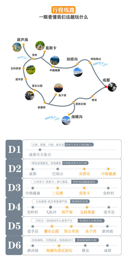 第01期:04月30号-05月05号 –五一节 第02期:05月10号-05月15号 第03期:05月17号-05月22号 第04期:05月24号-05月29号 第05期:05月31号-06月05号 第06期:06月07号-06月12号 –端午节 第07期:06月14号-06月19号 第08期:06月21号-06月26号 第09期:06月28号-07月03号 第10期:07月05号-07月10号 第11期:07月12号-07月17号 第12期:07月19号-07月24号 第13期:07月26号-07月31号 第14期:08月02号-08月07号 第15期:08月09号-08月14号 第16期:08月16号-08月21号 第17期:08月23号-08月28号 第18期:08月30号-09月04号 第19期:09月06号-09月11号 第20期:09月13号-09月18号 –中秋节 第21期:09月30号-10月05号 –国庆节 第22期:10月01号-10月06号 –国庆节 第23期:10月02号-10月07号 –国庆节 第24期:10月11号-10月16号 第25期:10月18号-10月23号 第26期:10月25号-10月30号 第27期:11月01号-11月06号 第28期:11月08号-11月13号 第29期:11月15号-11月20号 第30期:11月22号-11月27号 全年执行活动价格:2980元/人,国庆节活动价格:3580元/人 D1:宇宙各地-—成都集合 各位队友陆续抵达成都,根据集合短信地址到酒店前台办理登记入住。机场或火车站前往酒店的路线,可以使用手机地图导航或咨询客服。如果您的时间比较宽裕,可以选择去武侯祠、杜甫草堂、金沙遗址博物馆、熊猫基地等市区景点参观;也可以去宽窄巷子、锦里、琴台路享受成都慢时光,漫步古巷,河边品茶,掏个耳朵。成都也是一座美食之都,川菜、火锅、小吃等都有非常多的选择。 餐食:全天餐饮自理。 住宿:成都市区酒店( 双人标间) 海拔:成都约540M 温馨提示:集合日为自由活动,不是正式的行程,请在自由活动时注意人身财产安全,集合日不含保险。到集合酒店报自己姓名拿房,房费已付,押金自付,活动报名截止后,我们才开始预定房间。一般在出发前3天,我们会将酒店信息发送到您的手机。 D2:成都-都江堰-四姑娘山-小金县-丹巴-中路藏寨 早上车辆前往酒店接纳,沿成灌高速一路向北驶出成都平原后,经卧龙熊猫沟以及壮阔的巴郎山后抵达我们摄影的第一站四姑娘山,巍峨的四姑娘耸入云端,午餐后游玩双桥沟,下午顺小金川到达中路藏寨,入住藏式民居(乡村藏式别墅),体验地道嘉绒藏族的生活。 餐食:含早餐、午餐自理、赠送嘉绒晚餐。 住宿:中路藏式标间 海拔:中路藏寨2200米 D3:中路藏寨-丹巴-二瓦曹-磨子沟-莫斯卡-党岭村 早上早起,清晨的中路藏寨,在观景点拍摄中路全景。之后乘车前往莫斯卡村。丹巴县城距莫斯卡78KM,由于道路路况较烂,行车时间较长。其中进入莫斯卡的磨子沟,沟内风景绝佳,可沿途边走边拍。大约4小时后可到达莫斯卡村内,到达后可随意逗乐当地精灵-土拨鼠。下午时分乘车前往党岭村。(时间允许可徒步或乘摩托车前往野温泉) 餐食:含早餐、午餐自理(自备)、赠送晚餐。 住宿:党岭村标间或者多人间 海拔:莫斯卡海拔3900米 党岭村海拔3400米 特别提醒: (1)二瓦槽到莫斯卡村的道路为乡村道路,路况较复杂。 (2)党岭村有三处温泉,分别离村落3.5km;4km;5km,前往只能徒步或搭乘当地摩托车(摩托车往返150元\\\\\\\\\\\\\\\\\\\\\\\\\\\\\\\\\\\\\\\\\\\\\\\\\\\\\\\\\\\\\\\\辆),温泉每年10月会有人收费,其余时间均为免费 D4:党岭村-党岭葫芦海/甲依拉措-党岭村-道孚县 早餐之后我们出发徒步,穿越村子西边的密林很快便可到达大草坪,这里可俯瞰整个党岭村,配合早上的光影,党岭简直就是仙境。越过大草坪再次进入松罗满枳的松树林。穿越树林后飞机坪赫然出现在眼前。从飞机坪徒步1小时便可来到葫芦海下方的甘海子,这里鱼、蝌蚪、蝾螈成群,之后再徒步20分钟便可到达美丽的葫芦海。葫芦海周围有3处湖泊,分别为小葫芦海、卓雍措、卓依拉措。若体能尚好到达葫芦海时间尚早者,可经小葫芦海前往美丽的卓雍措。下午返回党岭村,乘车经玉科草原前往道孚县入住。 餐食:早餐含、午餐为路餐(自备)、晚餐自理 住宿:道孚县酒店标间 海拔:葫芦海4100米、道孚县2900米 特别提醒: (1)党岭村前往葫芦海可徒步或者骑马前往,若需骑马需提前一天像当地马帮订马(骑马单边价格为200元、往返为400元),骑马属于个人行为,若发生摔马等事件与本俱乐部无关。 (2)葫芦海距卓雍措单边距离为2km,徒步往返时间需3-4小时,请自行评估体能时间 (3)葫芦海周围无餐食提供点,故今日需自备一顿路餐 (4)高原天气变化莫测,前往葫芦海徒步请自行准备防雨具 (5)如是定制、独立团队,经协商可把葫芦海更换为甲依拉措,行程更为轻松。 D5:道孚县-雅拉雪山-雅拉友措-鱼子西-新都桥 今日早餐后出发,前往雅拉雪山景区,徒步雅拉友措湖,乘景区观光车后徒步约2.5公里即可到达,海子位于雅拉雪山西侧,碧绿的湖水映衬着飘扬的经幡,让人心旷神怡,下午时分驱车前往【鱼子西曲莫贡】,小众秘境,海拔4200米,被贡嘎群山、四姑娘山、雅拉神山、青绕神山环绕,360度的观景平台,在此守候日落,拍摄绝美的粉色日照金山,晚上入住新都桥酒店。 餐食:早餐含,午餐自理、晚餐自理 住宿:新都桥酒店标间 海拔:新都桥镇3000米 特别提醒: 鱼子西如遇政策、疫情变动可能会取消此景点 D6:新都桥-斯丁措-彩虹公路-成都 早餐后新都桥出发,在康定机场边有一个非常隐秘的海子-斯丁措,可远眺贡嘎,拍摄群山倒影。在彩虹路打卡公路大片后乘车返回成都结束本次活动。 餐食:早餐含、午餐自理、晚餐自理 住宿:自理 海拔:成都540米 费用包含 1、交通:全程进山往