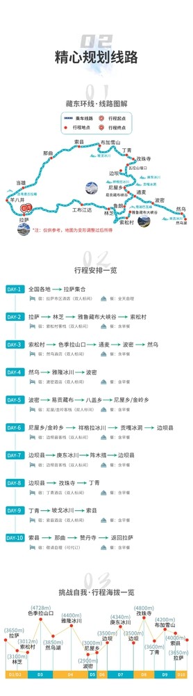 D1全国各地-拉萨集合 今日全国各地的队友将来到拉萨集合,统一入住我俱乐部安排的酒店。如果您的时间比较宽裕,可以自行安排在拉萨市区的旅游活动。拉萨火车站距市区10公里,可打车到集合酒店。贡嘎机场距拉萨市区65公里,可乘坐机场大巴到拉萨贡嘎机场乘车点民航局门口下车,再打车到集合酒店办理入住,当天尽量少运动,多休息。晚上会统一召开行前见面会,讲解本次活动注意事项。 餐饮:自理 住宿:拉萨酒店 海拔:拉萨3650米 温馨提示: 1、拉萨机场大巴费用30元(有航班就有班次),打车费用300元左右; 2、如果时间宽裕的话,建议可以提前1-2天抵达拉萨,适应海拔; 3、注意不要剧烈运动,当天请不要洗澡,可多吃蔬菜、水果,多喝水,不能饮酒。一般过1-2天后,以上症状都会逐步减轻或消失。 D2拉萨-林芝-雅鲁藏布大峡谷-索松村 今天到达的目的地是有“西藏江南”之称的林芝索松村,其海拔较低,大家正好做进一步的调整,以适应高原环境。在3月底,经林拉高速进入林芝后,从工布江达开始沿路盛开的桃花让人流连忘返。中国最美的春天在西藏,西藏最美的春天在林芝,林芝最美的春天则藏在一个小村庄里,我们将深入雅鲁藏布大峡谷内的索松村,这里是拍桃花和南迦巴瓦峰的绝佳位置。傍晚我们便到达索松村入住,大家可尽情地拍摄南迦巴瓦。冬季天气较稳定,大家可在此守候日照金山。 餐饮:含早餐;午、晚餐自理 住宿:索松村客栈(双人标间) 海拔:索松村海拔3012米 需时:全程约480km,行车6小时左右 D3索松村-色季拉山口-通麦-波密-然乌 早餐后出发翻越色季拉山口:位于八一镇的东南侧,是川藏线上著名的地标。色季拉山口海拔4728米,视野开阔,可以远眺到鲁朗林海和背后的南迦巴瓦峰,是拍照的好地方。午餐后乘车前往波密,途径通麦大桥,它是川藏公路南线318国道著名通麦天险路段上的咽喉工程,在同样的位置分布着不同历史时期的三座跨江大桥,主要通车的为通麦特大桥为单塔斜跨大桥,如今三座大桥成为了一道风景线。下午到达波密桃花沟,波密桃花沟位于波堆藏布江河谷,在绵延30公里的雪山下、马路边、河谷中、村落里,野桃花争相怒放,20万株平均树龄在400岁左右的野生桃树遍布整个桃花沟。除了桃花,映入眼帘的还有绿色的田野和悠闲吃草的牛羊。桃花、村庄、雪山、云雾,构成一幅绝美的图画。之后前往然乌镇入住。 餐饮:含早餐;午、晚餐自理 住宿:然乌酒店(双人标间) 海拔:色季拉山口4728米,然乌湖3850米 需时:全程约423km,行车7小时左右 D4然乌-雅隆冰川(来古冰川)-波密 酒店早餐后,我们乘车前往下一站雅隆冰川,中途我们会路过然乌湖,路边停留拍摄然乌湖全景,之后到达来古冰川景区门口,来古冰川是一组冰川的统称,包括美西、雅隆、若骄、东嘎、雄加和牛马冰川,而雅隆冰川是来古冰川中最为壮观的一条,长12公里,从岗日嘎布山海拔6606米的主峰延伸至海拔4000米的岗日嘎布湖,大家可以在此尽情游玩拍摄。傍晚返回波密入住。 餐饮:含早餐;午、晚餐自理 住宿:波密酒店(双人标间) 海拔:雅隆冰川4400米,波密2900米 需时:全程约205km,行车3小时左右;徒步往返5km D5波密-易贡藏布-八盖乡-尼屋乡/金岭乡 早餐后乘车出发,今天将沿着易贡藏布峡谷一路穿越,然后经八盖乡到达尼屋乡,也叫忠玉乡。这是一条很奇特的路线,冰川可以直接流到山脚下,和森林同框,湍急的河水在此蜿蜒曲折,这里风景如画,宛如江南…… 餐饮:含早餐;午、晚餐自理 住宿:尼屋客栈/金岭客栈(双人标间) 海拔:尼屋乡3000米 需时:全程约200km,行车5小时左右 D6尼屋乡/金岭乡-祥格拉冰川-边坝县 早餐后出发,前往边坝县祥格拉冰川,这里风景原始且美丽,观看三怙主雪山。尽享古冰川世界的美景,零距离接触打卡蓝冰、冰壁。晚上入住边坝县城。 餐饮:含早餐;午、晚餐自理 住宿:边坝酒店(双人标间) 海拔:边坝3500米 需时:全程约200km,行车4小时左右; D7边坝县-羊秀乡-萨普大本营 早餐后出发,在经过一段土石路后抵达萨普神山大本营,萨普神山位于比如县羊秀乡普宗沟境内,千百年来一直矗立于此,周围群山环绕,主峰被尊为当地的神山之王。稍作休息后,我们下午前往湖边等候日落,天气好的话晚上还可以看到萨普的灿烂星河。 餐饮:含早餐;午、晚餐自理 住宿:萨普大本营(板房多人间) 需时:车程约5小时 海拔:萨普大本营4800米 D8萨普大本营-萨普冰川-边坝 早餐后,我们徒步前往湖边,漫步而行,向着冰湖行进,大家可以根据自己的体力情况调整,体力一般可以返回大本营休息。在湖边行走,整个人好像是被启动了慢动作镜头,在水边静坐,看云卷云舒。冬季,我们还可前往冰川下方,近距离感受古冰川的魅力。下午我们乘车返回边坝县城 餐饮:含早餐;午、晚餐自理 住宿:边坝酒店(双人标间) 需时:徒步往返5km,约3小时 海拔:边坝3700米 D9边坝县-孜珠寺-丁青 早餐后出发翻越海拔4500米左右的都瓦山和海拔4800米左右的瓦拉山垭口,中午左右到达孜珠寺。孜珠寺是位于西藏东部昌都地区丁青县著名的神山——孜珠山上,海拔4800米左右,是西藏海拔最高的寺院之一,也是雍仲苯教最古老、最重要的寺庙之一。下午游玩结束之后返回丁青入住。 餐饮:含早餐;午、晚餐自理 住宿:丁青酒店(双人标间) 海拔:孜珠寺4800米,丁青3600米 需时:全程约270km, 行车8小时左右 10丁青-坡戈冰川-索县 今天我们将前往藏区最著名的