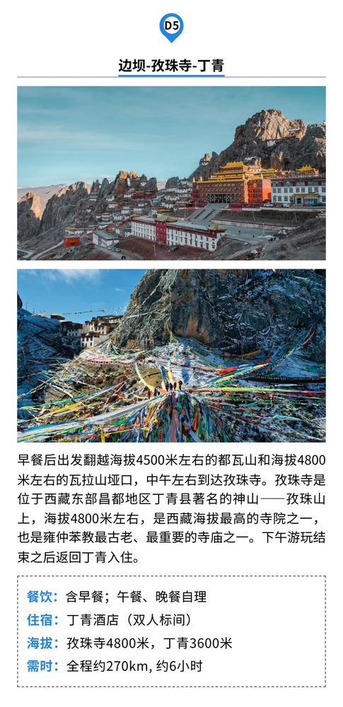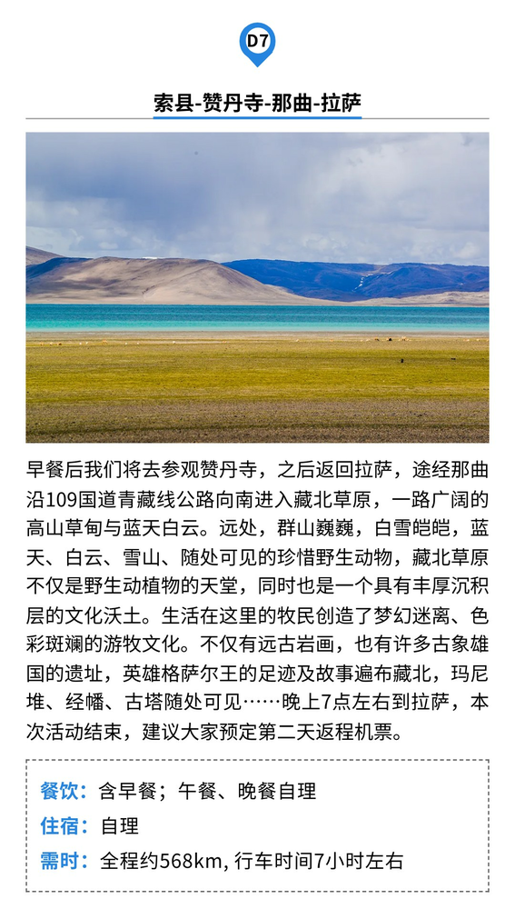 D1拉萨集合 今日全国各地的队友将来到拉萨集合,统一入住我俱乐部安排的酒店。如果您的时间比较宽裕,可以自行安排在拉萨市区的旅游活动,拉萨火车站距市区10公里,可打车到集合酒店。贡嘎机场距拉萨市区65公里,可乘坐机场大巴到拉萨贡嘎机场乘车点民航局门口下车,再打车到集合酒店办理入住,当天尽量少运动,多休息。晚上会统一召开行前见面会,讲解本次活动注意事项。 温馨提示: 1、拉萨机场大巴费用30元(有航班就有班次),打车费用300元左右; 2、如果时间宽裕的话,建议可以提前1-2天抵达拉萨,适应海拔; 3、注意不要剧烈运动,当天请不要洗澡,可多吃蔬菜、水果,多喝水,不能饮酒。一般过1-2天后,以上症状都会逐步减轻或消失。 住宿:拉萨酒店(标间) 餐饮:全天自理 海拔:拉萨约3650米 D2拉萨-羊八井-念青唐古拉山-那曲-比如县 早上酒店用餐后,沿着109国道青藏线公路向北行进,途经中国第一座地热发电站-羊八井,继续前行经过念青唐古拉山观景台(海拔4640米),是观赏念青唐古拉山主峰(海拔7111米)观景点,天气好的话可以看到念青唐古拉山脉雪山群,往后就开始进入藏北草原,一路广阔的高山草甸与蓝天白云。远处,群山巍巍,白雪皑皑,蓝天、白云、雪山、随处可见的珍惜野生动物,藏北草原不仅是野生动植物的天堂,同时也是一个具有丰厚沉积层的文化沃土。生活在这里的牧民创造了梦幻迷离、色彩斑斓的游牧文化。不仅有远古岩画,也有许多古象雄国的遗址,英雄格萨尔王的足迹及故事遍布藏北,玛尼堆、经幡、古塔随处可见……为苍茫的大草原增添了几分神秘的色彩,下午抵达藏北高原的中心——那曲市,这里是最好的虫草产地之一,之后前往茶曲/比如县入住。 餐饮:含早餐;午餐、晚餐自理 住宿:比如县酒店(标间) 海拔:那曲4500米、比如县4000米 需时:全程530km,约8小时 D3比如县-萨普大本营-萨普圣湖-萨普大本营 早餐后,从比如乘车前往萨普景区,抵达后,从景区门口乘坐观光车,前往萨普大本营。萨普神山位于比如县羊秀乡普宗沟境内,千百年来一直矗立于此,周围群山环绕,主峰被尊为当地的神山之王。稍作休息后,我们将沿湖而行,向着冰湖行进,大家可以根据自己的体力情况调整,体力一般可以返回大本营休息。在湖边行走,整个人好像是被启动了慢动作镜头,在水边静坐,看云卷云舒,不自觉的沉入到思考生命中去,这里绝对是思考人生的好地方。下午可以在湖边等候日落,天气好的话晚上还可以看到萨普的灿烂星河。 餐饮:含早餐;午餐、晚餐自理 住宿:板房多人间 海拔:萨普大本营4800米 需时:徒步往返5km,约3小时 注:只有冬季湖面结冰的时候才能徒步冰川,夏季只能到湖边拍摄雪山 D4萨普大本营日出-边坝县-三色湖祥格拉冰川-边坝县/洛隆县 早上可早起观看萨普神山日出,静谧的雪山加上奇妙的光线,随手一拍都是大片。之后回到大本营早餐,早餐后我们驱车前往边坝县城附近的小众景点三色湖,将车开到水泥路的尽头,就会发现一个小众且惊艳的冰川——祥格拉冰川,风景原始且美丽,在此还可以观看三怙主雪山。游玩后晚上入住边坝县城或洛隆县城。 餐饮:全天自理 住宿:边坝/洛隆酒店(标间) 海拔:边坝3700米 需时:全程187km,约5小时,祥格拉冰川徒步往返约5公里 注:夏季冰湖融化,只能到湖边。 D5边坝-孜珠寺-丁青 早餐后出发翻越海拔4500米左右的都瓦山和海拔4800米左右的瓦拉山垭口,中午左右到达孜珠寺。孜珠寺是位于西藏东部昌都地区丁青县著名的神山——孜珠山上,海拔4800米左右,是西藏海拔最高的寺院之一,也是雍仲苯教最古老、最重要的寺庙之一。下午游玩结束之后返回丁青入住。 餐饮:含早餐;午餐、晚餐自理 住宿:丁青酒店(双人标间) 海拔:孜珠寺4800米,丁青3600米 需时:全程约270km, 约6小时 D6丁青-布加雪山冰川-索县 今天我们将前往藏区最著名的苯教圣山——布加雪山。布加雪山坐落在丁青西部,是藏东最高的山峰。这里环境优美,文化历史悠久,有世界著名的格萨尔王国建立的动人传说,有各种国家级保护野生动物,也有名贵药草,更有五条发育完整的巨型悬冰川,是世界最密集悬冰川!其中最长的一条悬冰川从布加雪山峰顶伸到海拔4200多米的冰碛湖,悬冰川落差高度达2100多米,比海螺沟大冰瀑悬冰川垂直高度还高出大约700多米。傍晚驱车前往索县入住。 餐饮:含早餐;午餐、晚餐自理 住宿:索县酒店(双人标间) 海拔:布加雪山下方湖泊约4200米,索县海拔约4000米 需时:全程约320km, 行车5小时左右;坡戈冰川徒步4公里 D7索县-赞丹寺-那曲-拉萨 早餐后我们将去参观赞丹寺,之后返回拉萨,途经那曲沿109国道青藏线公路向南进入藏北草原,一路广阔的高山草甸与蓝天白云。远处,群山巍巍,白雪皑皑,蓝天、白云、雪山、随处可见的珍惜野生动物,藏北草原不仅是野生动植物的天堂,同时也是一个具有丰厚沉积层的文化沃土。生活在这里的牧民创造了梦幻迷离、色彩斑斓的游牧文化。不仅有远古岩画,也有许多古象雄国的遗址,英雄格萨尔王的足迹及故事遍布藏北,玛尼堆、经幡、古塔随处可见……晚上7点左右到拉萨,本次活动结束,建议大家预定第二天返程机票。 餐饮:含早餐;午餐、晚餐自理 住宿:自理 需时:全程约568km, 行车时间7小时左右 特别提醒:如遇天气、交通、景区限流、酒店房间紧张等情况,我司在不减少景点的前提下有权调整景点游览
