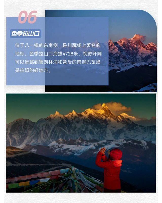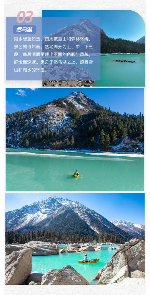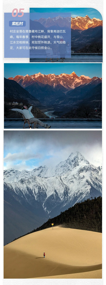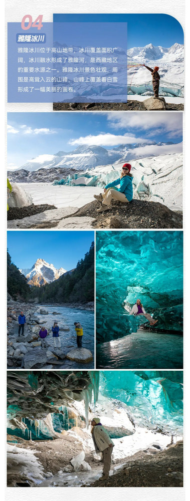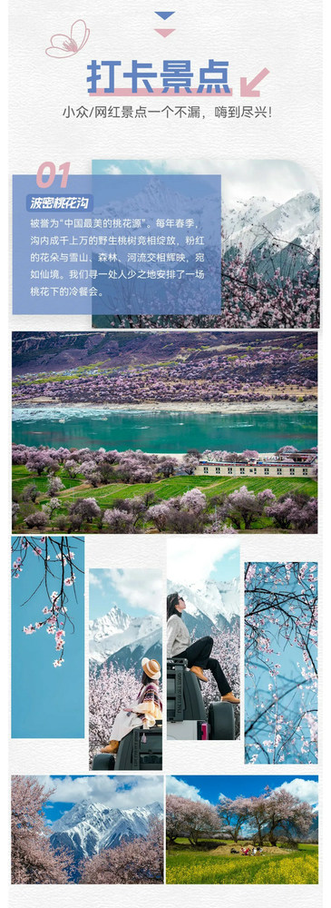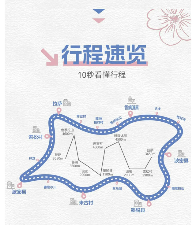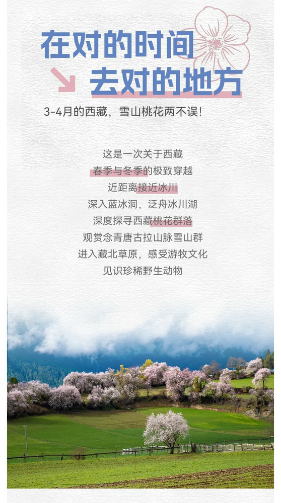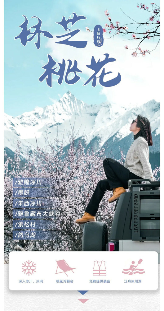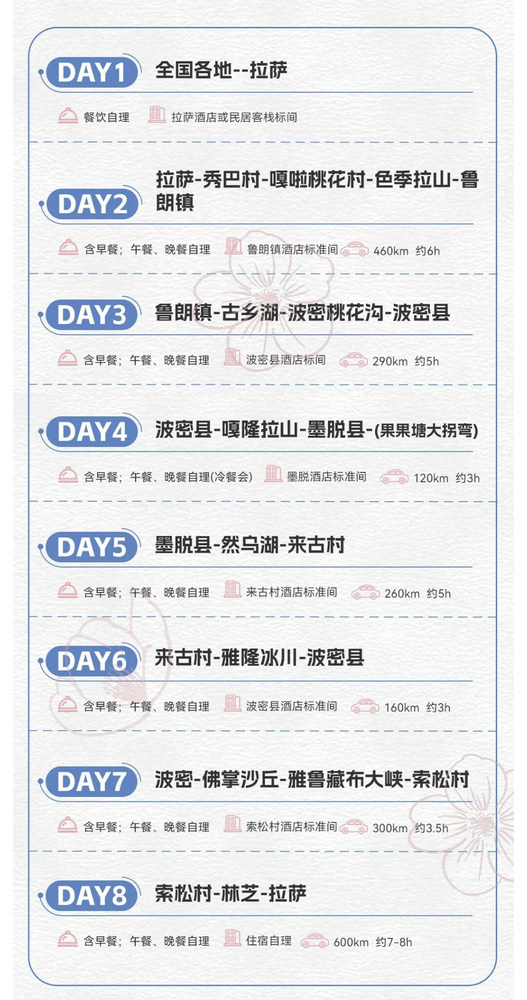 今天是集合日,领队会在圣城拉萨等待各位队员的到来。队员自行根据情况安排大交通到达拉萨,火车站距市区十公里,贡嘎机场距拉萨市区65公里。入住集合酒店后自行活动,当天尽量少运动,多休息,不饮酒。晚上20:30集合,开行程说明会,由领队讲解本次活动注意事项,相互认识,为后面的行程做准备。 用餐:用餐自理,晚上行程说明会 住宿:拉萨酒店或民居客栈标间 PS:注意不要剧烈运动,当天请尽量不要洗澡,可多吃蔬菜、水果、多喝水,不能饮酒。良好的心理素质是克服和战胜高原反应的灵丹妙药。保持豁达乐观的情绪,能够减弱高原反应带来的身体不适。一般过1-2天后,以上症状都会逐步减轻或消失。强烈建议,时间允许的情况下,可以提前一两天到达拉萨适应。特别需要注意的是,高反一般是在踏上高原后3-4小时左右开始出现,所以刚到拉萨时如果没有高反症状也切勿窃喜。 D2拉萨-秀巴村-嘎啦桃花村-色季拉山-鲁朗镇 【行程概述】 早餐后出发,我们由林拉高速前往藏东的江南地带-林芝,你将领略到西藏的景观魅力,从荒芜到森林繁茂,第一站我们前往大隐隐于市的-秀巴村,这里是林芝为数不多的人文景观与自然景观结合地,矗立在桃花林中的千年古碉,看尽了这花开花落的轮回,静待每一位旅人的到来,下午前往嘎啦桃花村,这里是每年林芝桃花节开幕式的会场之一,之后在色季拉山口我们守候一场南迦巴瓦日照金山,观看完日落后我们前往鲁朗镇入住。 用餐:含早;午餐、晚餐自理 住宿:鲁朗镇酒店标准间 海拔:色季拉山口4600米、鲁朗3600米 需时:车程460km,约6小时 注:春季色季拉山有降雪断道风险,若天气恶劣领队可依据实际情况调整本日行程。 备选方案:拉萨-林芝入住;第二日林芝再前往桃花沟等地游玩。 D3鲁朗镇-古乡湖-波密桃花沟-波密县 【行程概述】 早餐后出发乘车前往古乡,3月4月的古乡与鲁朗镇有着天壤之别,早晨的雪域景观很快就被沿途粉的、绿的所替代,行驶在桃花遍布的国道318,让人不禁感叹:原来江南不顾如此。中午时分进入波密桃花沟,这里是世界最大的桃花群落,无数的隐蔽村落等着我们前往,雪山与桃花的交相辉映,在此刻得到升华。中午我们寻一处人少之地安排了一场桃花下的冷餐会,下午从桃花沟出发前往又一处冰天雪地-然乌湖。 餐饮:含早餐;午餐、晚餐自理(今日赠送一场冷餐会) 住宿:然乌镇酒店标间 海拔:然乌镇3900米 需时:全程290km,行车约5小时 D4波密县-嘎隆拉山-墨脱县-(果果塘大拐弯) 【行程概述】 早餐后我们从波密县沿扎墨公路出发,前往中国最后一个通公路的县城,在嘎隆拉山感受雪域高原带来的严寒,之后穿越隧道一路下行,从雪域高原到亚热带环境仅仅就在一瞬之间,一面是冷峻、连绵不绝的冰川雪峰,一面则是鲜花遍野的人间天堂。, 然后途经果果塘大拐弯,看雅鲁藏布大峡谷的壮阔,之后前往墨脱县入住,这里是西藏高原海拔Z低,环境Z好的地方,也是西藏Z温和,雨量充沛,生态保存Z完好的地方。 用餐:含早;午餐、晚餐自理 住宿:墨脱县酒店标准间 海拔:墨脱县1100米 需时:全程120km,行车约3小时 D5墨脱县-然乌湖-来古村 【行程概述】 早餐后墨脱出发,一路欣赏墨脱的美丽风光,天气好的话还能看到云海,之后穿越原始森林向着波密行进,一路上体验从热带雨林到雪山的大自然风景的神奇变化,感受在路上的风光,后到然乌湖游玩泛舟。下午时分前往来古村入住,体验不同于往日的冰雪世界。 用餐:含早;午餐、晚餐自理 住宿:来古村酒店标准间 海拔:来古村4000米 需时:全程260km,行车约5小时 D6来古村-雅隆冰川-波密县 【行程概述】 早晨可在来古村观赏雄伟的岗日嘎布日照金山,早餐后我们从村内前往雅隆冰川探寻蓝冰洞,在巨大的冰盖上行走,周围时不时会蹦出几处蓝色湖泊,冰川融水犹如外星人的血液注入其中,穿行其间犹如极地体验。在巨大的冰山、冰块、冰洞中尽情畅玩一天后返回波密县入住。 用餐:含早;午餐、晚餐自理 住宿:波密县酒店标准间 海拔:波密县2700米、雅隆冰川4500米 需时:车程160km,约3小时 D7波密-佛掌沙丘-雅鲁藏布大峡-索松村 【行程概述】 早餐后沿国道318,经通麦大桥、鲁朗小镇,翻越色季拉山,我们将深入雅鲁藏布大峡谷内的索松村,中途会经过一处因风聚集的沙漠,当地称为:佛掌沙丘,虽然不大,但却能实现雪山+沙漠同框的罕见景象。下午时分到达索松村,这里是拍南迦巴瓦峰的jue佳位置,大家可尽情地拍摄南迦巴瓦。冬天气较稳定,大家可在此守候日照金山。 用餐:含早;午餐、晚餐自理 住宿:索松村酒店标准间 海拔:索松村2900米 需时:全程200km,行车约3.5小时 D8索松村-林芝-拉萨 【行程概述】 早餐后出发,全天返程,离开塞上江南返回日光之城拉萨,当天返程的队员可订20:00以后的机票。 用餐:含早餐,午、晚餐自理 住宿:自理 需时:车程600km,约7-8小时 温馨提示:如果时间允许,建议返回拉萨休息一晚再返程。 费用相关 【费用包含】 1、交通:越野车出行,一车4人; 2、住宿:行程所列7晚住宿; 3、餐饮:行程中所列餐食,包含7早餐(领队就餐随客人);赠送桃花沟冷餐会(餐标40元/人); 4、领队:此行程领队兼司机; 5、门票:雅隆冰川门票+中转车;雅鲁藏布大峡谷门票;果果塘大拐弯观光车; 6、保险:活动期间户外高原组合意外保险80万; 7、装备:提供使用冰爪、头盔、救生衣、登山杖、背包船(一车配备一艘); 8、保
