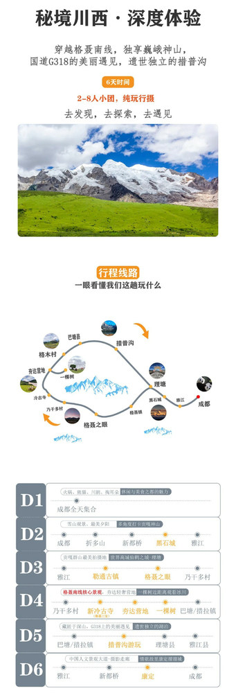 全年组队32期,D1为成都集合日期,次日(D2)正式出发,集合日成都当晚住宿酒店由我们安排。节假日略有调整。
