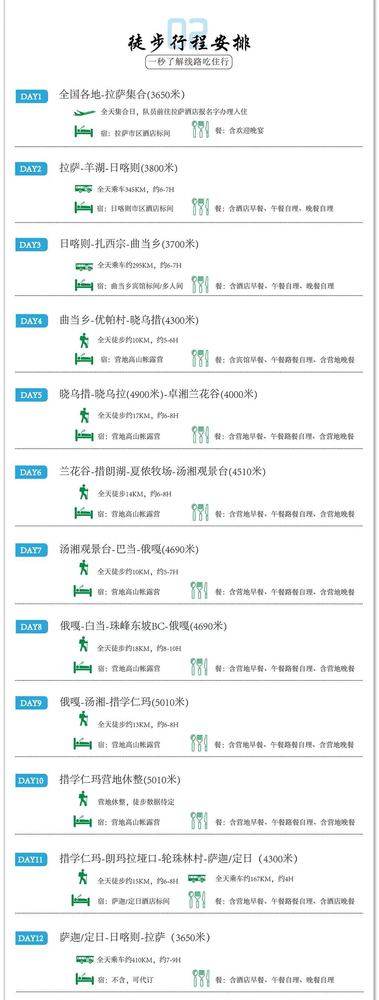 2025全年排期,6人起发,团队欢迎定制 第01期:2025年04月30日-05月11日(五一节) 第02期:2025年05月17日-05月28日(山花季) 第03期:2025年05月31日-06月11日(端午节) 第04期:2025年06月14日-06月25日(山花季) 第05期:2025年07月12日-07月23日 第06期:2025年08月16日-08月27日 第07期:2025年09月13日-09月24日 第08期:2025年09月27日-10月08日(国庆节) 第09期:2025年09月30日-10月11日(国庆节) 第10期:2025年10月11日-10月22日 全年执行价:常规团期;10580元/人,国庆节10980元/人 在世界最高峰下徒步,珠峰东坡徒步路线毫无疑问是一条经典的户外徒步线路,被誉为“世界十大景观”之一、“世界十大经典徒步线路”之一。每年都有一些国外的摄影师和驴友想尽办法办手续都要到珠峰东坡来徒步拍摄。沿途可以欣赏到众多六、七千米的雪山,同时可以欣赏到珠峰(世界第一)、洛子峰(世界第四)、马卡鲁峰(世界第五)。这个地区的特点主要是海拔高(平均海拔在4000m以上),雪山融水形成湖泊众多,天气好时能近距离欣赏雪山的震撼之美。珠峰东坡线路上人迹罕至,生态原始,水源丰富,珍稀动植物时有所见,星星点点的高山湖泊如宝石般散布,加之嘎玛沟沟谷幽深,景色非常之迷人。除了嘎玛沟之外,我们还要经过兰花谷、穷卓谷,夏季是观赏高山杜鹃的绝佳之地,秋天则是户外摄影的不二之选。我们的活动安排13天,其中车程3-4天,徒步8-9天,每天5~8小时,大约9~15公里,中上难度,有一定高海拔徒步露营经验者都可完成。5月6月初和9月底最佳,7月8月为雨季,山峰经常被云雾所遮挡,但难得的云海景观这时候才有,5月底6月初除了观看壮美的雪山也是观赏高山杜鹃盛开的季节,9月底雨季过了,天气清澈透蓝,是拍摄雪山的最佳时间。 【线路亮点】 1、这是一次世界顶级徒步圆梦之旅,这里与世隔绝,远离城市的喧嚣,珍稀野生动植物繁多,高原湖泊星罗棋布,风景非震撼两字能形容......2、这条带有探险性质的高海拔深度行摄线路,可以近距离欣赏我国喜马拉雅核心地带的世界第一高峰-珠峰、世界第四的洛子峰、世界第五的马卡鲁以及全景都在中国境内的第二高山峰珠穆朗卓等世界级雪山带来的震撼之美,人迹罕至,恍若梦中的香格里拉。3、我们有一天两夜的时间在措学仁玛停留,可尽情拍摄雪山、倒影以及星空。4、本次活动由专业户外领队+当地藏族向导全程服务。5、本线路统一提供露营高山帐(2人一顶)+蛋槽防潮垫。提供卫星电话、急救包、急救钢瓶氧气等公用装备。6、全程提供桌椅板凳,以及餐厅帐和炊事帐篷,每天都可以在营地坐着享受营地生活。7、全程轻装徒步、无需负重,提供早晚丰富营地餐+营地水果、饮料,吃饱才有力气徒步。8、全程提供户外电源,晚上提供手机,相机,无人机充电。9、自营产品,品质保障。 行程安排 D1:拉萨集合(海拔3665米) 今天为集合日,晚上8点领队将在集合酒店给大家开行前说明会。建议提前2-3天到达拉萨适应、调整状态。提前到达的队员可以去大昭寺、八廓街、布达拉宫等市内景点逛逛。 住宿:拉萨4星级酒店标间 用餐:含晚餐欢迎晚宴 D2:拉萨-羊湖-日喀则(海拔3800米) 早上8点左右酒店集合出发,乘车前往日喀则。经羊湖,宁金抗沙雪山 ,卡若拉冰川、满拉水库、远观江孜古堡后经年楚河谷地来到后藏首府日喀则。时间允许还可以前往扎什伦布寺游玩,今天也以适应为主。 住宿:日喀则酒店标间 用餐:含早餐,中晚自理AA D3:日喀则-扎西宗-曲当乡(3700米) 酒店早饭后出发,途中翻越加乌拉垭口(5200米),在加乌拉山上能看到5座8000米以上的山峰(珠峰(第一)、洛子峰(第四)、马卡鲁峰(第五)、卓奥友峰(第六)、希夏邦马峰(第十四)。进入珠峰自然保护区,下午到达曲当乡。 住宿:曲当乡多人间 用餐:含早餐,中晚自理AA D4:曲当乡-优帕村-晓乌措(4300米) (徒步第1天)早上我们乘车前往徒步起点优帕村,从优帕村开始徒步,一路缓坡上行。飘荡在山间的云雾和刺眼的阳光,至晓乌拉垭口下的晓乌措湖畔露营。期间大约有三个比较大的爬升,整个行程用时约6个小时。晓乌错是晓乌拉垭口下的一个高山湖泊,这里天气好的情况下,可以看到马卡鲁峰和珠穆郎卓峰。 徒步数据:徒步约5小时,约10km,上升900m 住宿:帐篷露营 用餐:营地早晚餐、路粮午餐 D5:晓乌措-晓乌拉(4900米)-卓湘兰花谷(4000米) (徒步第2天)早起用餐,天气好的话我们将看到马卡鲁和珠穆郎卓的日照金山以及它们在晓乌错的倒影!此处是整个行程中观看马卡鲁峰的最佳地点之一。中午翻越晓乌拉垭口(4900米),陡坡下降到嘎玛沟的起点卓湘(4030米)山谷地带。一路感受植被的变化。下午沿谷行走,抵达营地兰花谷(兰花谷是通往珠峰东坡和嘎玛沟的分路点)。 徒步数据:徒步约7-9小时,约17km,上升350m/下降900m 住宿:帐篷露营 用餐:营地早晚餐、路粮午餐 D6:兰花谷-措朗湖-夏侬牧场-汤湘观景台(4510米) (徒步第3天)从兰花谷沿原始森林上行,植被垂直分布状态明显,到达山脊后可俯瞰嘎玛沟全貌,如果有缘更可以邂逅马卡鲁峰(8463米)。中午到达雪山怀抱的措朗湖。湖水经过一个泄水口注入嘎玛沟内,措郎山谷两端雪山相映。午后翻过一个垭口就到达了野花灿烂的夏侬牧场,然后一路都比较平坦,一直到达今天的营地汤湘观景台营地。 徒步数据:徒步约7-8小时,约14km,上升550m 住宿:帐篷露营 用餐:营地早晚餐、路粮午餐 D7:汤湘观景台-巴当-俄嘎(4690米) (徒步第4天)汤湘营地