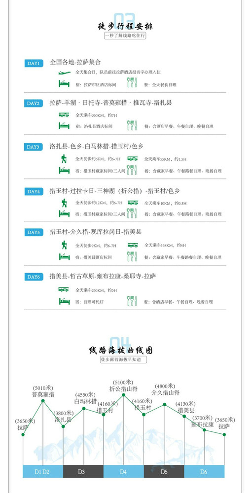 D1:拉萨集合 今天是集合日,各地的队员自行根据情况安排大交通到达拉萨,入住俱乐部安排的酒店。拉萨火车站距市区十公里,可打车至酒店,贡嘎机场距拉萨市区65公里,可乘坐机场大巴至终点站民航局下车,再打车到集合酒店办理入住。后自行活动,当天尽量少运动,多休息,适应海拔,下午开行前会。 住宿:拉萨四钻酒店标间 餐食:全天自理 行车:0km 海拔:拉萨市区3650米 PS:注意不要剧烈运动,当天请尽量不要洗澡,可多吃蔬菜、水果、多喝水,不能饮酒,多适应海拔。 D2:拉萨-羊卓雍措日托寺-普莫雍措·推瓦寺-洛扎县 早餐后前往西藏三大圣湖之一的羊卓雍措,或许你去过无数次羊卓雍错,却不知在它的北岸还藏着一座孤独的寺庙。三面环湖,在寺庙观羊湖最为震撼,黄墙红顶的寺庙,也在蓝天碧水衬托下更为明媚。游玩后走羊湖东岸前往普莫雍措,公路的尽头是一片蓝色的湖,依山傍湖的推瓦寺,俯瞰普莫雍措。感受高原净土的宁静与神圣,庄严而神秘。后前往洛扎县酒店住宿。 住宿:洛扎县酒店标间 餐食:含早餐,午餐 晚餐自理 行车:360km 约7h 海拔:日托寺4500米、普莫雍错5010米、洛扎3800米 D3:洛扎县-色乡-白马林措-措玉村/色乡 酒店早餐后出发,乘车经色乡后抵达白玛林措停车场,收拾背包装上当天的路餐和备用衣物,开始我们的库拉岗日雪山徒步之旅。今天的徒步比较简单,沿着白马林措右侧一直前行到湖的尽头白马林寺,探访莲花生大师的修行地,眺望卡热疆雪山,之后原路返回。白马林措湖颜色因深浅不同与其周边的景色融汇后呈现出蓝、绿、白三种颜色 ,据说信徒们可以从这湖底窥见自己的今生来世。傍晚回到措玉村或者色乡入住。 住宿:措玉村/色乡藏家标间/多人间 餐食:含早餐,路餐自理 晚餐自理 行车:55km 约1.5h 徒步:徒步约6km、游玩6-7h; 海拔:白马林措4550米、措玉村4160米; PS:还没有适应海拔的队员可选择在湖边游玩不上山脊徒步,节假日措玉村如有住宿不足的情况,协调至色乡住宿,车程约20分钟。 D4:措玉村-过拉卡日-三神湖(折公措)-措玉村/色乡 早餐后乘车至停车场,沿着白马林措右侧山谷,一路爬升前往过拉卡日下面的三个圣湖,我们要从4500爬升到5100的海拔,站在高处,三神湖和雄伟的过拉卡日就在我们的面前,雄伟壮丽,这也是我们本次行程的亮点,之后返回措玉村。今天爬坡为主,海拔较高,个人量力而行,能走多远是多远,随时可下撤,随处是风景。晚上返回措玉村或色乡入住。 住宿:措玉村/色乡藏家标间/多人间 餐食:含早餐,路餐自理 晚餐自理 行车:10km 约0.5h 徒步:徒步约12km、游玩6-7h; 海拔:三神湖山脊最高点5100米; ps:今日徒步约12公里,7小时左右,由于海拔高,大家量力而行即可,如果感到不支,可在原地休息欣赏风景,也可先行返回到停车场。节假日措玉村如有住宿不足的情况,协调至色乡住宿,车程约20分钟。 D5:措玉村-介久措-观库拉岗日-措美县 早餐后乘车至达白玛林停车场,沿着山坡爬到山脊处,即可到达一个观景台,美丽的圣湖介久措就在你的眼前,天气好的话巨大的库拉岗日和卡日疆雪山展现在你的面前。体力好的可以往湖边或者山脊高处走走。之后返回停车场,乘车前往措美县酒店入住。 住宿:措美县酒店标间 餐食:含早餐,路餐自理 晚餐自理 行车:168km 约4h 徒步:徒步约9km、游玩6-7h; 海拔:介久措山脊4800米、措美县4130米; D6:措美-哲古草原-雍布拉康/桑耶寺-拉萨 早餐后乘车返程回拉萨,沿着219国道来到哲古措草原,这里有众多野生动物,如:藏野驴、藏原羚等。之后游玩西藏历史上第一座宫殿-雍布拉康或桑耶寺,如有当日航班返程的队员,我们将走贡嘎机场方向回到拉萨集合酒店解散,结束本次雪山徒步活动,建议定晚上8:00左右的返程航班。 住宿:自理(可代订) 餐食:含早餐,午餐 晚餐自理 行车:260km 约5h 海拔:雍布拉康3700米、桑耶寺3580米 全年排39期,团队可定制时间出团; 第01期:2025年02月15日-02月20日 第02期:2025年02月22日-02月27日 第03期:2025年03月01日-03月06日 第04期:2025年03月08日-03月13日 第05期:2025年03月15日-03月20日 第06期:2025年03月22日-03月27日 第07期:2025年03月29日-04月03日 第08期:2025年04月04日-04月09日(清明节) 第09期:2025年04月12日-04月17日 第10期:2025年04月19日-04月24日 第11期:2025年04月26日-05月01日 第12期:2025年04月30日-05月05日(五一节) 第13期:2025年05月01日-05月06日(五一节) 第14期:2025年05月10日-05月15日 第15期:2025年05月17日-05月22日 第16期:2025年05月24日-05月29日 第17期:2025年05月31日-06月05日(端午节) 第18期:2025年06月07日-06月12日 第19期:2025年06月14日-06月19日 第20期:2025年06月21日-06月26日 第21期:2025年06月28日-07月03日 第22期:2025年07月05日-07月10日 第23期:2025年07月12日-07月17日 第24期:2025年07月19日-07月24日 第25期:2025年07月26日-07月31日 第26期:2025年08月02日-08月07日 第27期:2025年08月09日-08月14日 第28期:2025年08月16日-08月21日 第29期:2025年08月23日-08月28日 第30期:2025年08月30日-09月04日 第31期:2025年09月06日-09月11日 第32期:2025年09月13日-09月18日 第33期:2025年09月20日-09月25日 第34期:2025年09月29日-10月04日(国庆节) 第35期:2025年09月30日-10月05日(国庆节) 第36期:2025年10月01日-10月06日(国庆节) 第37期:2025年10月11日-10月16日 第38期:2025年10月18日-10月23日 第39期:2025年10月25日-10月30日 常规排期:3980元/人;春节国庆价格:4580元/人; 【费用包含】 1、住宿:行程所列5晚住宿(3晚酒