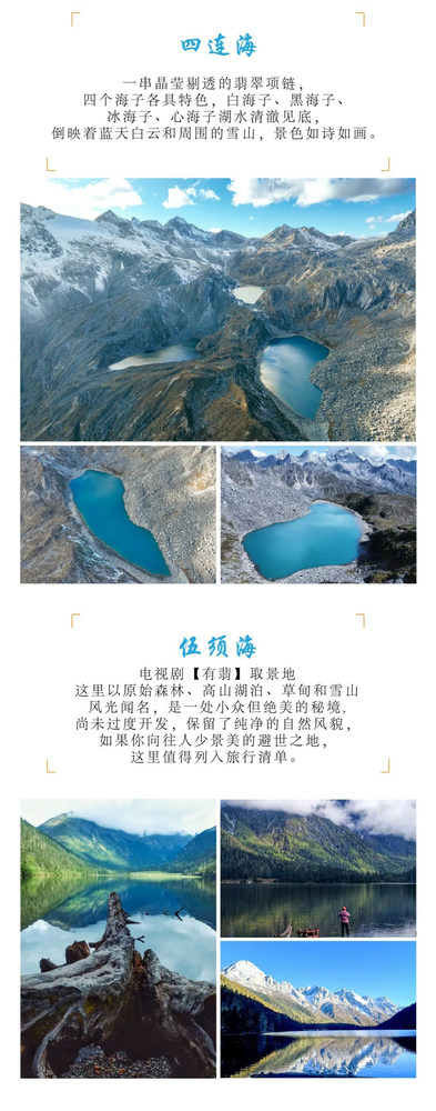海拔:莲花湖村约3250米,月亮湖约3600米,温泉坡约3700米,莲花湖营地约4100米,