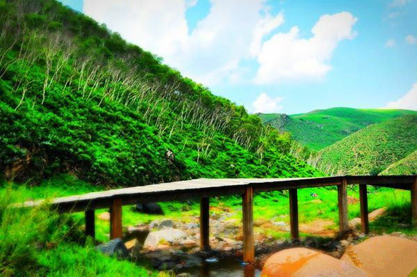 黄花沟五千余亩的独贵林区,森林茂密,古柏参天,那林间富有弹性的绿色草坪上,白蘑菇、黄花,百合花点缀其间,这更为大自然增添了美丽的色彩。春画、奇观、森林与奇花、异草组成了天然大花园。