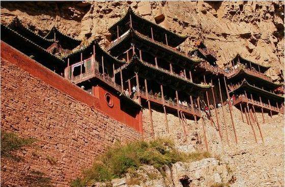 恒宗大殿,那是北岳主庙。这座依傍在半山削壁上的大殿,是恒山主峰现存的20座寺庙中规模最大的。始建于北魏大武年间(424~451年),后经历代修葺,到明代弘治年间(1488~1505年)才改为寝宫。 大殿脚下是一座崇高的山门。山门两侧有青龙、白虎二殿。跨进山门,劈面便是坡度为60度的103层石阶。我屏足了劲,一股足气爬了上去,举目仰望,石阶漫漫,殿身巍巍:上方峭壁上,一株古松凌空倒挂,九曲盘亘,气势宏大。进入大殿看到,正中神龛里端然高坐着的是头戴天平冠,身披朱绫袍的北岳大帝。神座上方,悬挂着康熙皇帝手书的御匾:“化垂悠久”。殿内香烟缭绕,钟磐幽鸣,给人清静超脱之感。步出大殿,殿前有数十面石碑、 牌匾,其中,元代铁铸菱形“云牌”,为人们一致称道,堪为恒山文物之珍。我在山上呆的时间不长,顺路还看了九天宫、纯阳宫、关帝庙、十王殿等景点。
