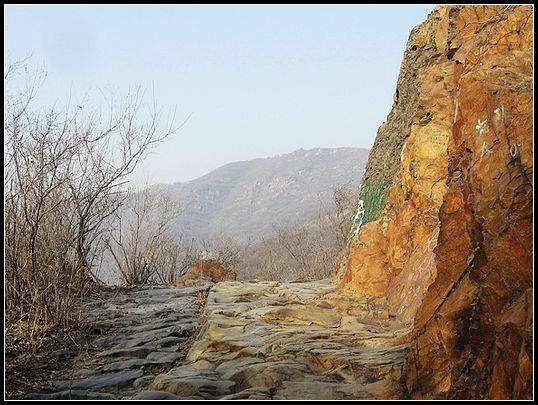 沿着荒草丛生的古道穿城洞而过,路几乎被灌木掩盖,向前钻出灌木丛,一片壮观的“蹄窝”赫然在拐弯处呈现,这就是期盼中的京西古道最壮观的路段。虽然已经在照片中看过了很多次,但真正走进它还是忍不住惊呼。薄雾笼罩下的古道透着一丝神秘,静静地诉说着历史的厚重与沧桑。沿山凿出来的石路被磨的很是平滑,泛着细腻柔和的光泽,很难想象这光滑的路面和旁边粗糙的山体居然是同一种石材。