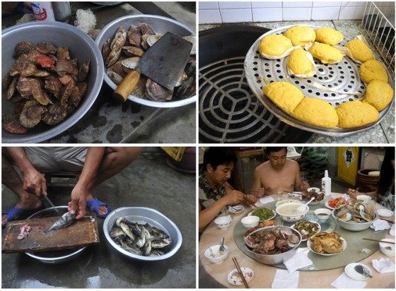 由于砣矶岛是个名副其实的渔岛,每隔一会儿就有渔船靠岸,所以这里的每道菜都有海鲜。我们曾给女主人提意见,要求吃点非海鲜的东西,于是女主人给我们做了一大盆面条,想不到用筷子一搅,竟然从面条下面搅出4条鱼来。我们再提意见,房东总算大发善心,给做了一道蒜薹炒肉丝,我们迫不及待地塞到嘴里,哇塞,怎么蒜薹也一股腥味——他们竟然是用虾来炝锅炒菜的。