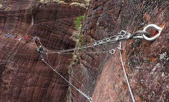 飞拉达(Via Ferrata)是意大利语,意为铁索栈道。指的是修建在岩壁上、利用铁索、脚蹬的辅助,进行峭壁攀爬的登山方式。最初起源于意大利,在一战时期的阿尔卑斯山区用于运送军用物资。上世纪八十年代后开始作为一项户外运动在欧洲开始流行起来。 飞拉达线路的特点:保留了野外攀岩的惊险刺激,达到锻炼体能(更多的是臂力)和意志(很重要,第一关差点放弃)的目的,同时大大降低了对攀爬着的专业技术要求,在安全(不必担心)有充分保障的前提下,普通人也能驰骋悬崖。