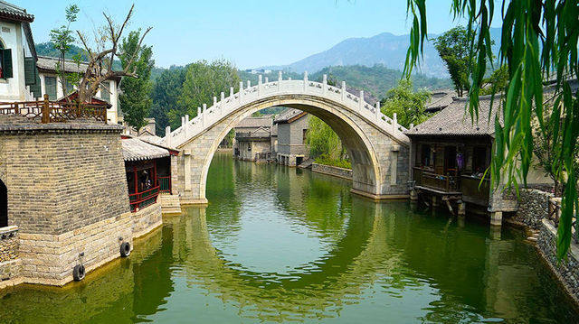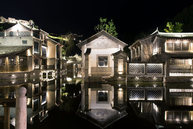 水镇内河道密布,古老的汤河支流萦绕其间,古建、民宅依水而建,在清新空气、蓝天白云、绿水波涛、参天白杨的掩映之下,宛如一片鲜为人知的世外桃源。夜幕降临,精心规划的古镇泛光夜景超凡脱俗,冷峻中透出丝丝温馨,不论是构思的精巧还是气势宏大,都堪称国内首屈一指,是不容错过的美景。