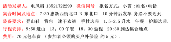 我是電風扇,我声明: 这是一个非营利性活动,欢迎大家监督并在活动归来进行点评,如果大部分参与者认为这是一个含商业性活动,我将信守承诺3个月之内或永久不在517发布活动。 大家可以看看我发起过的活动以及大家的评价,点此查看。