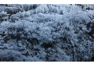 冬天的云瀑沟,溪流和水瀑凝结成了巨大的冰柱,晶莹的冰帘以及千姿百态的冰幔冰挂,好似一派璀璨耀眼的冰晶世界,凝结的晶莹剔透的冰川,银光闪烁,空濛中挂着剔透发亮的冰凌山洞,挺立着透明的冰塔、冰笋、冰菇。